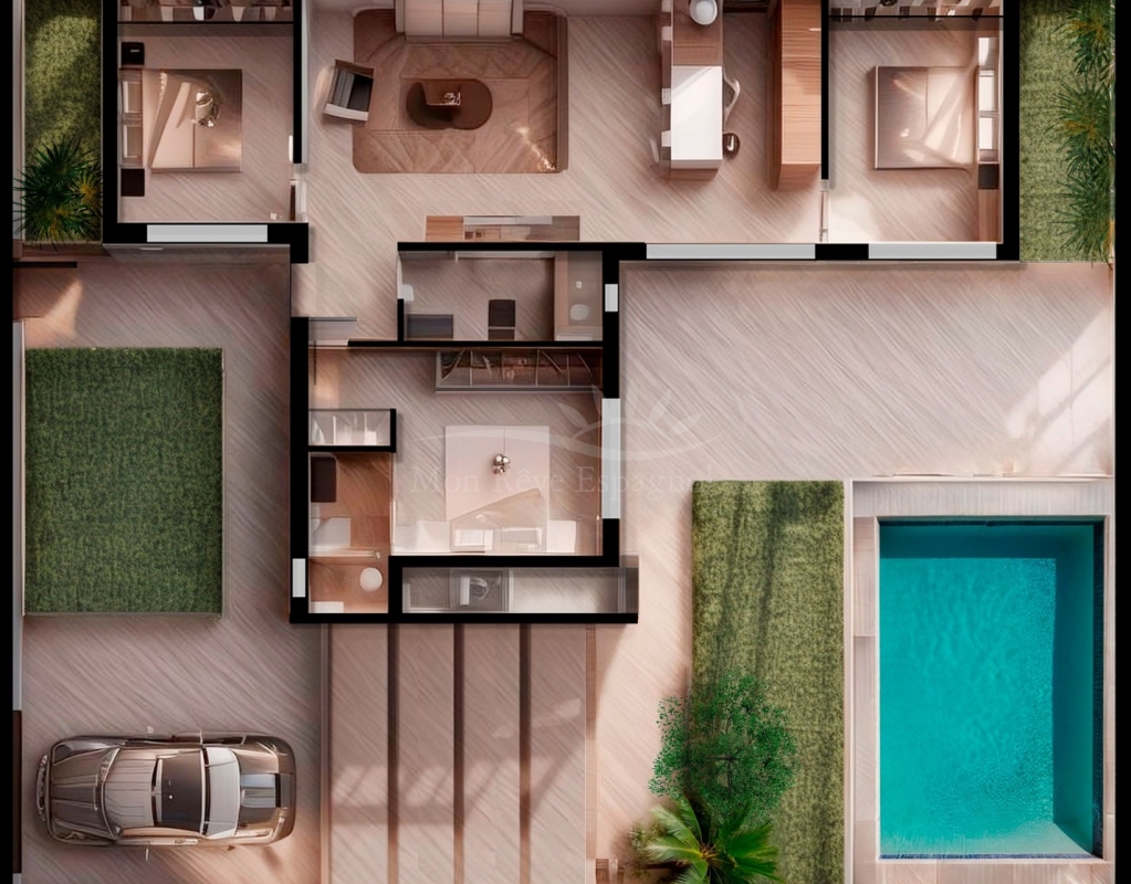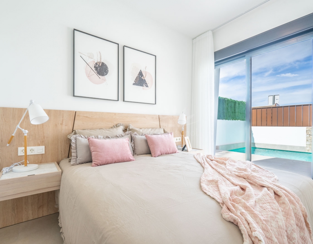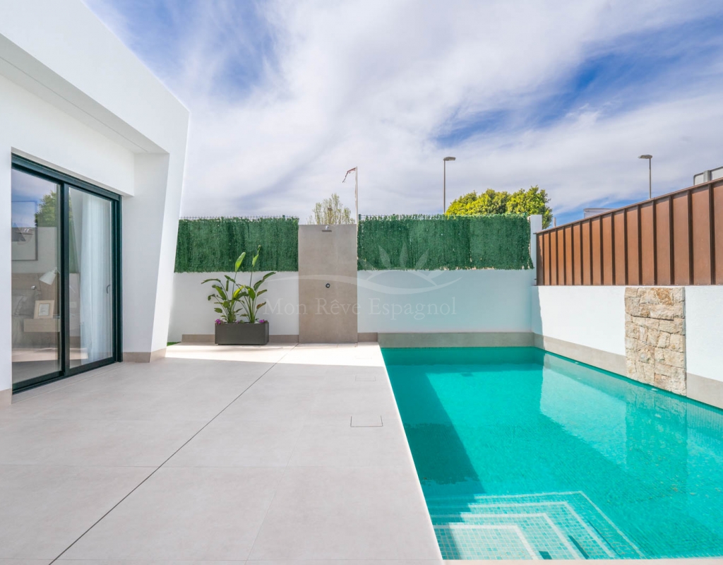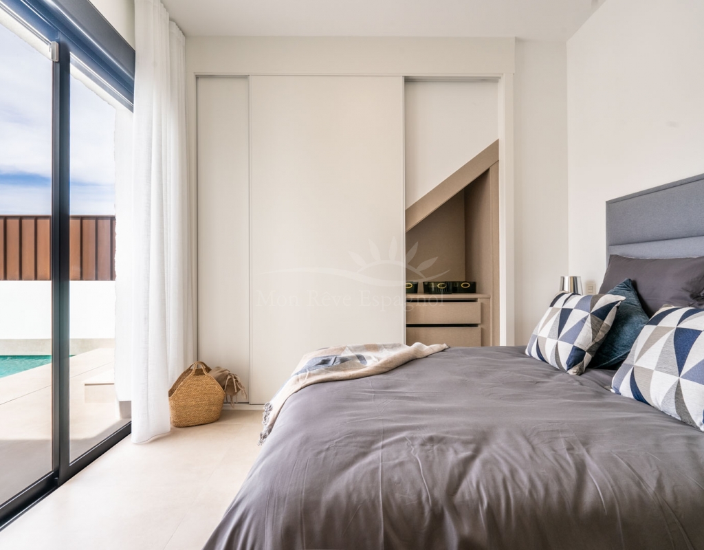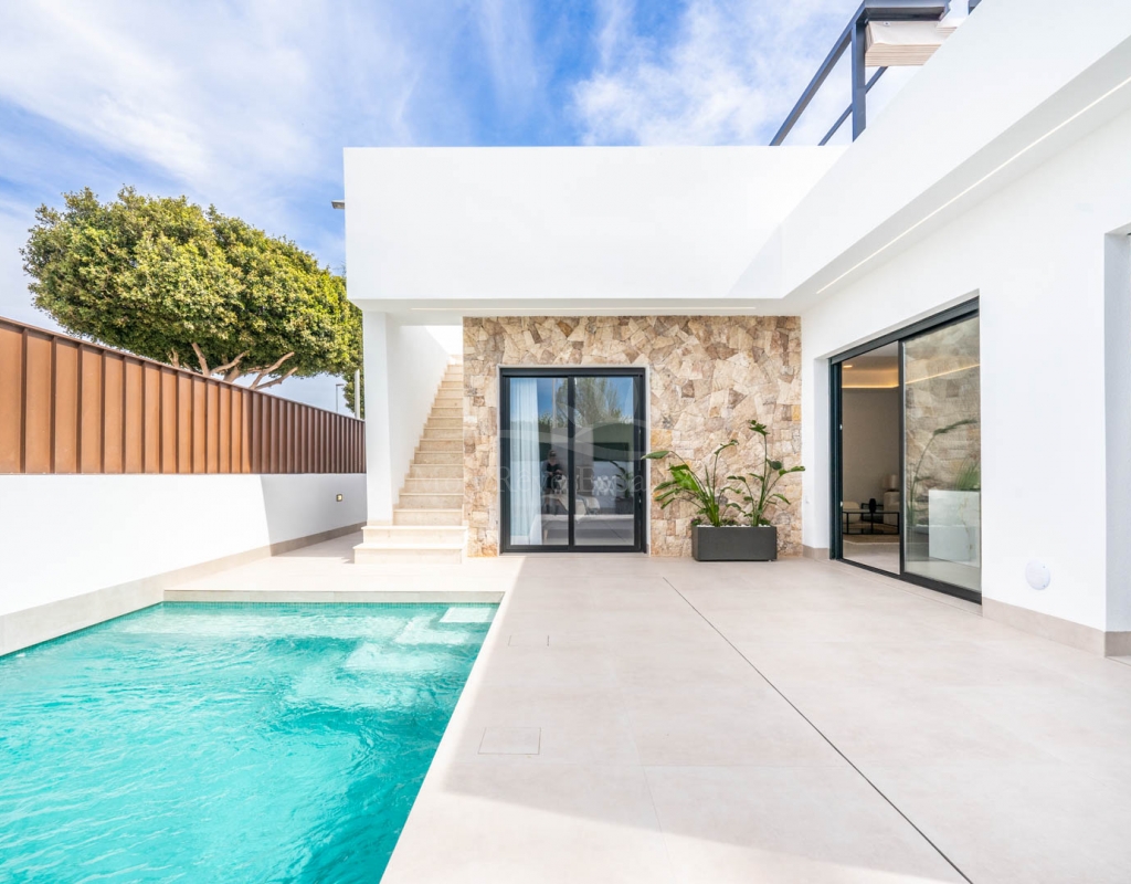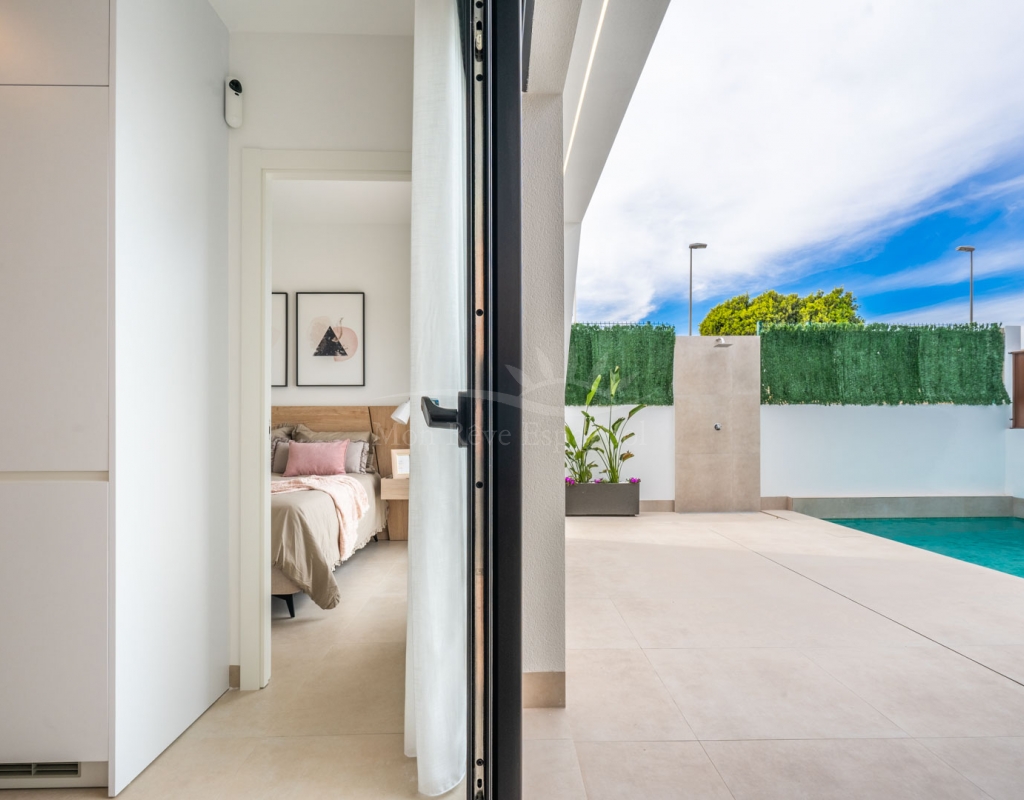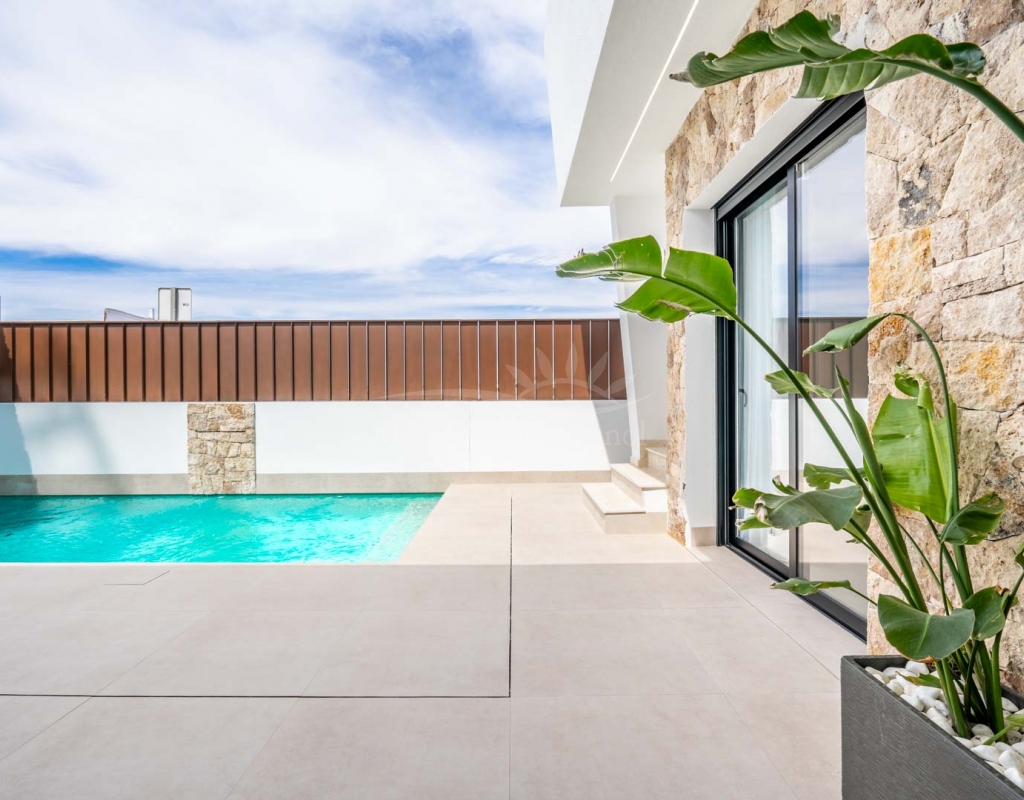 3 bedrooms (master bedroom en-suite) and separate family bathroom… designed with a contemporary 'eco' style and open plan concept, comprising a fitted kitchen and lounge-dining room, a storage room to the front and a private summer patio area. The villas are equipped with a rear private swimming pool with outdoor shower, solarium, terrace areas, fully fitted kitchen and bathrooms with led mirror, lined wardrobes with drawers, interior/exterior lighting, pre installed air-conditioning. Feature angled walls and stone cladding to the front and stairwell, really makes this villa pop with style.