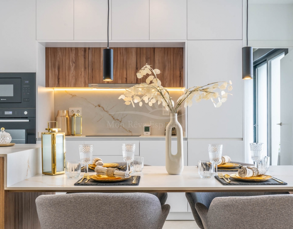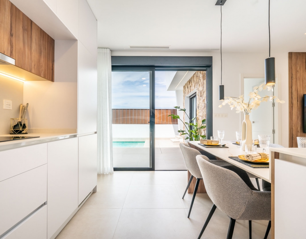 The villas are designed on one level with elevated ceiling to the kitchen area, each villa boasts wrap around terrace / sun zones on the ground floor and a large private solarium on the first floor to enjoy hours of sunshine, all year round.