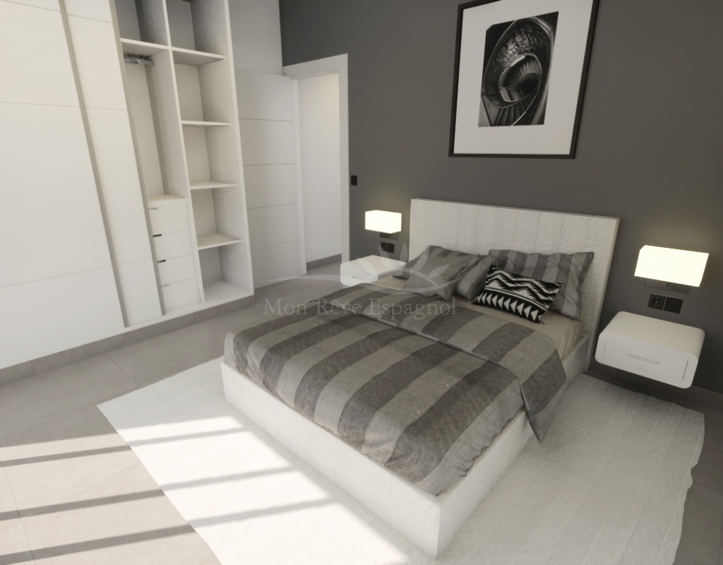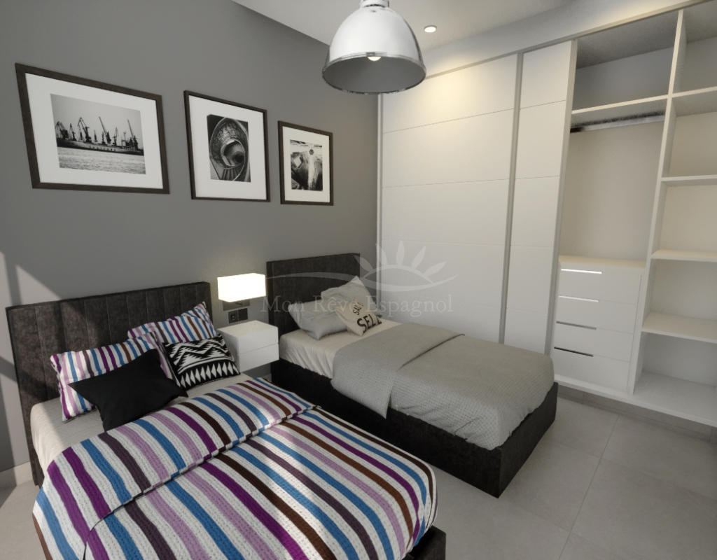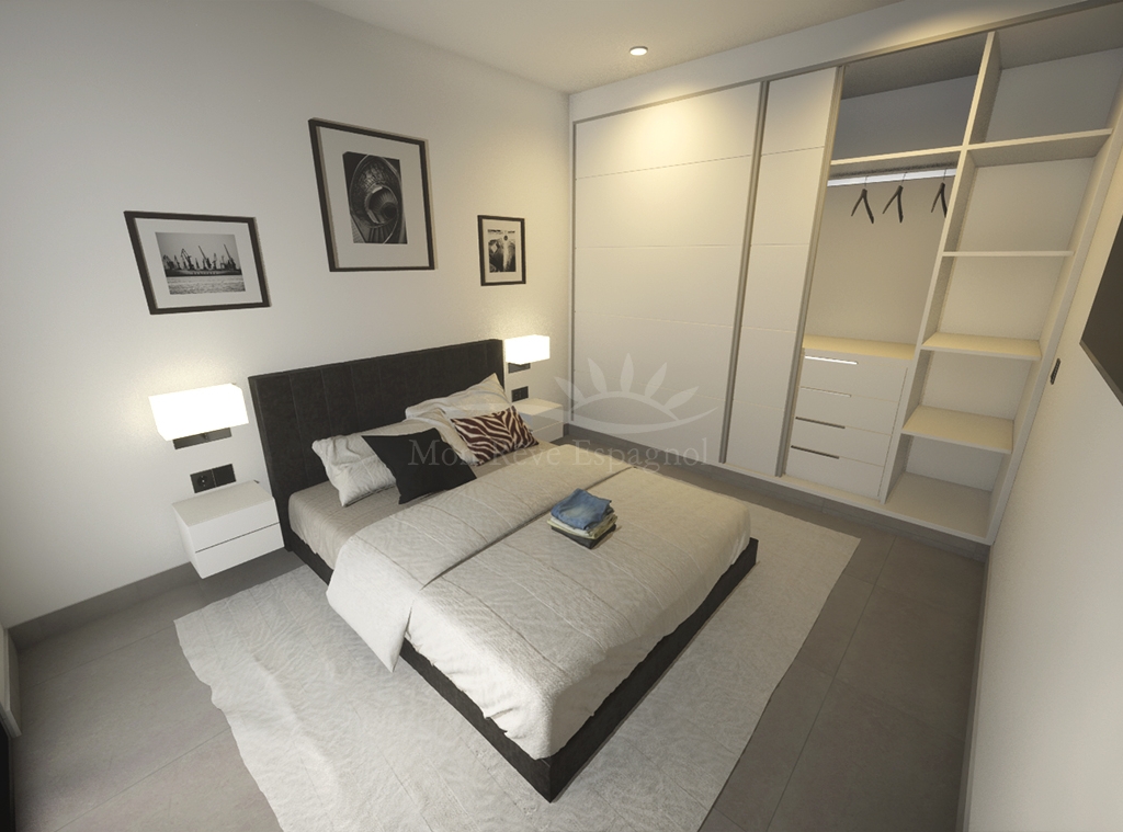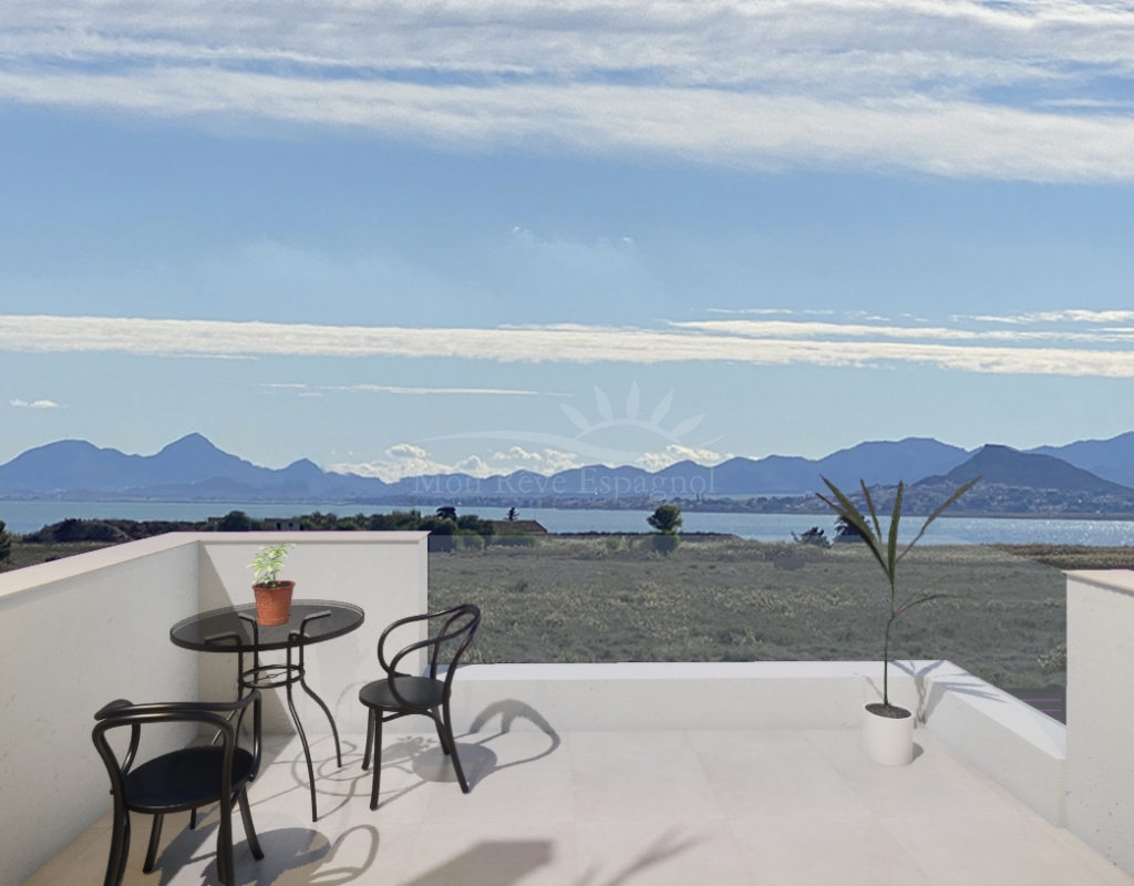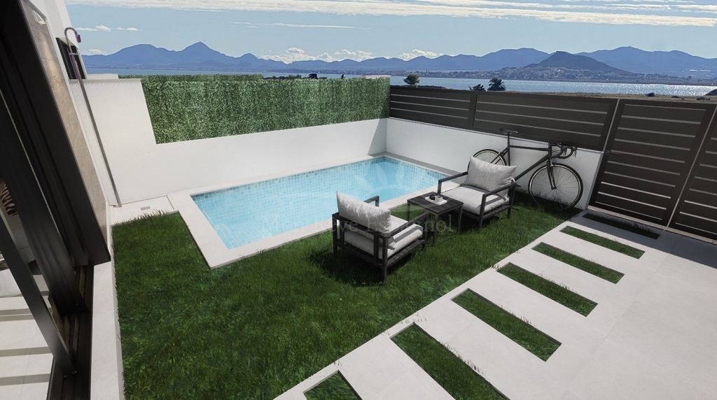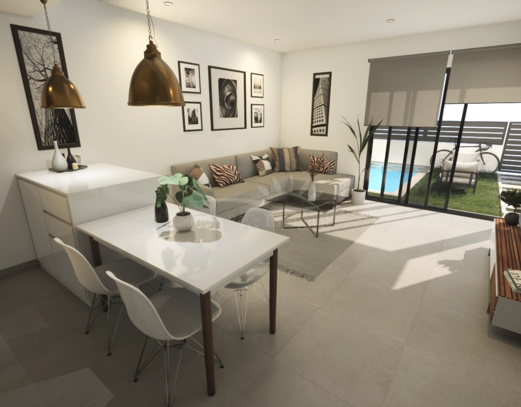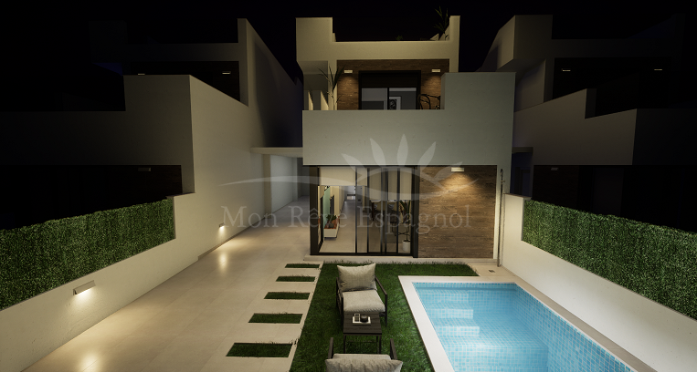 400M from the beach, Residencial Olivo Del Mar I is a complex of 10 villas with private pool as well as a covered garage for each property. These villas are duplex style with terraces on the ground floor, first and second floor with different orientations, allowing you to enjoy all the hours of sunshine every day of the year. Each property has 3 bedrooms and 2 bathrooms. They are composed on the ground floor: 1 living-dining room with open kitchen, 1 double bedroom and 1 shower room. Upstairs there are 2 double bedrooms, 1 shower room, 1 terrace and access to the 40m2 roof terrace. The complex is located in Los Alcázares (Murcia), 400 meters from the sandy beaches and 30 minutes drive from Murcia airport. It is also surrounded by all services, sports facilities and close to several golf courses such as Roda Golf, La Serena Golf, Mar Menor Golf and many more. The properties will meet the highest standards and will be equipped with: Private swimming pool with outdoor shower. Summer kitchen in a solarium. Kitchen equipped with all appliances: fridge, ceramic hob, raised oven, built-in microwave, extractor hood and integrated dishwasher. Lined cabinets with drawers. Bathrooms with toilet, washbasin cabinet, mirror with light and shower screens. Pre-installation for air conditioning. Covered garage area.