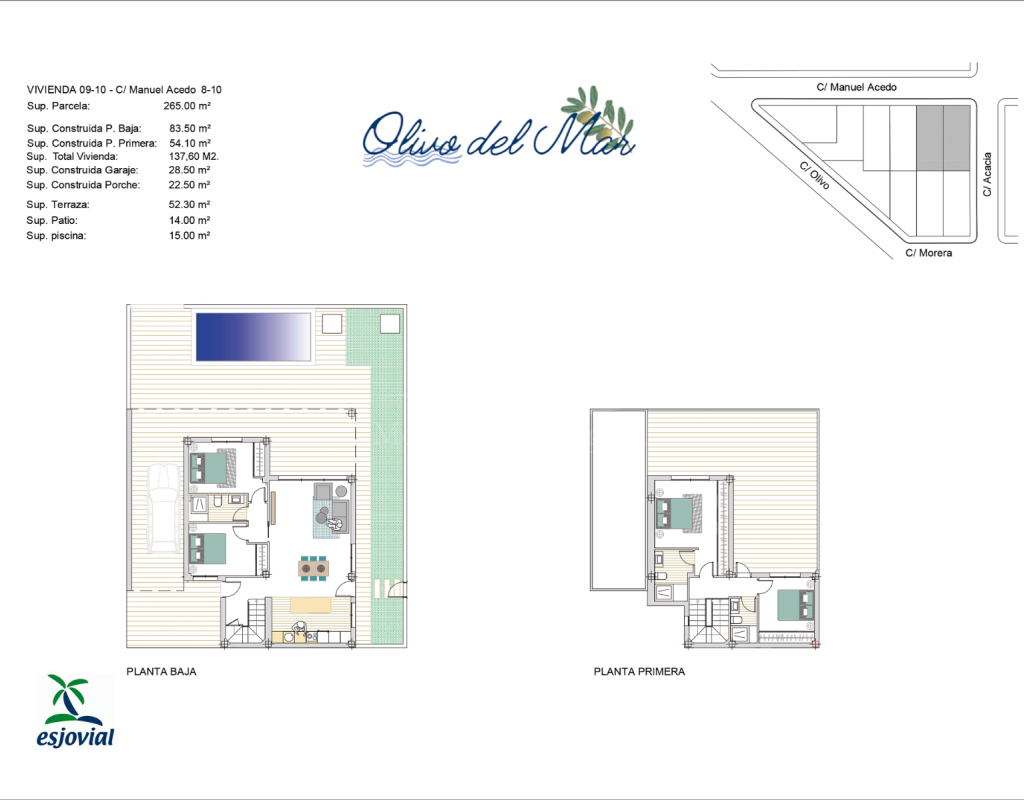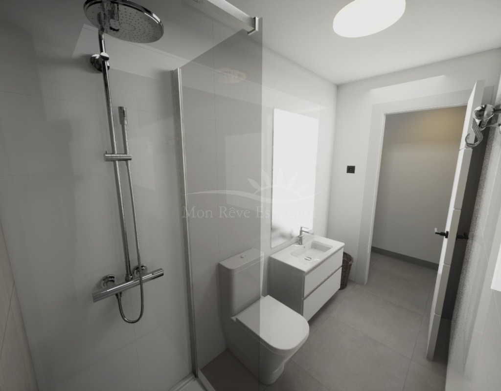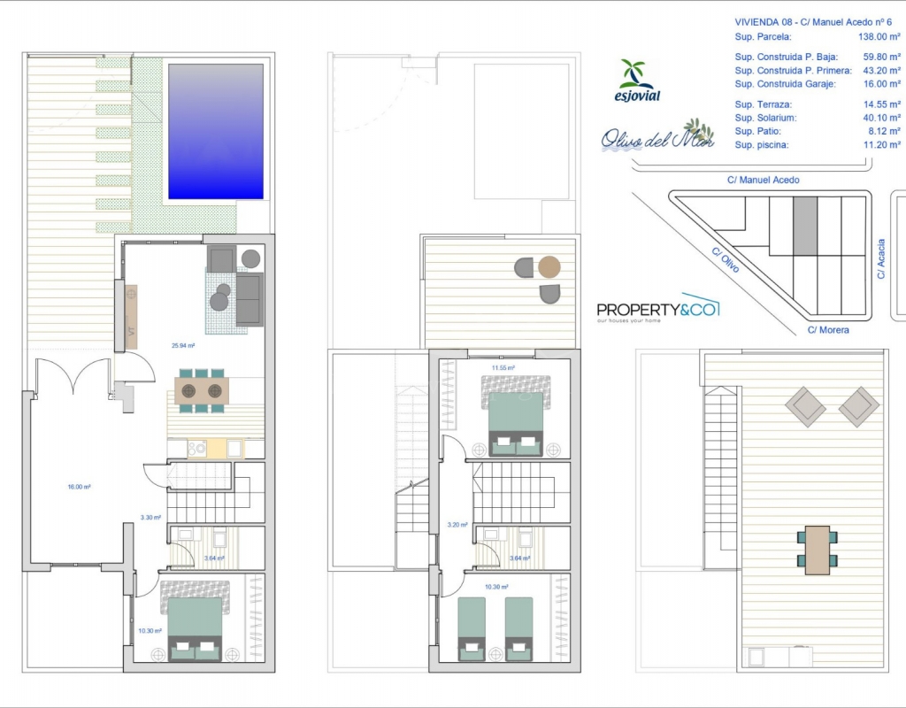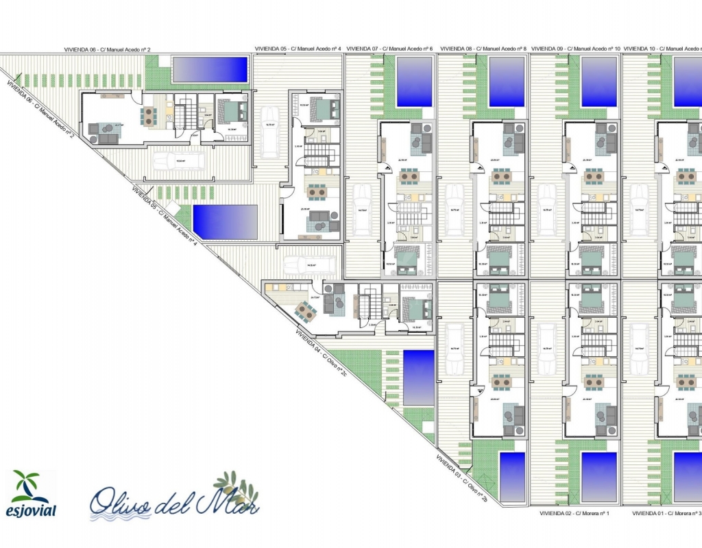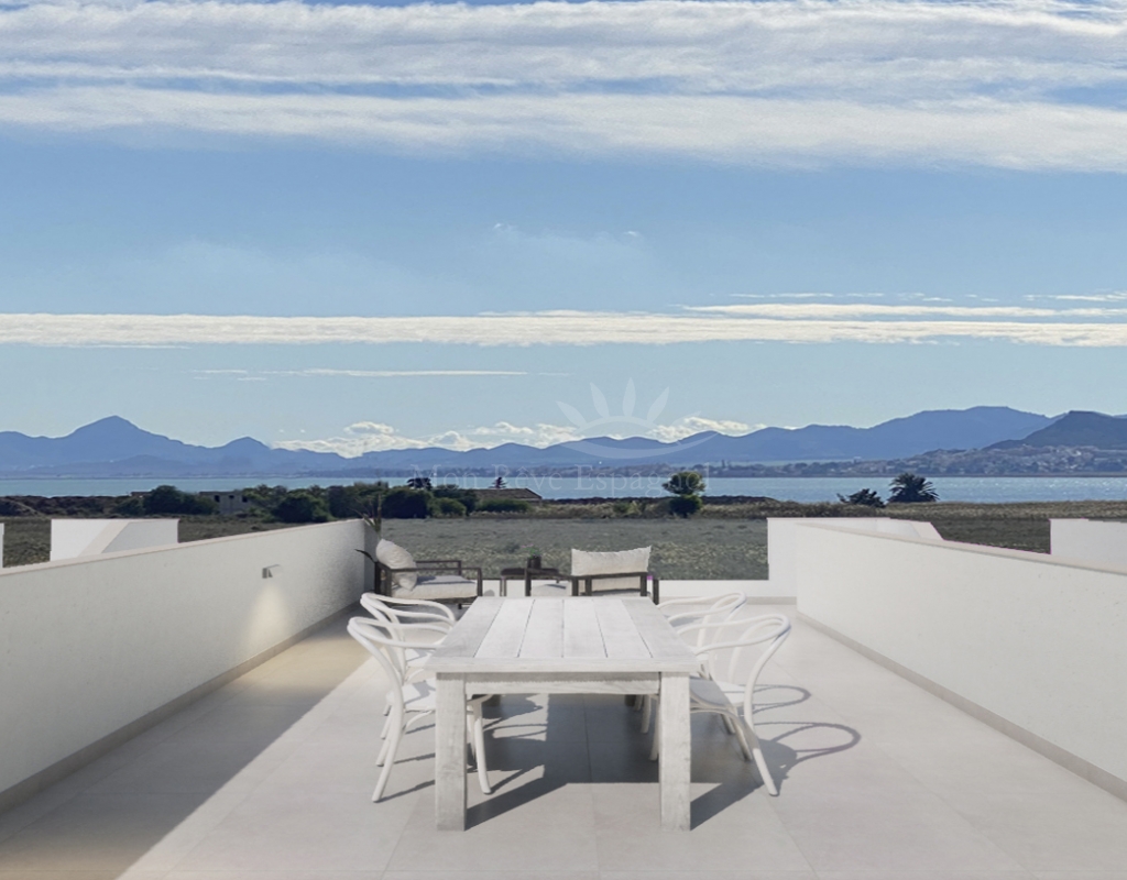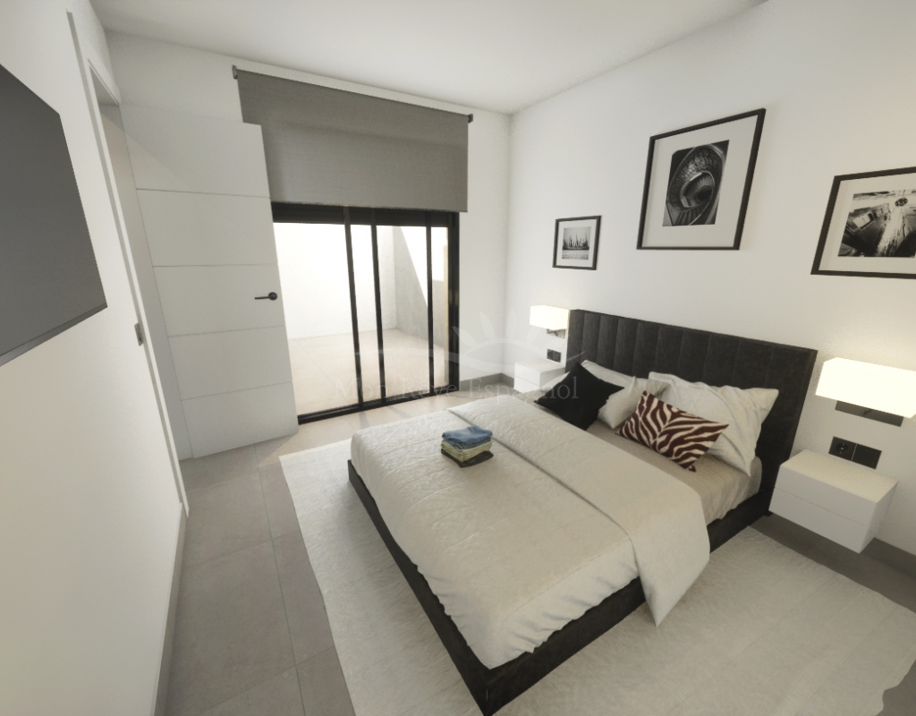 400M from the beach, Residencial Olivo Del Mar I is a complex of 10 villas with private pool as well as a covered garage for each property. These villas are duplex style with terraces on the ground floor, first and second floor with different orientations, allowing you to enjoy all the hours of sunshine every day of the year. Each property has 3 bedrooms and 2 bathrooms. They are composed on the ground floor: 1 living-dining room with open kitchen, 1 double bedroom and 1 shower room. Upstairs there are 2 double bedrooms, 1 shower room, 1 terrace and access to the 40m2 roof terrace. The complex is located in Los Alcázares (Murcia), 400 meters from the sandy beaches and 30 minutes drive from Murcia airport. It is also surrounded by all services, sports facilities and close to several golf courses such as Roda Golf, La Serena Golf, Mar Menor Golf and many more. The properties will meet the highest standards and will be equipped with: Private swimming pool with outdoor shower. Summer kitchen in a solarium. Kitchen equipped with all appliances: fridge, ceramic hob, raised oven, built-in microwave, extractor hood and integrated dishwasher. Lined cabinets with drawers. Bathrooms with toilet, washbasin cabinet, mirror with light and shower screens. Pre-installation for air conditioning. Covered garage area.