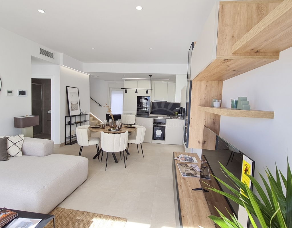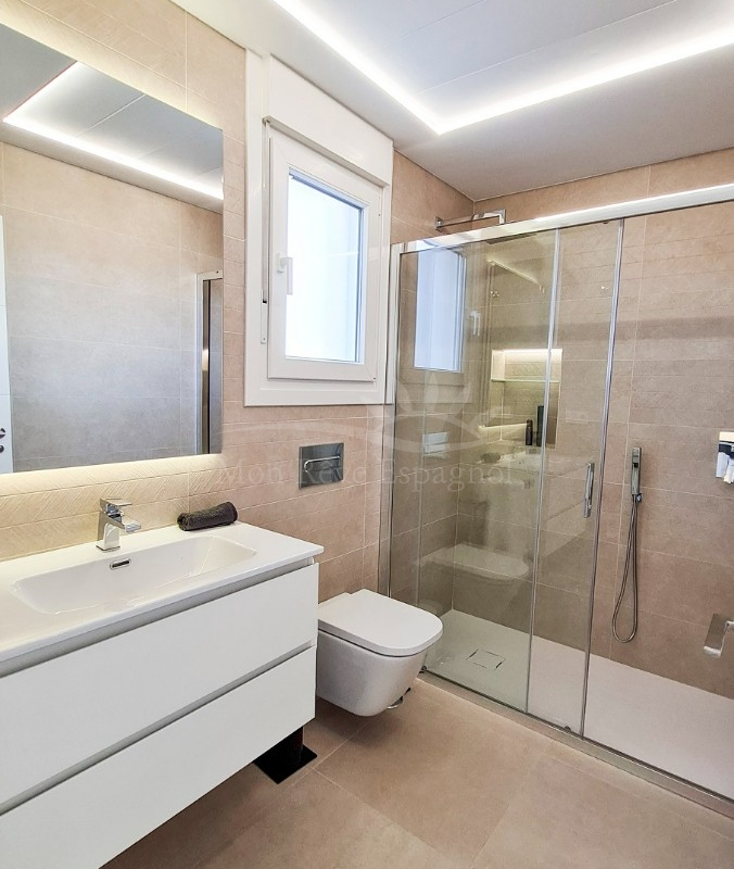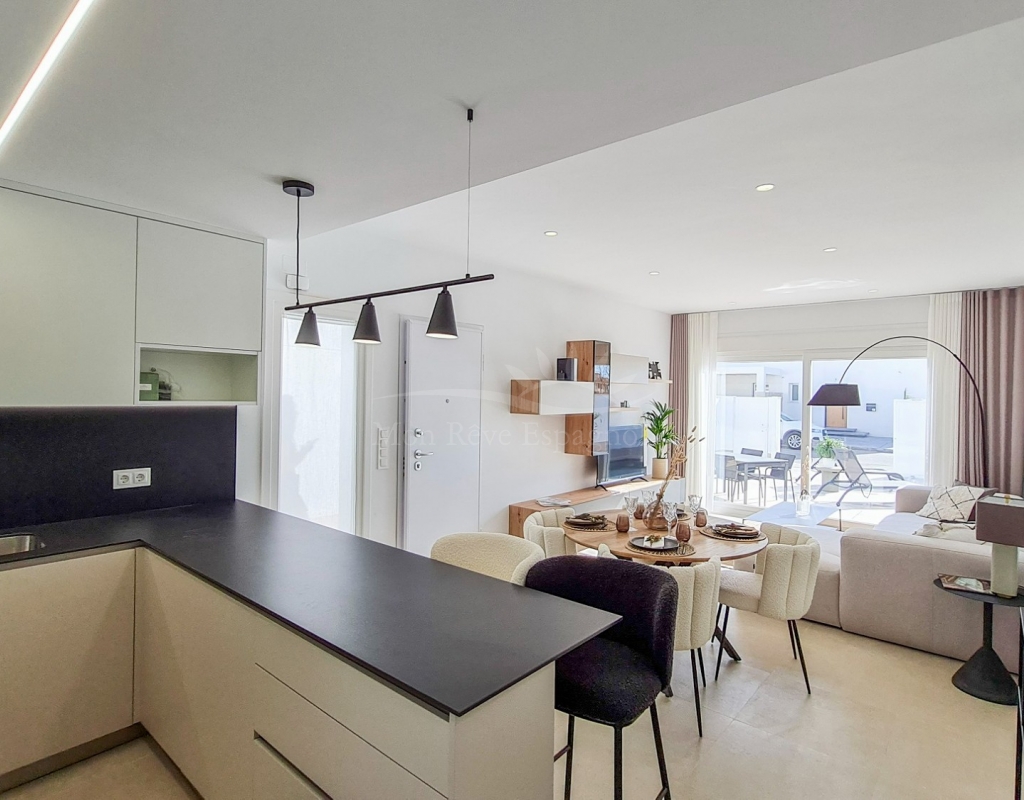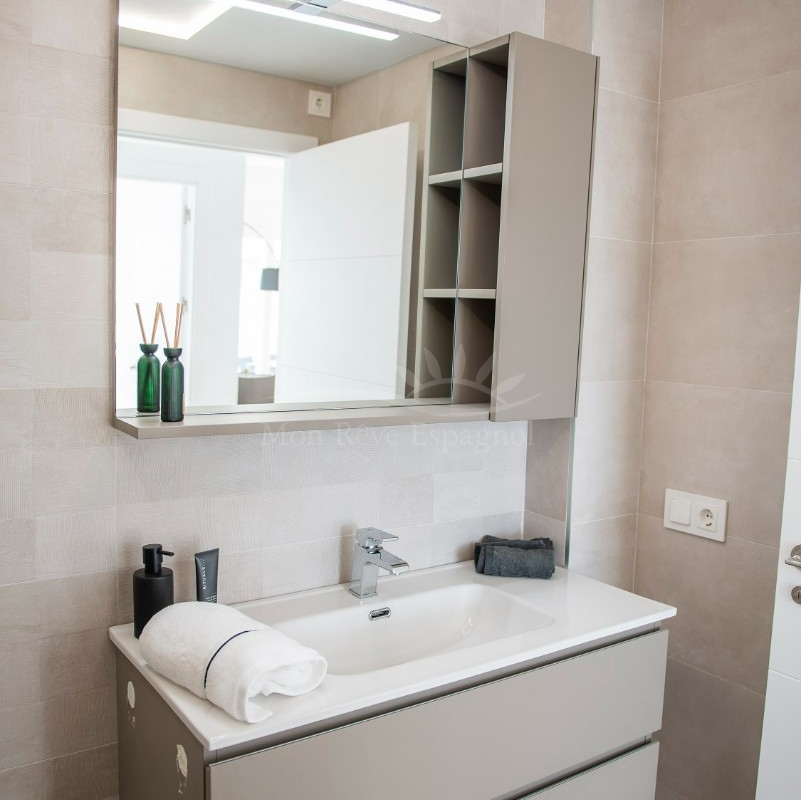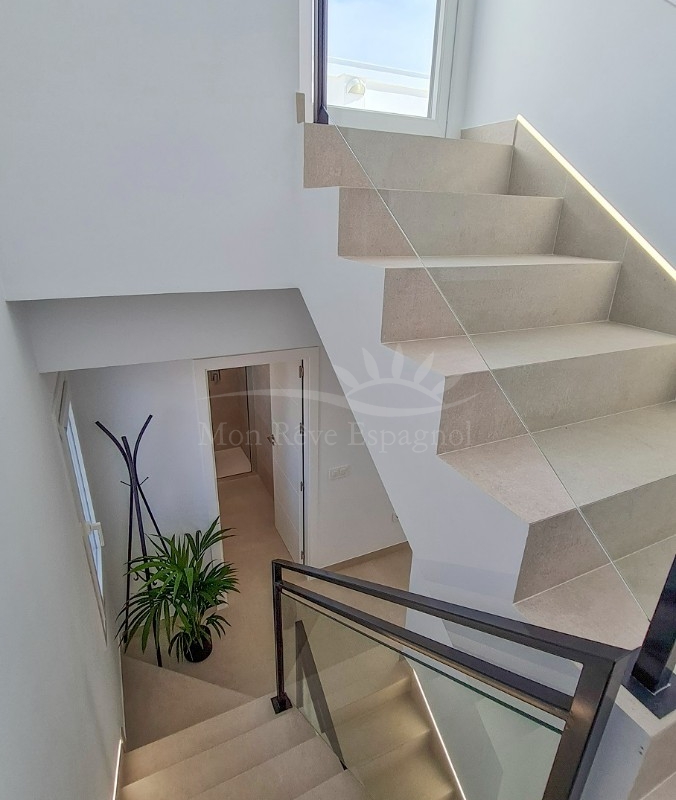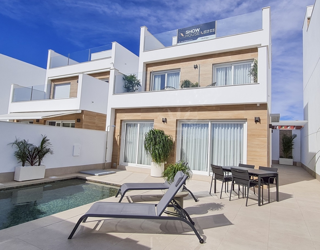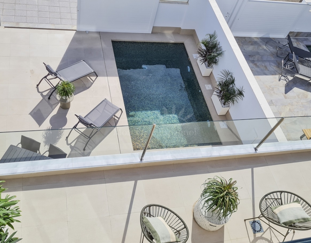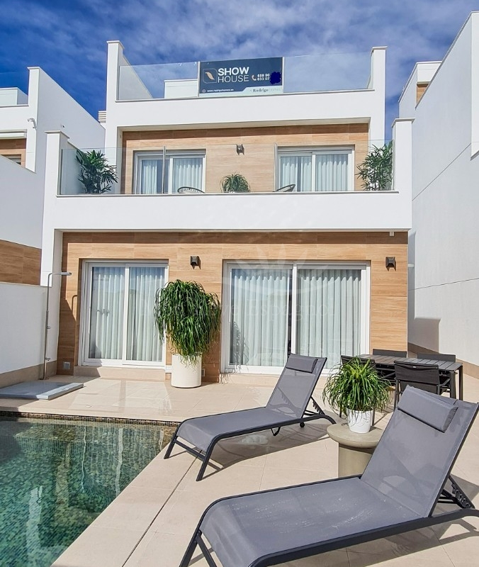 Modern open plan design ground floor consists of living/dining/kitchen with large patio doors leading from the living room to the patio and pool, bedroom again with patio doors to the patio and pool and a bathroom. 1st floor a further 2 bedrooms with access to a large terrace, and a bathroom. Bathrooms come fully fitted, a fully equipped kitchen including (induction hob, extractor fan, oven, microwave, built in fridge, built in dishwasher, washing machine), Bedrooms come with built in wardrobes with LED lighting with the master having a walk in wardrobe, patio, and private pool, and off road parking.