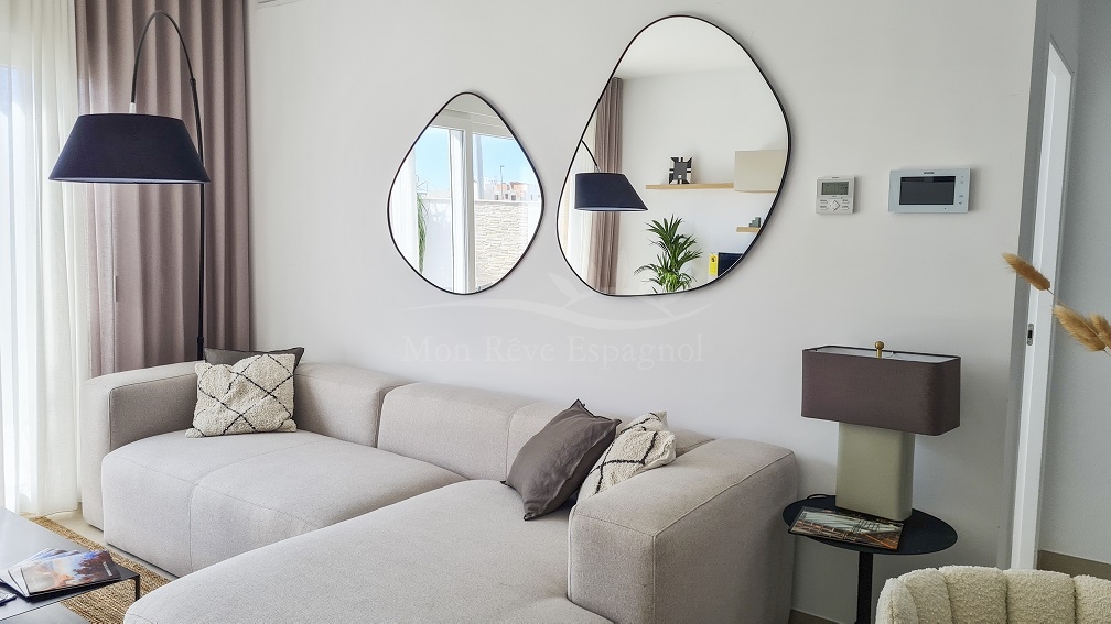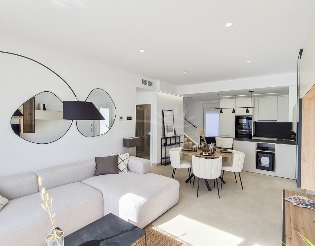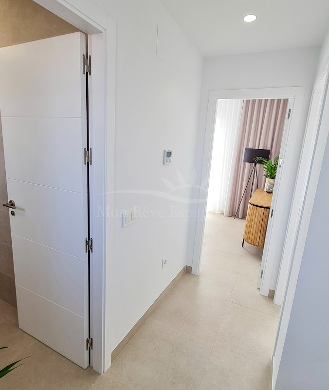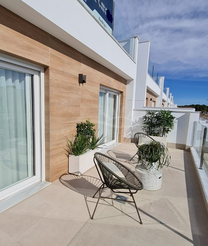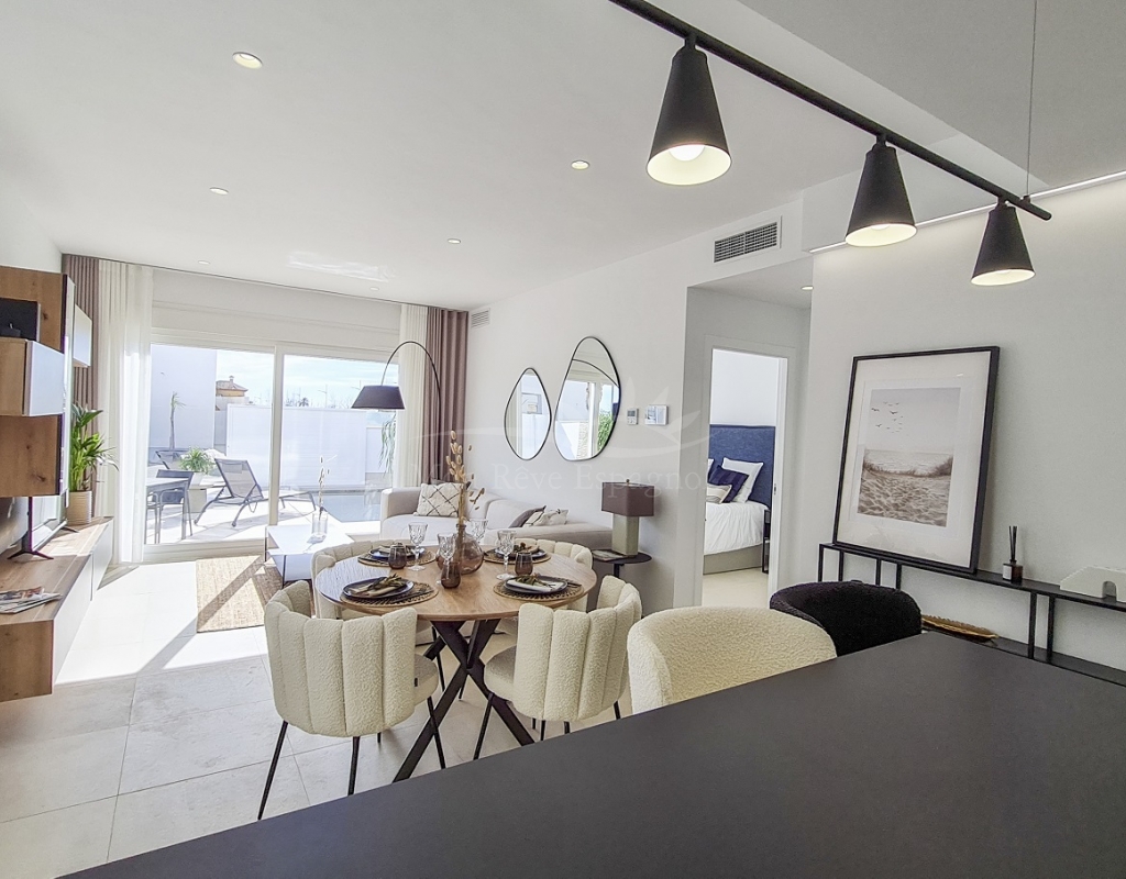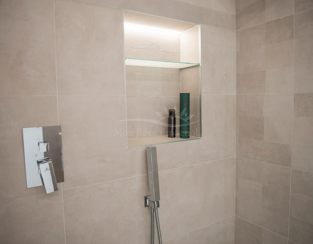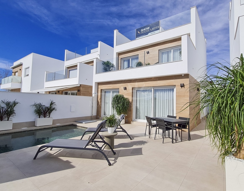 Modern open plan design ground floor consists of living/dining/kitchen with large patio doors leading from the living room to the patio and pool, bedroom again with patio doors to the patio and pool and a bathroom. 1st floor a further 2 bedrooms with access to a large terrace, and a bathroom. Bathrooms come fully fitted, a fully equipped kitchen including (induction hob, extractor fan, oven, microwave, built in fridge, built in dishwasher, washing machine), Bedrooms come with built in wardrobes with LED lighting with the master having a walk in wardrobe, patio, and private pool, and off road parking.