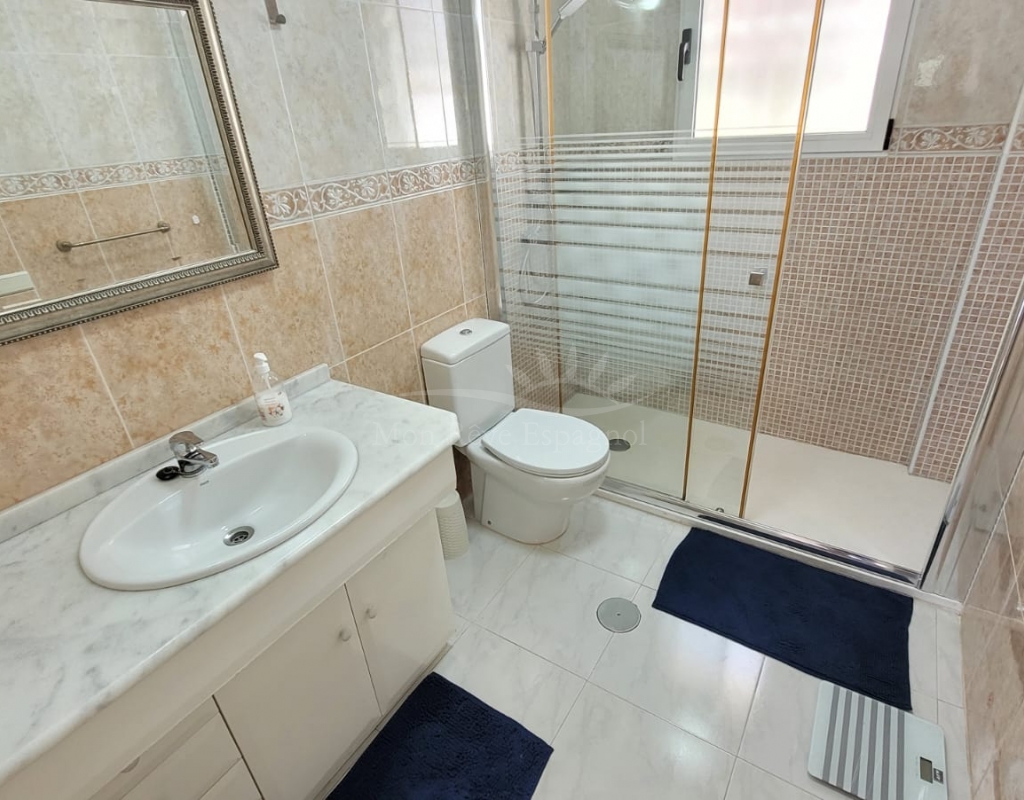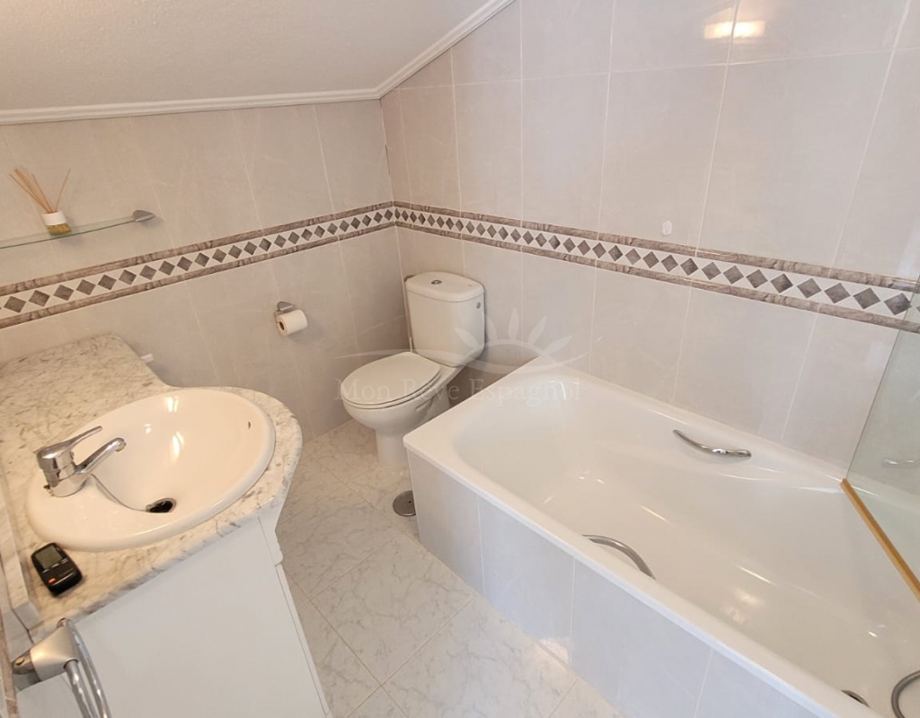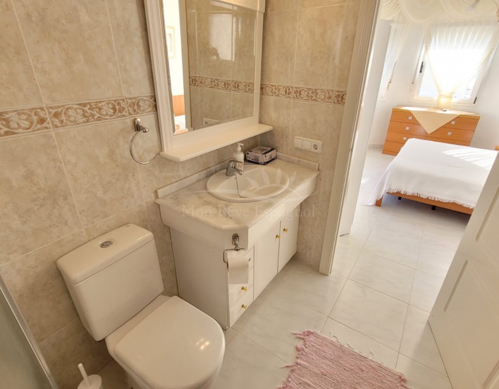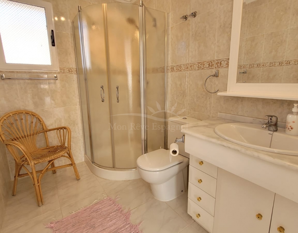 On the first floor there are two bedrooms, both with en-suite bathrooms, wardrobes and air conditioning. There is also a storage/laundry room and a terrace with beautiful views.