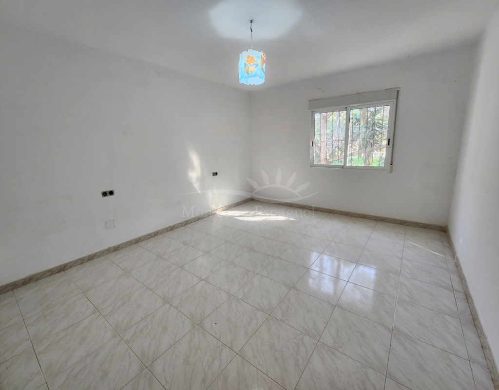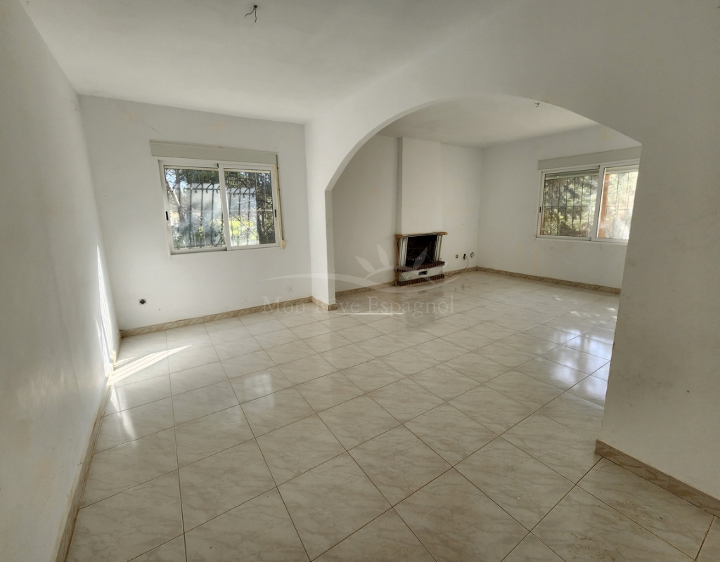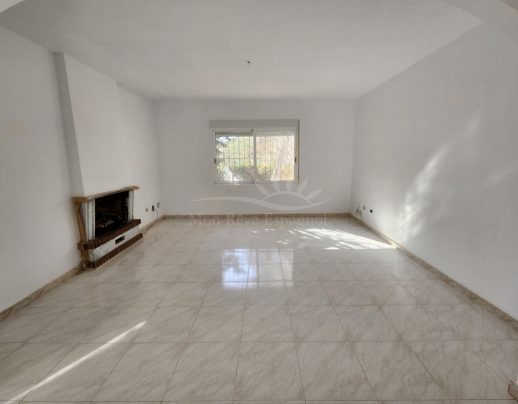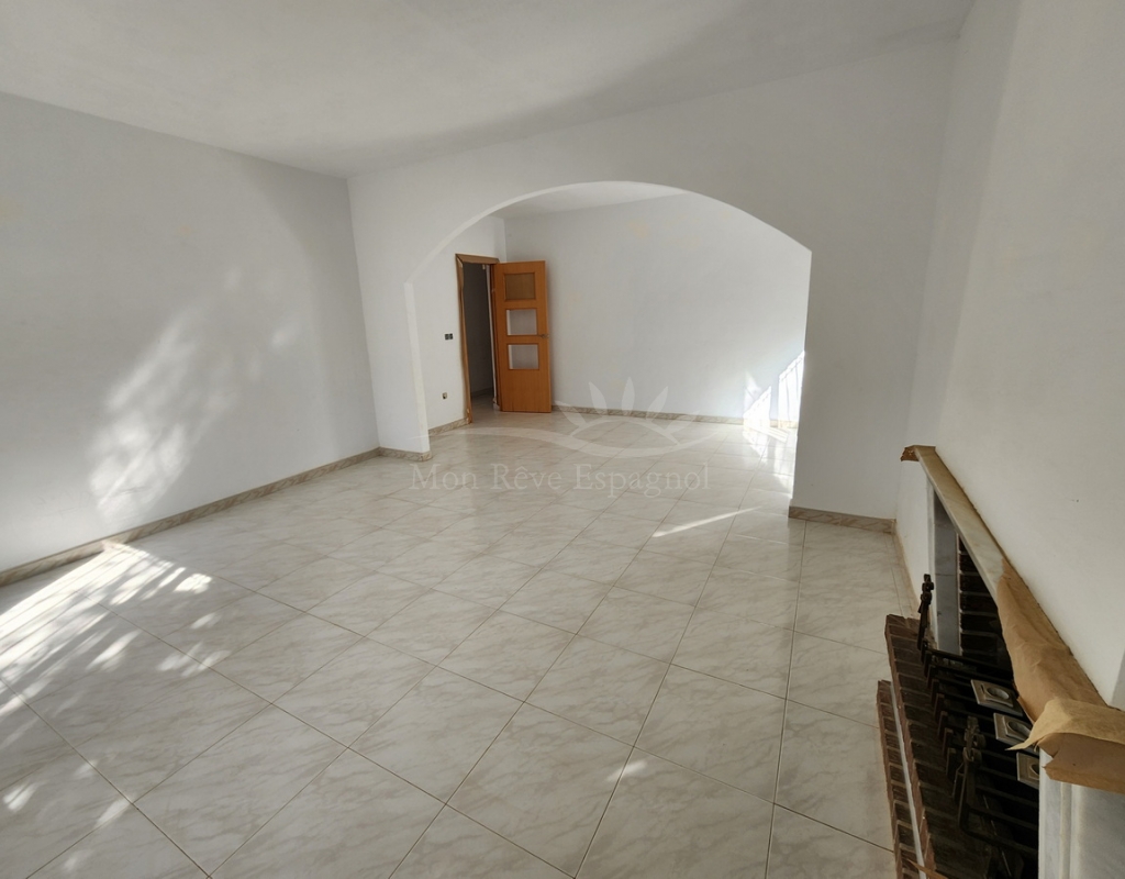 Through the main entrance, you also access the spacious living-dining room with a fireplace, the three bedrooms, and the two bathrooms.