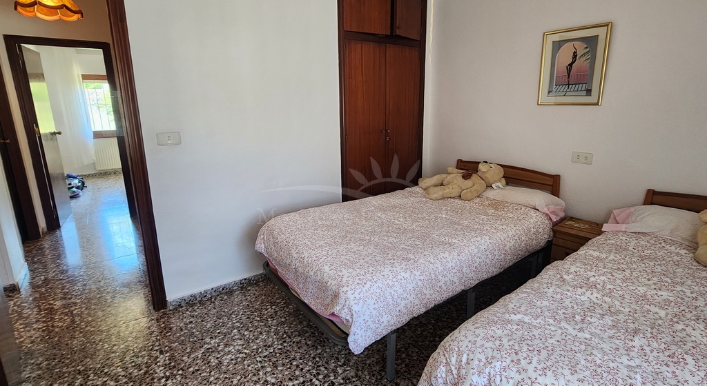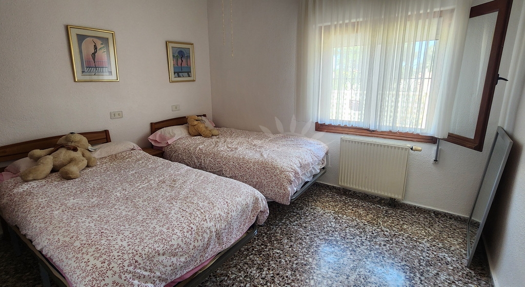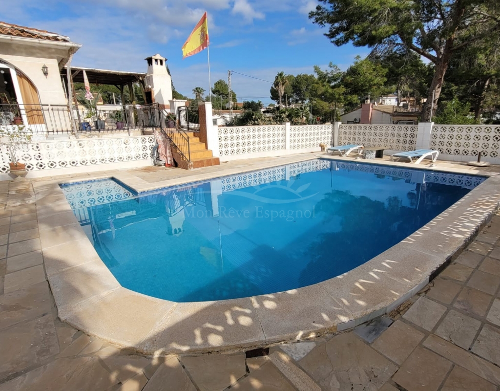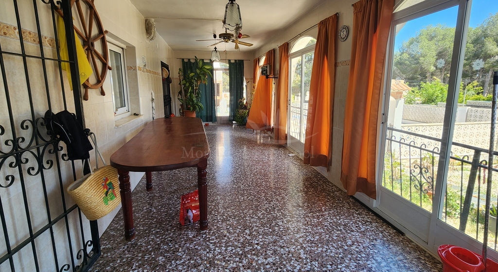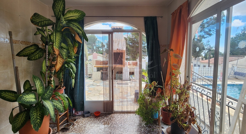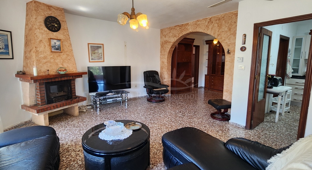 The house has a large glazed terrace, living room with fireplace, dining room, kitchen, three bedrooms and two bathrooms. From the glazed terrace you also have access to an open terrace and the pool.