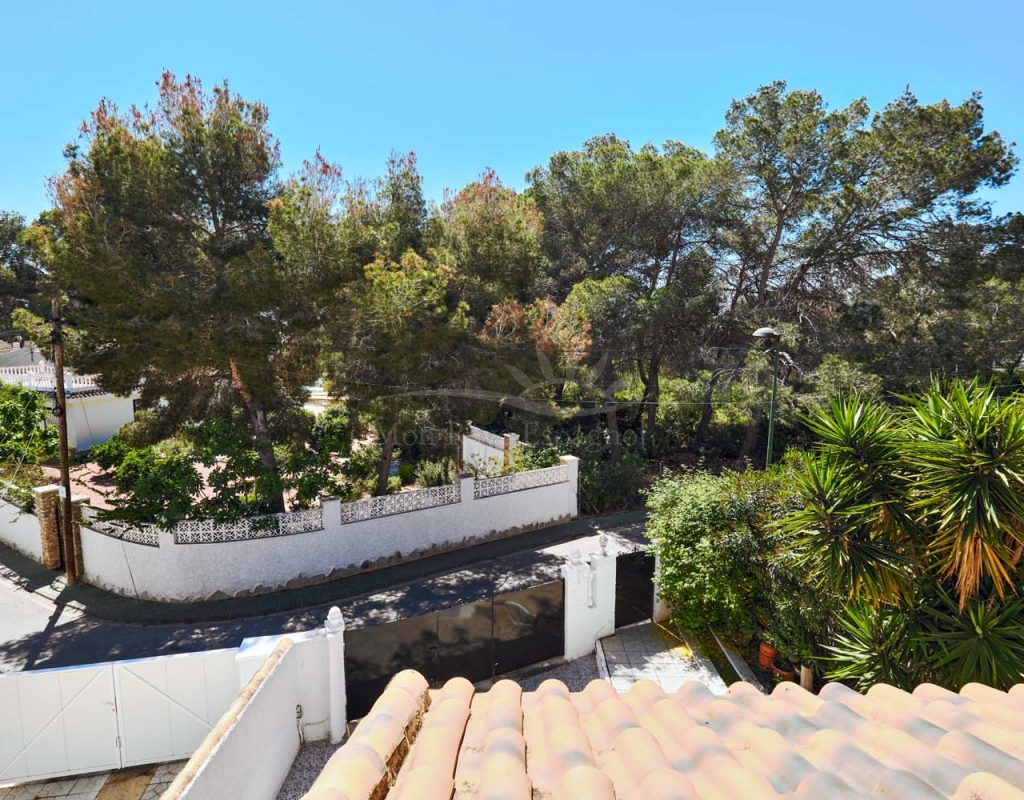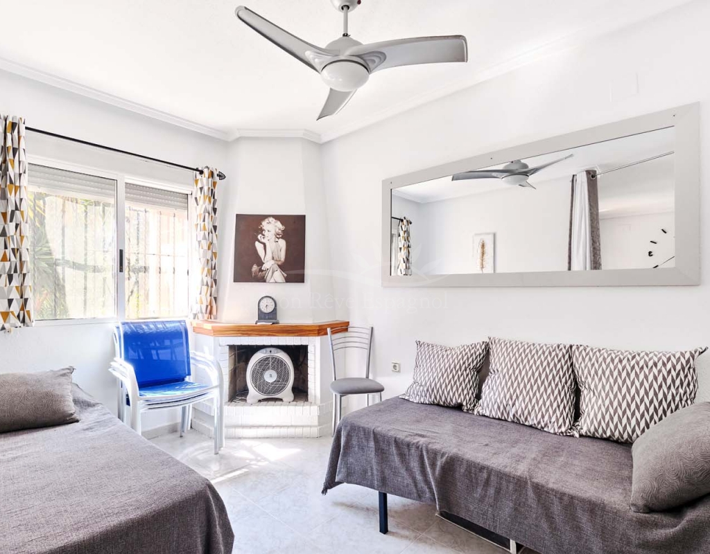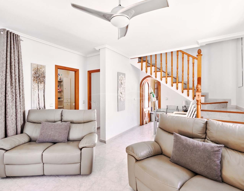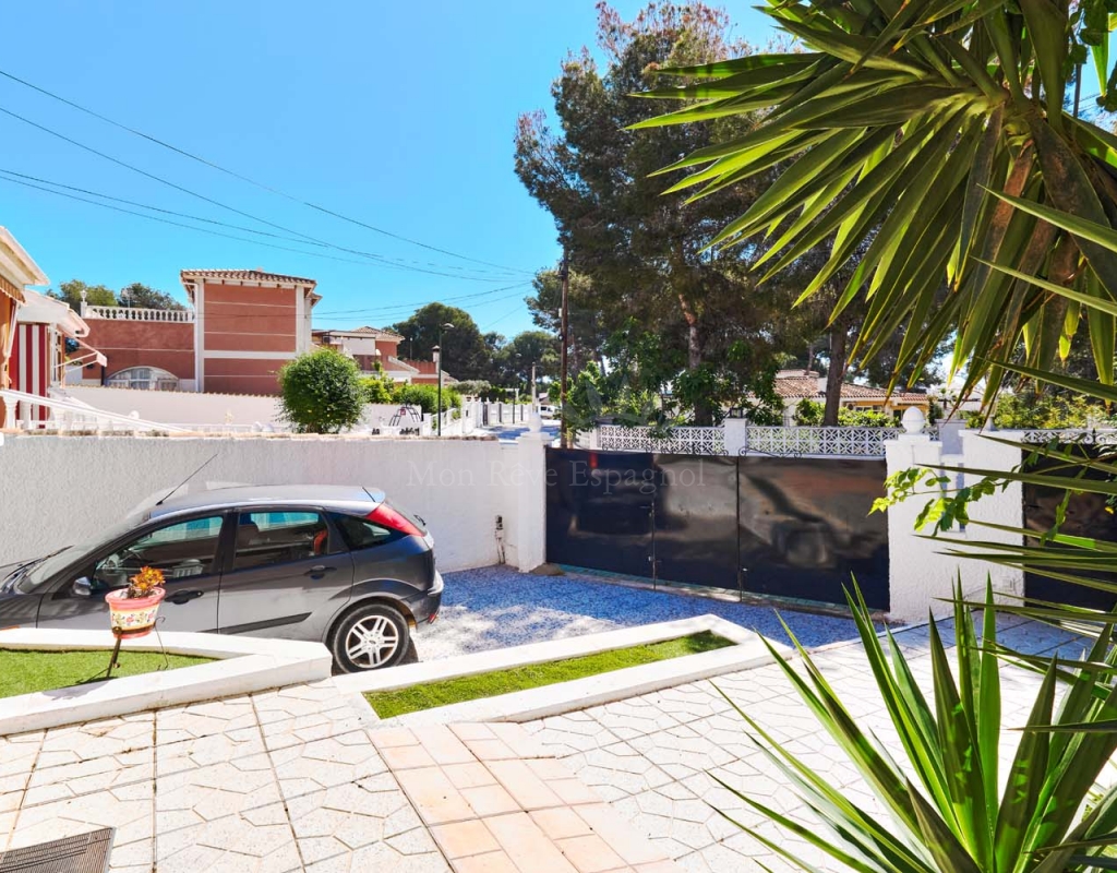 To the front of the property is ample off-street parking accessed through double gates. There is a separate pedestrian gate with a pathway leading to a covered terrace and the front door of the villa. The front door opens into a spacious open-plan living/dining area. At the front, the third bedroom has been removed to create a larger living space but could easily be converted if a third bedroom is required.
