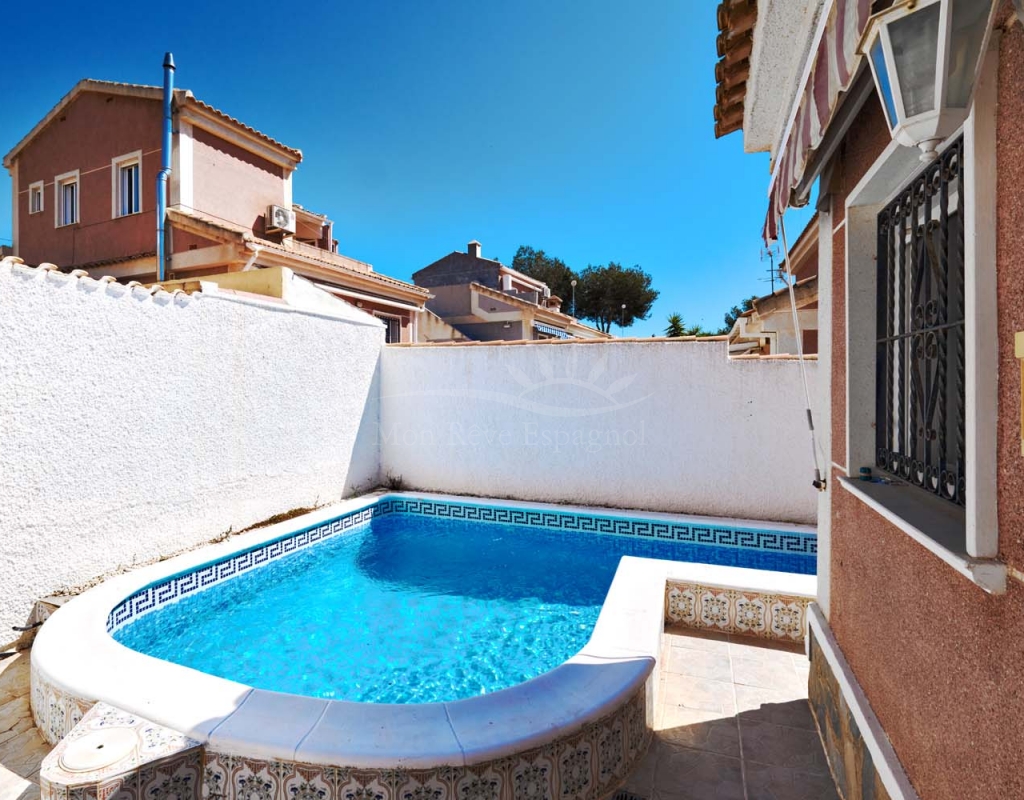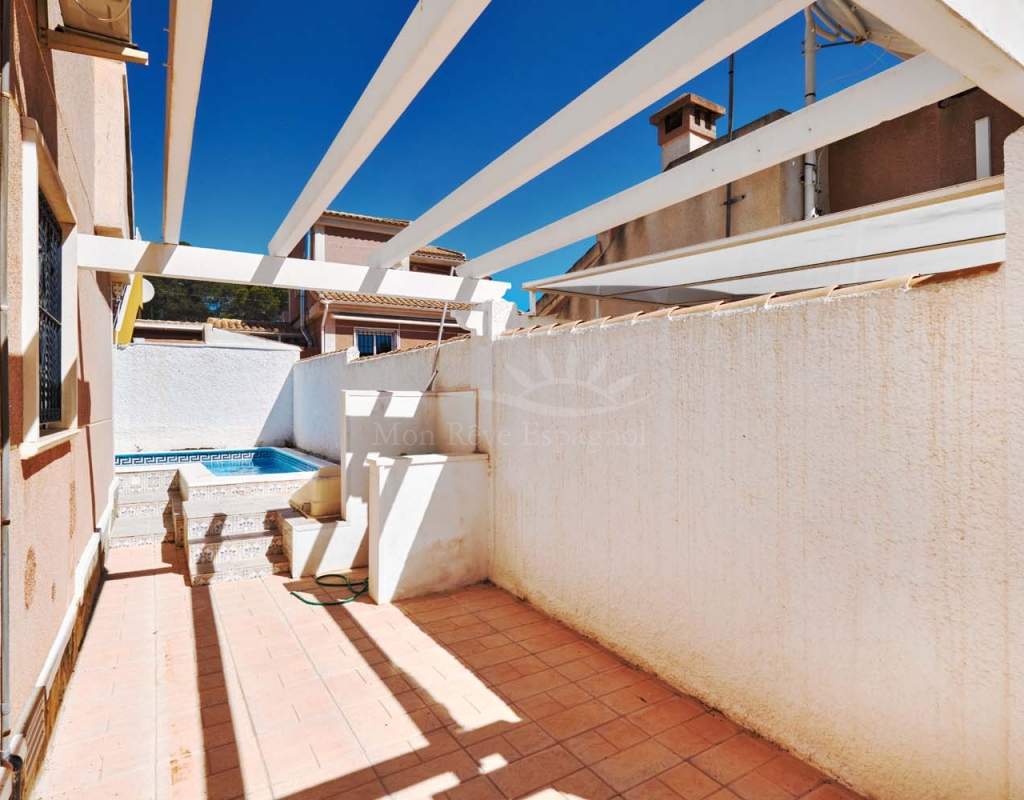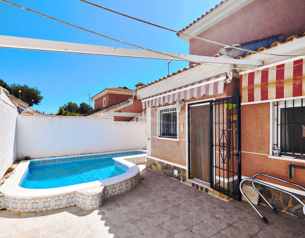 A rare opportunity to purchase a 2/3 bedroom semi-detached villa with a private pool located in the center of the village of Pinar de Campoverde, with a wide selection of bars and restaurants, a health center, a pharmacy, and much more within walking distance of the property. The villa is also just 10 km from the famous Blue Flag beaches of Torre de la Horadada and Mil Palmeras.