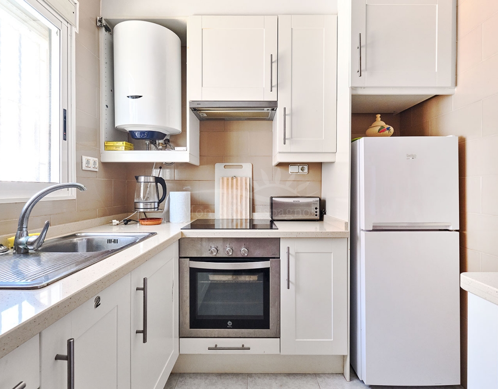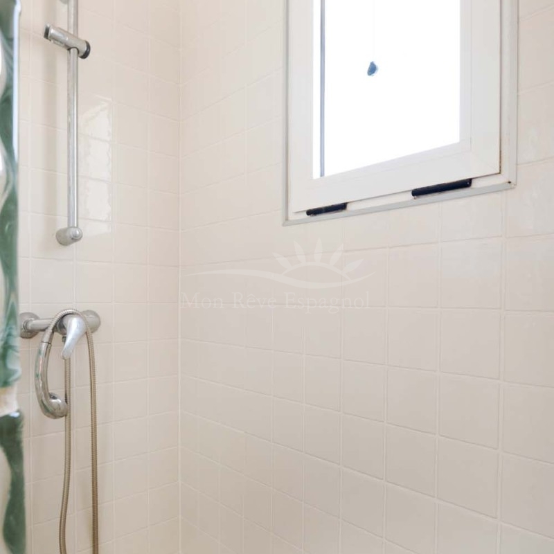 To the rear, to the left, is a ground floor double bedroom with built-in wardrobes, and next to it is a shower room. The separate kitchen is located at the rear of the villa. It is well-presented, and there is a back door leading to a rear terrace and the pool.