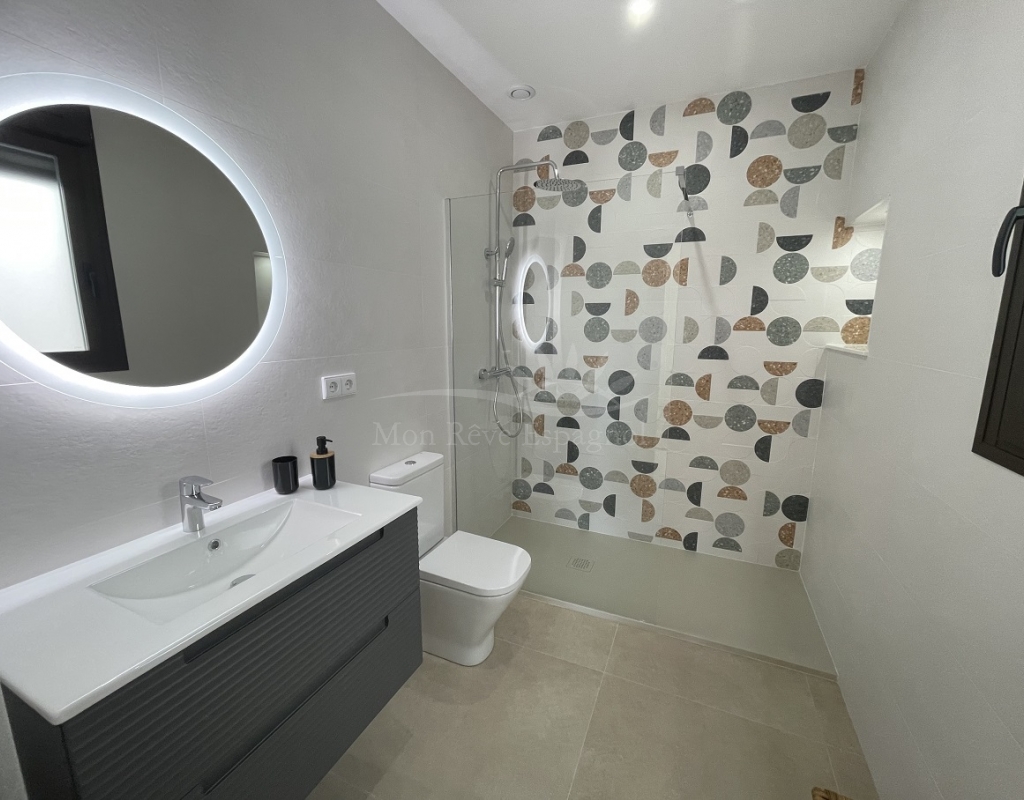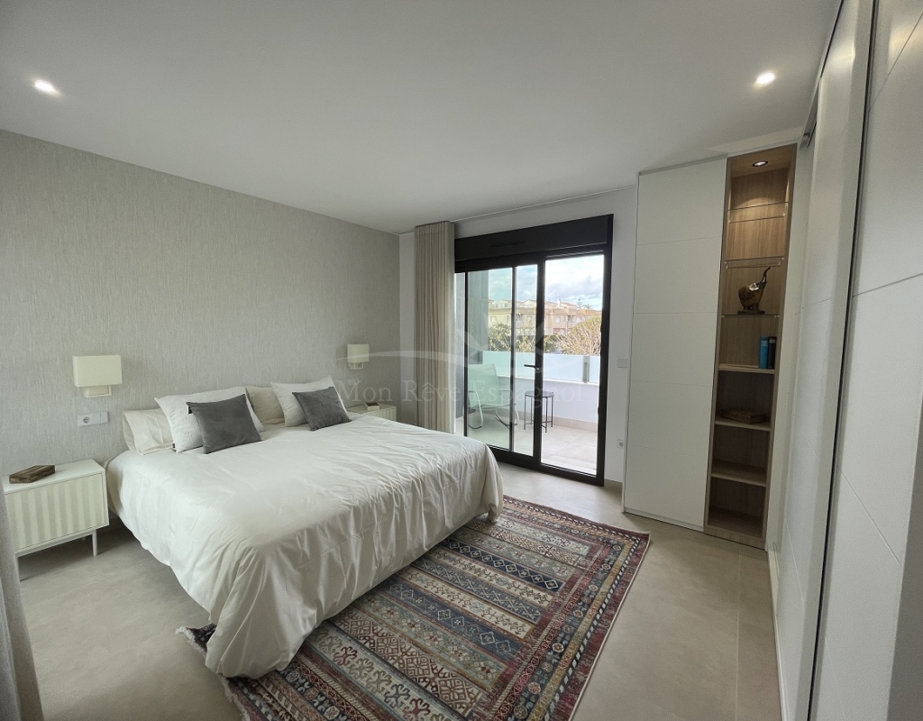 Upstairs, via an internal staircase, are two bedrooms and two bathrooms. The master bedroom has a dressing room, a bathroom, and access to two terraces. A staircase leads to a 42m² roof terrace with an outdoor shower and a summer kitchen area.