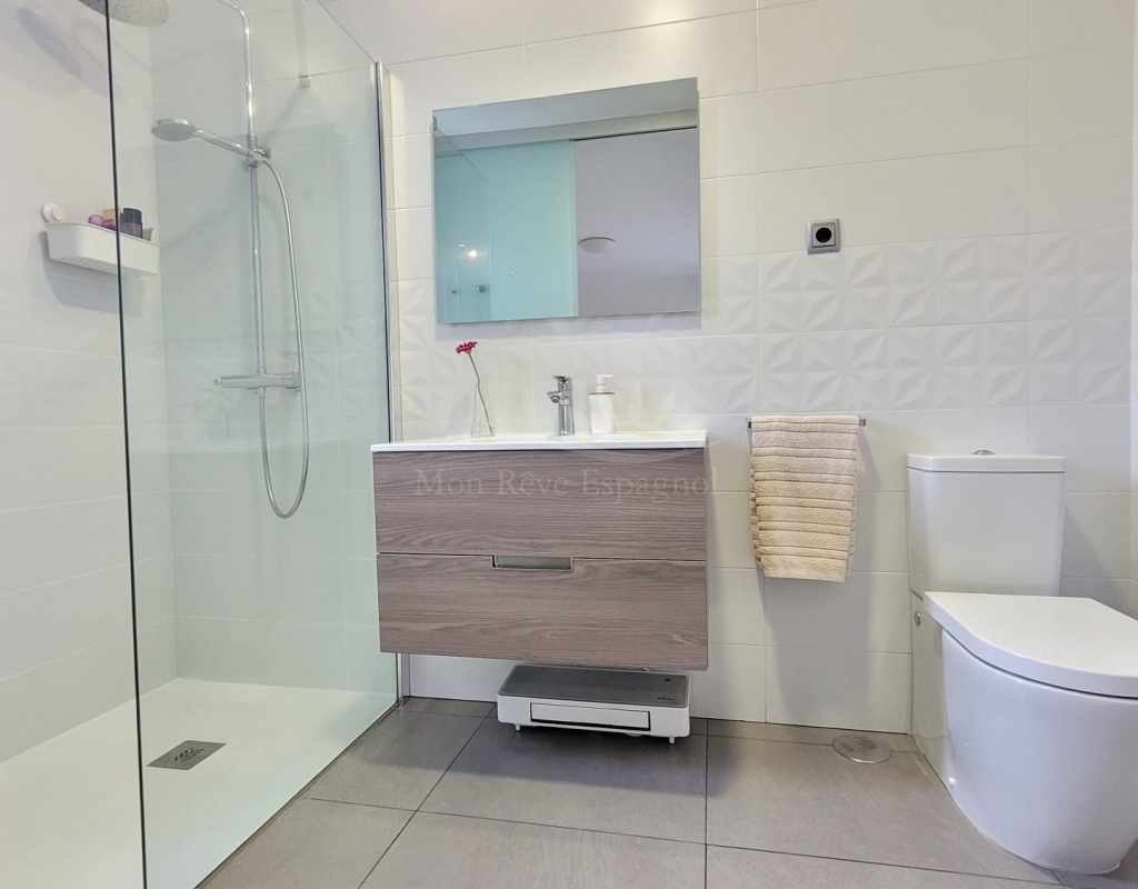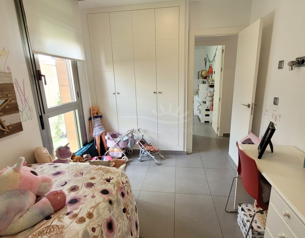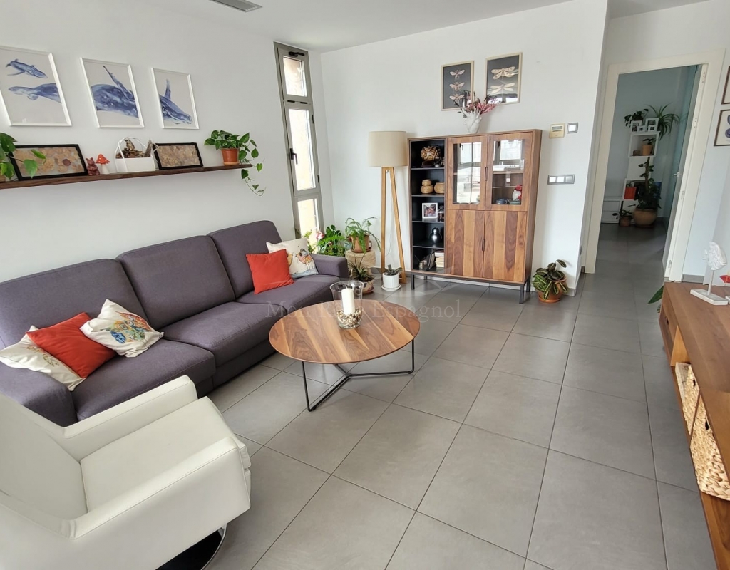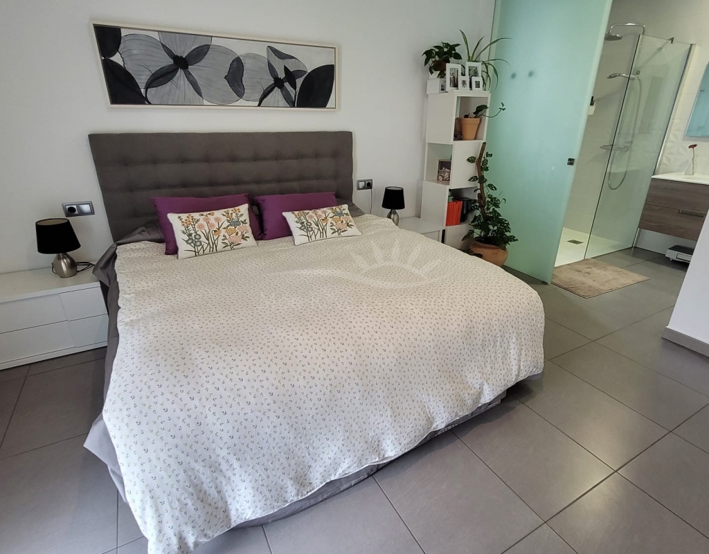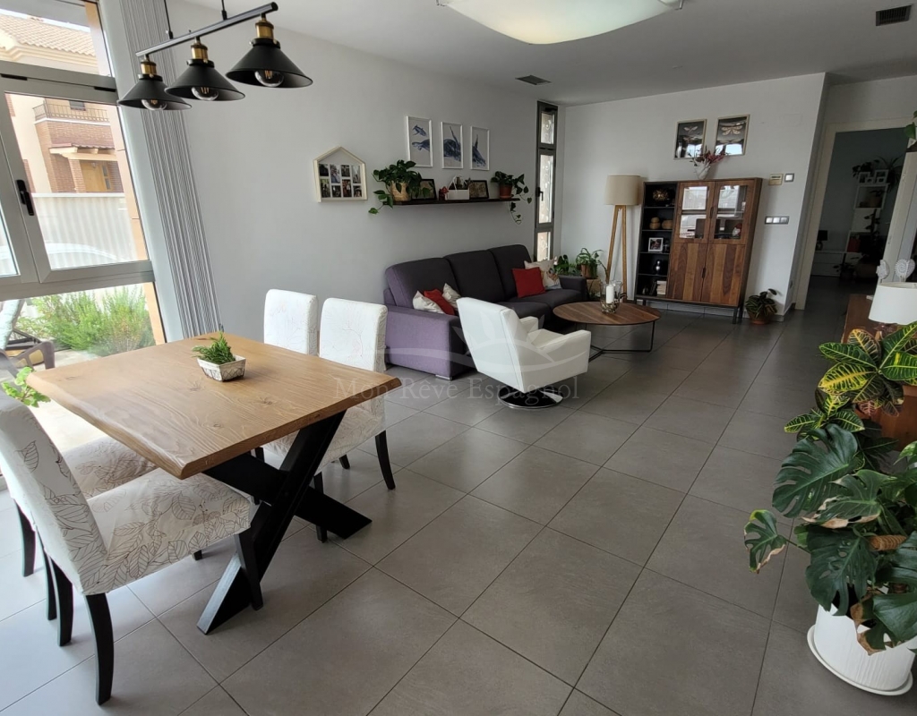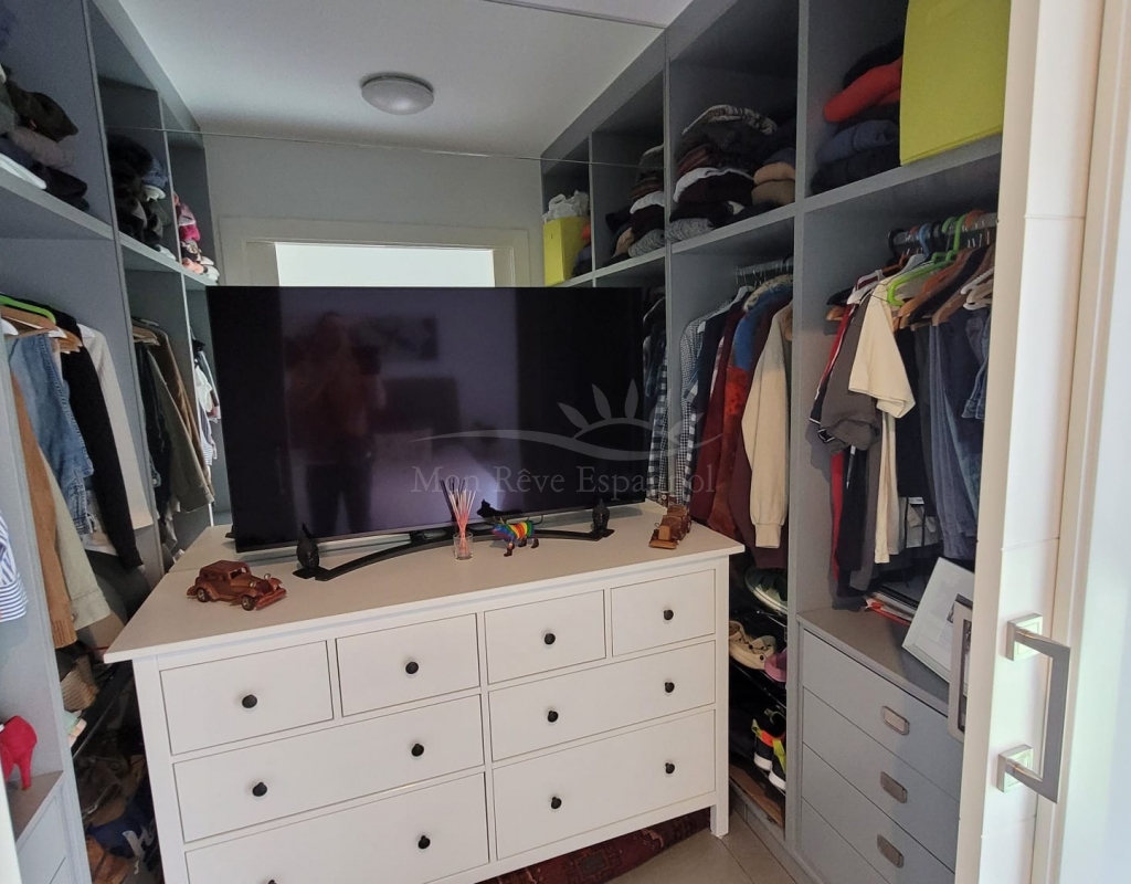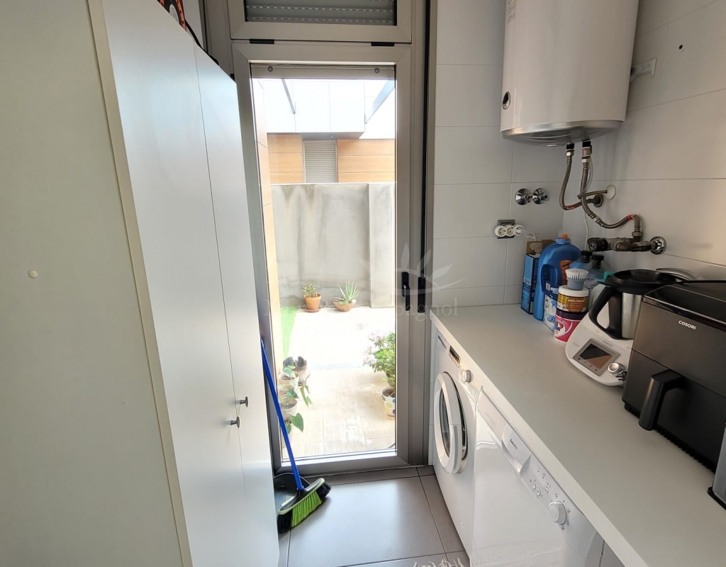 It consists of an entrance hall, a spacious living-dining room, 3 double bedrooms with built-in wardrobes (one of them with a dressing room and a private bathroom ), one other bathroom, a fully equipped kitchen with a dining area, and a laundry room with access to the garden.