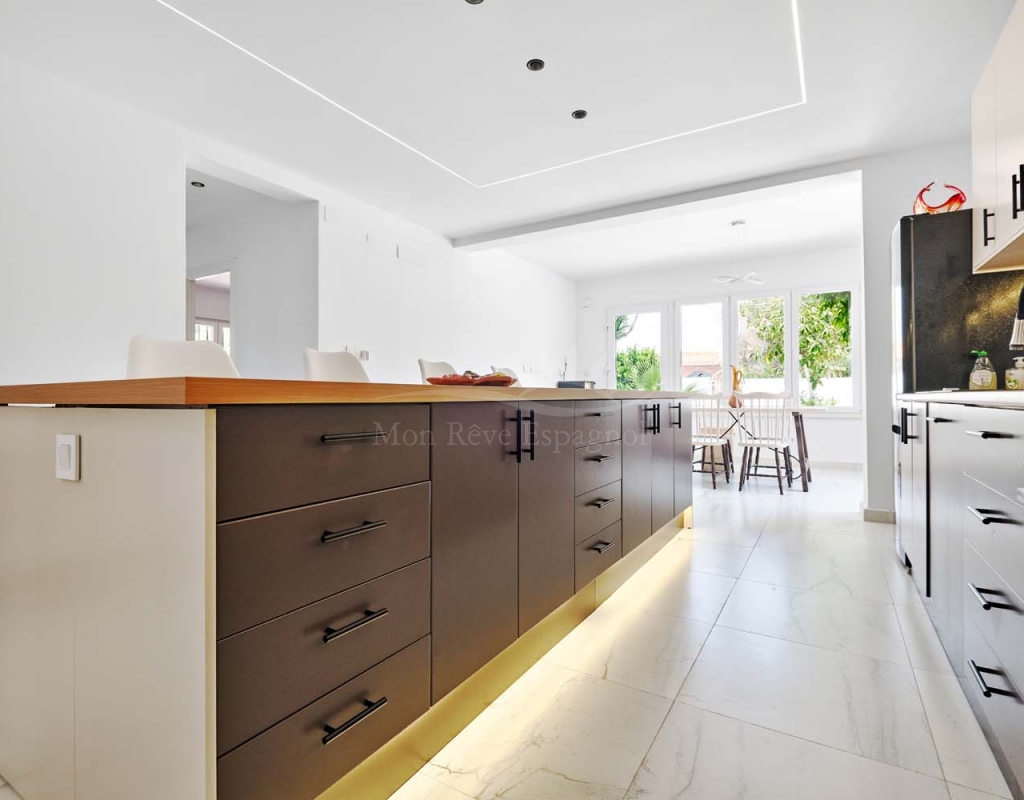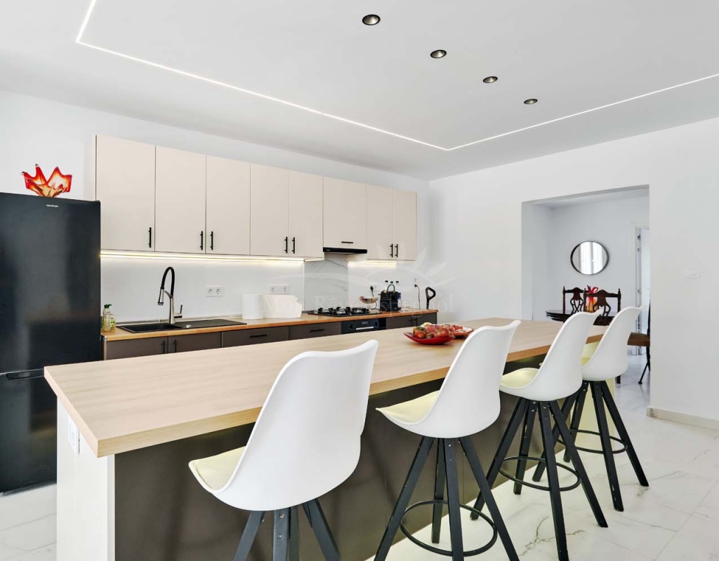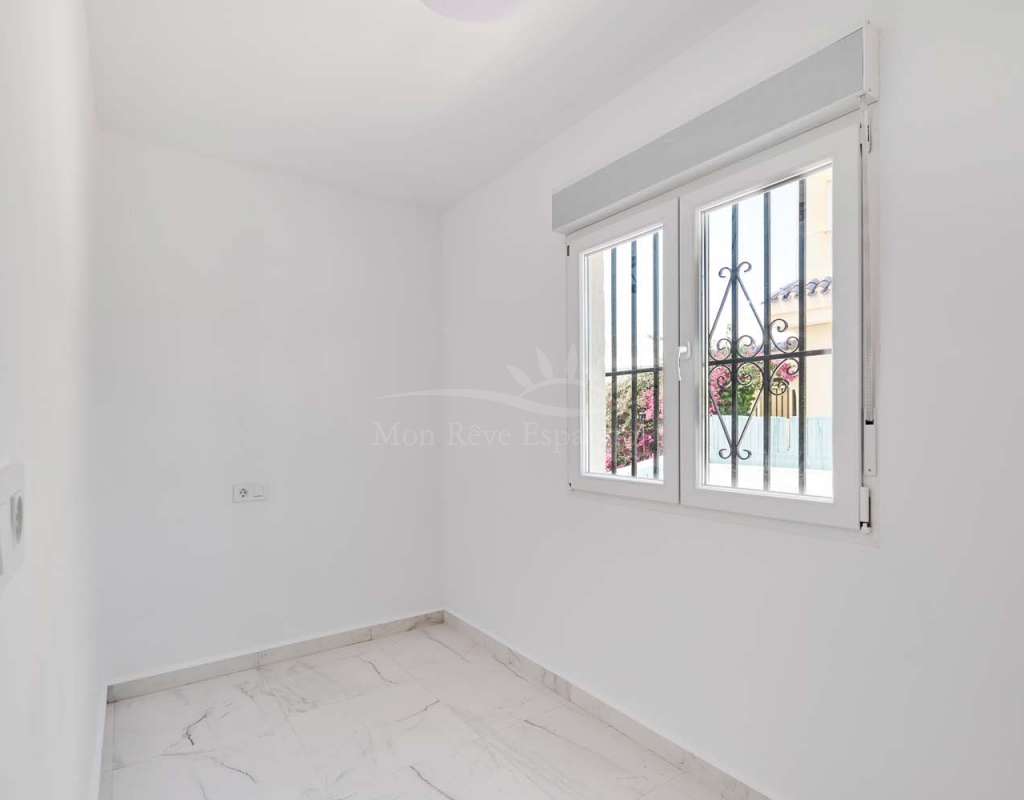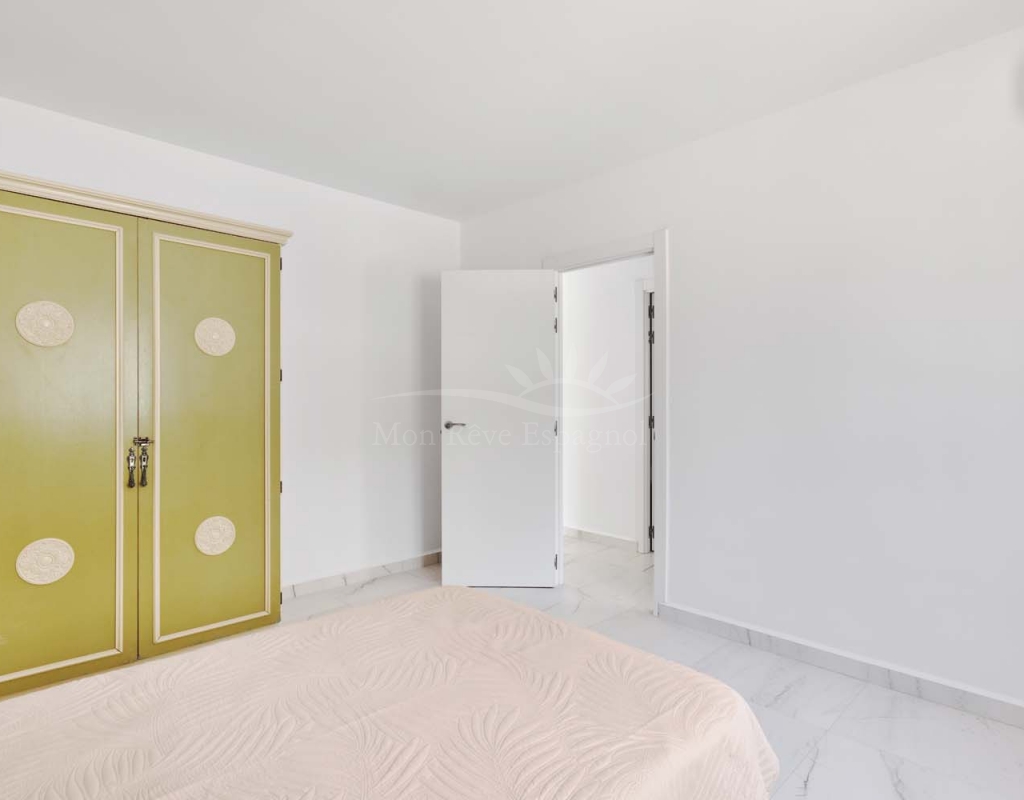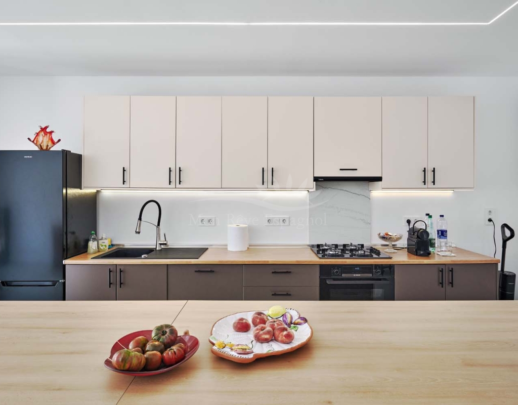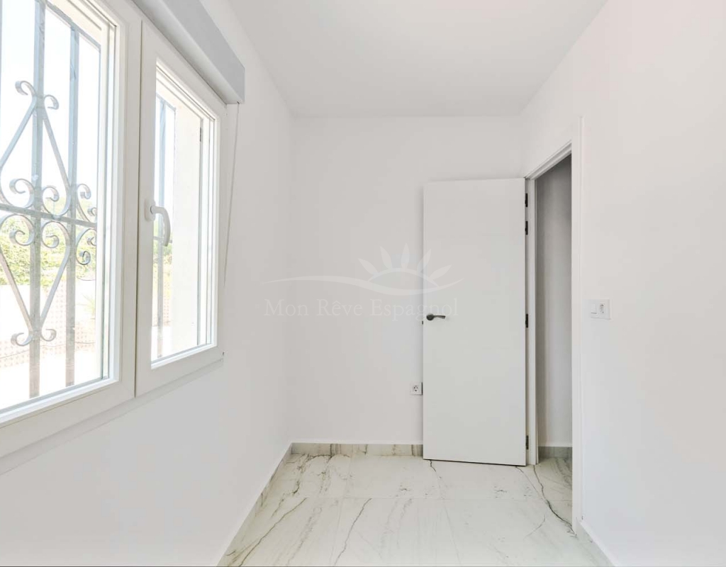 On the ground floor accessed via a glass door which opens into a spacious and bright open plan newly installed kitchen and dining room, this space really is the heart of the home with a large central island ideal for dining, working space or entertaining. To the right of the kitchen is a hallway which leads to a large bedroom, family bathroom and a smaller second bedroom which could also be used as an office or dressing room if preferred. To the rear of the kitchen is a living room with plenty of space for a dining area, there is a door from the living area which leads out to a lovely covered terrace at the side of the plot. A second door from the living room leads to the large master bedroom, there is air conditioning and patio doors which flood the room with light and lead to a terrace overlooking the green area.