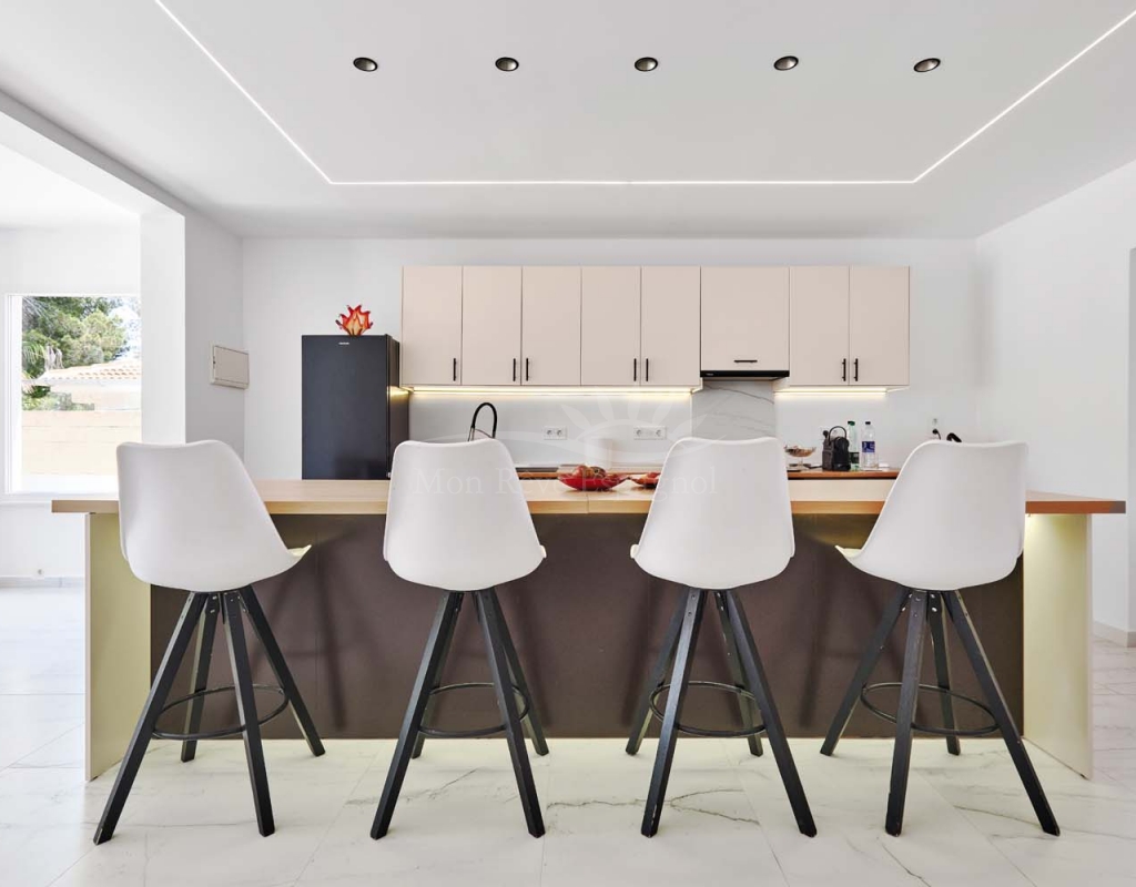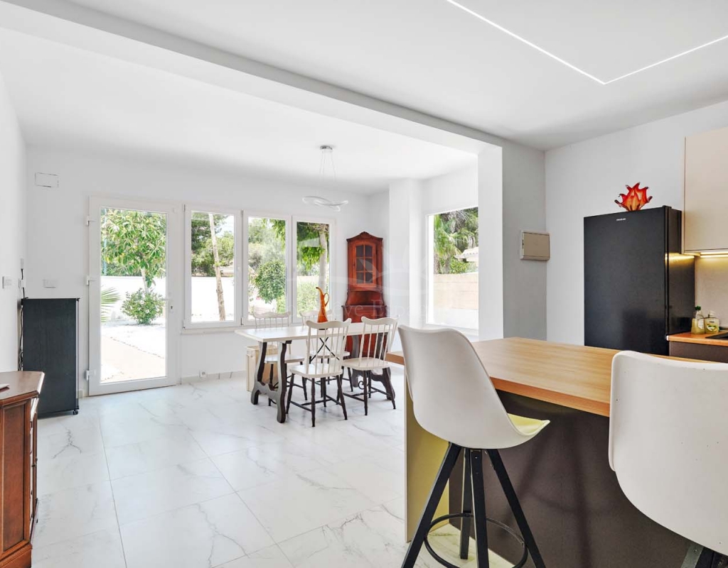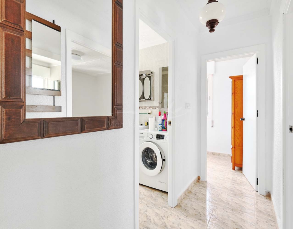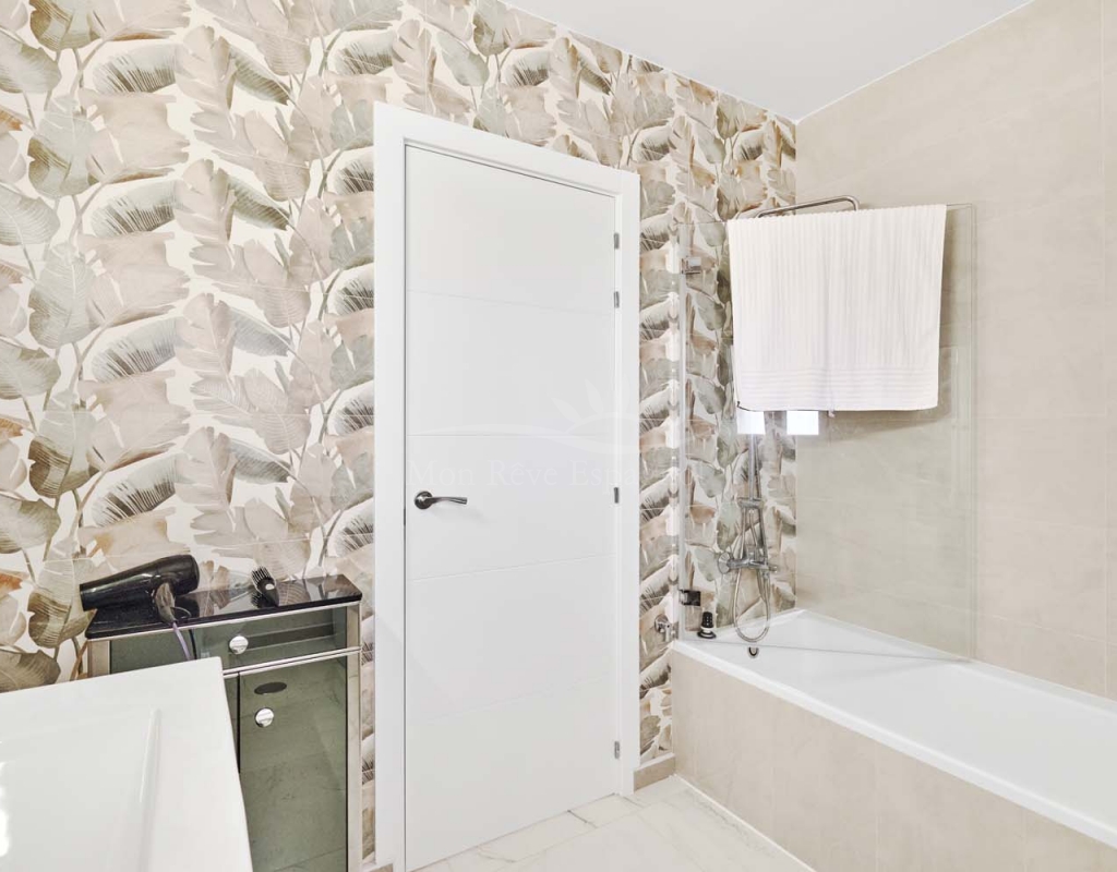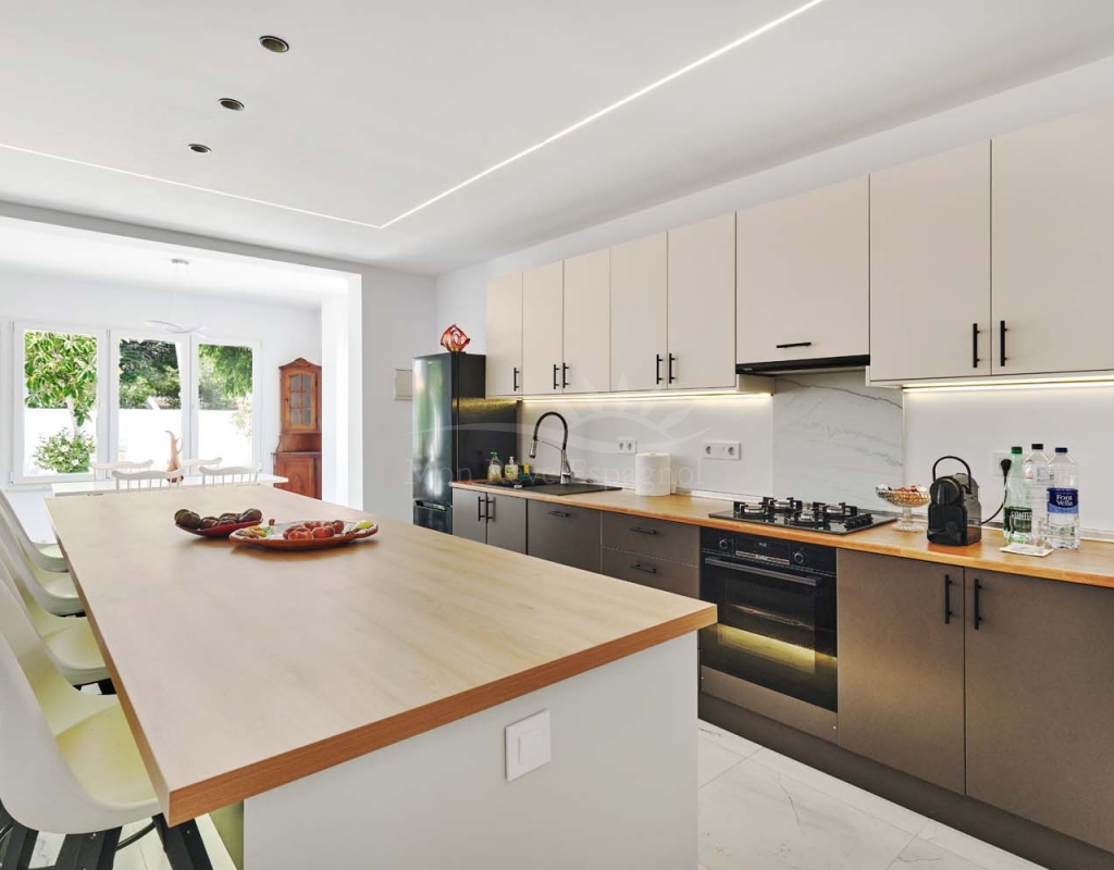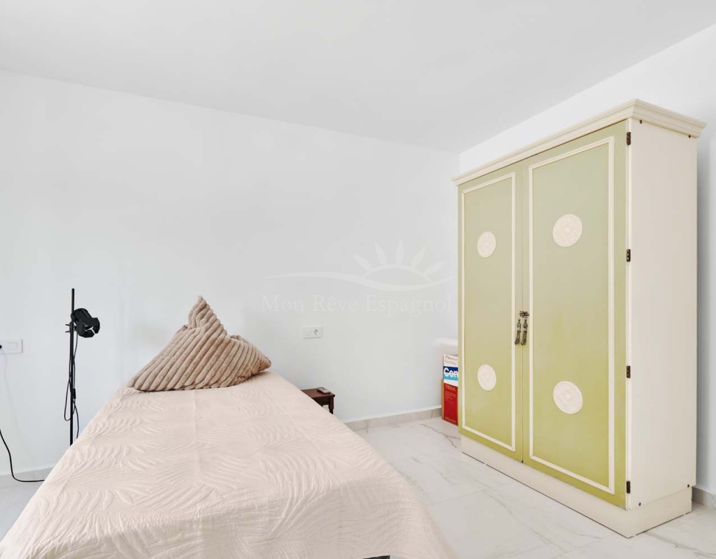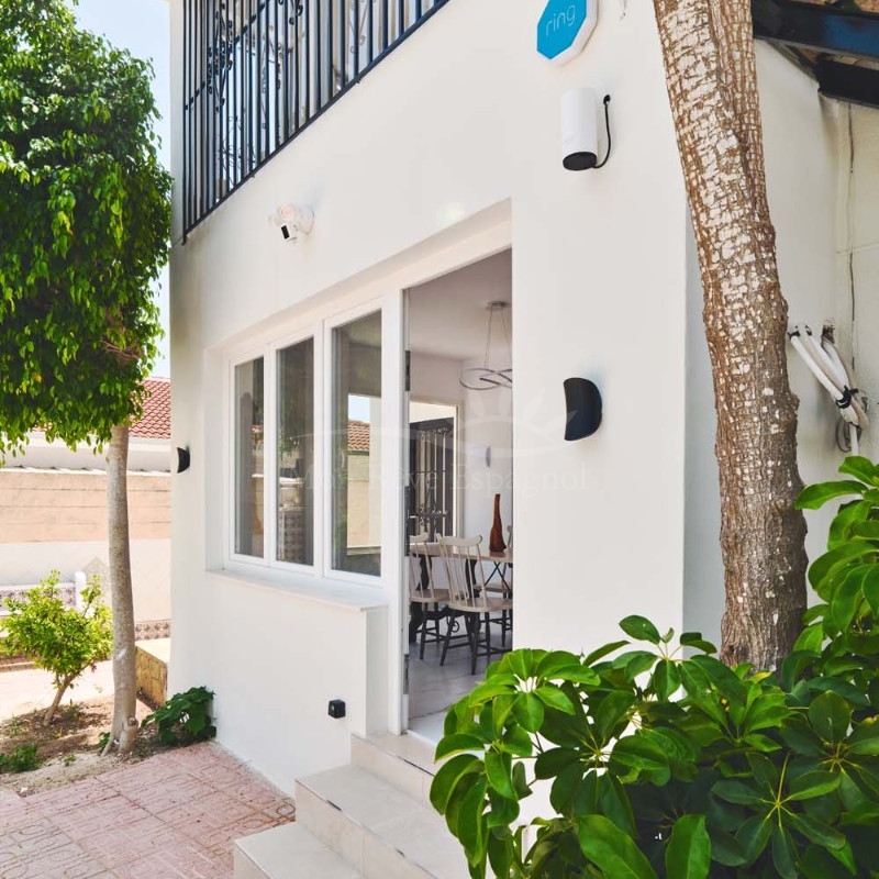 On the ground floor accessed via a glass door which opens into a spacious and bright open plan newly installed kitchen and dining room, this space really is the heart of the home with a large central island ideal for dining, working space or entertaining. To the right of the kitchen is a hallway which leads to a large bedroom, family bathroom and a smaller second bedroom which could also be used as an office or dressing room if preferred. To the rear of the kitchen is a living room with plenty of space for a dining area, there is a door from the living area which leads out to a lovely covered terrace at the side of the plot. A second door from the living room leads to the large master bedroom, there is air conditioning and patio doors which flood the room with light and lead to a terrace overlooking the green area.