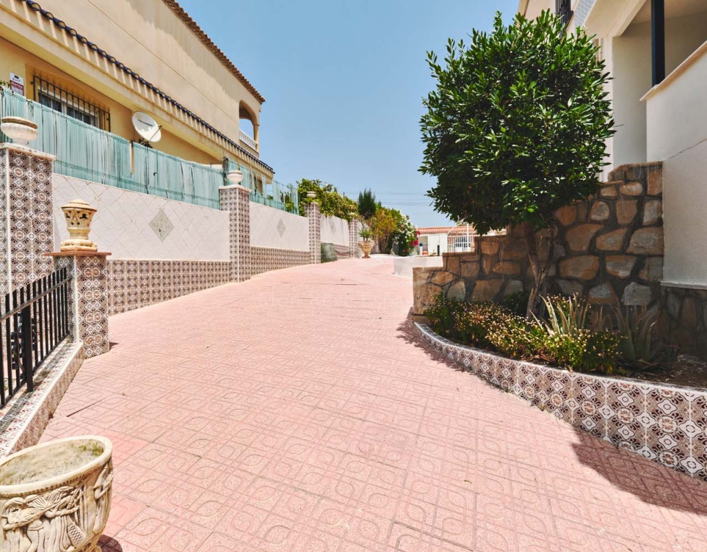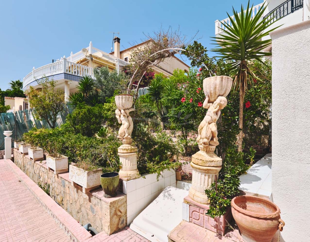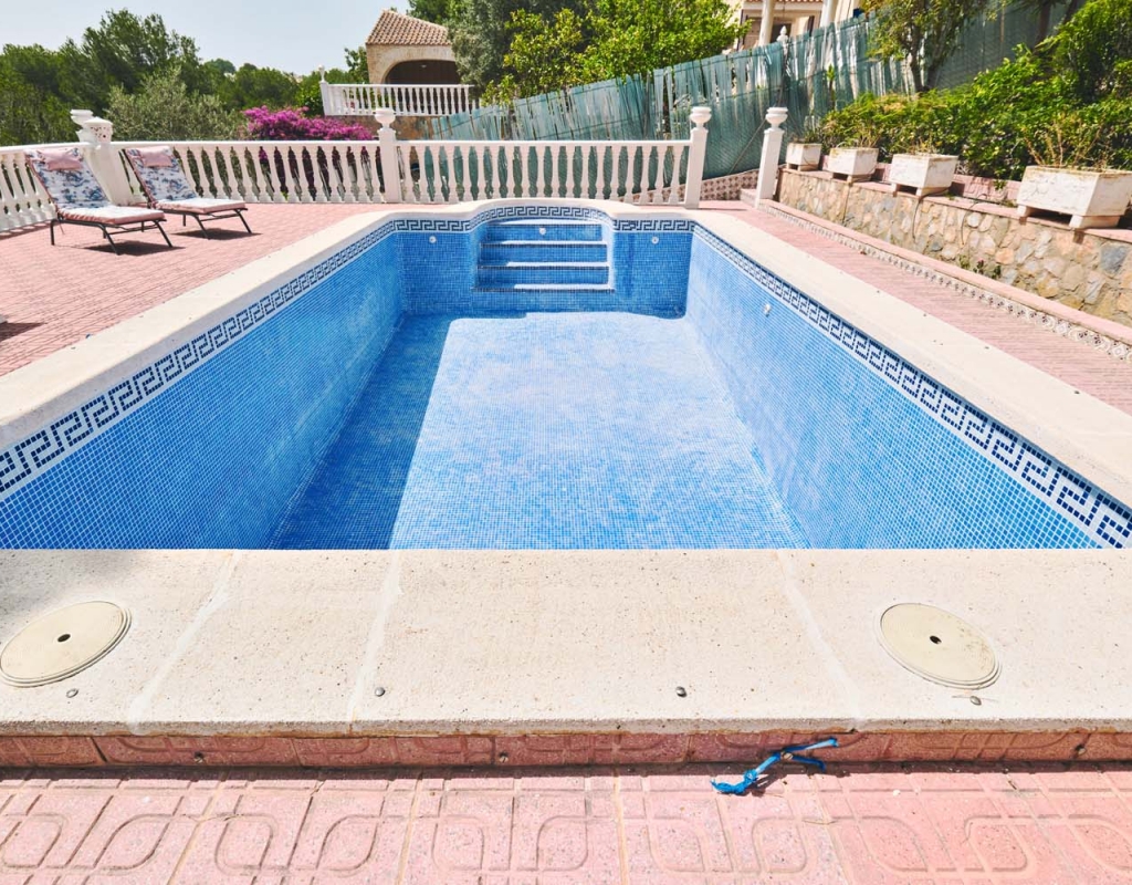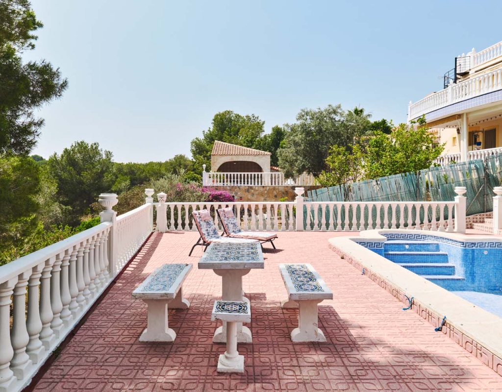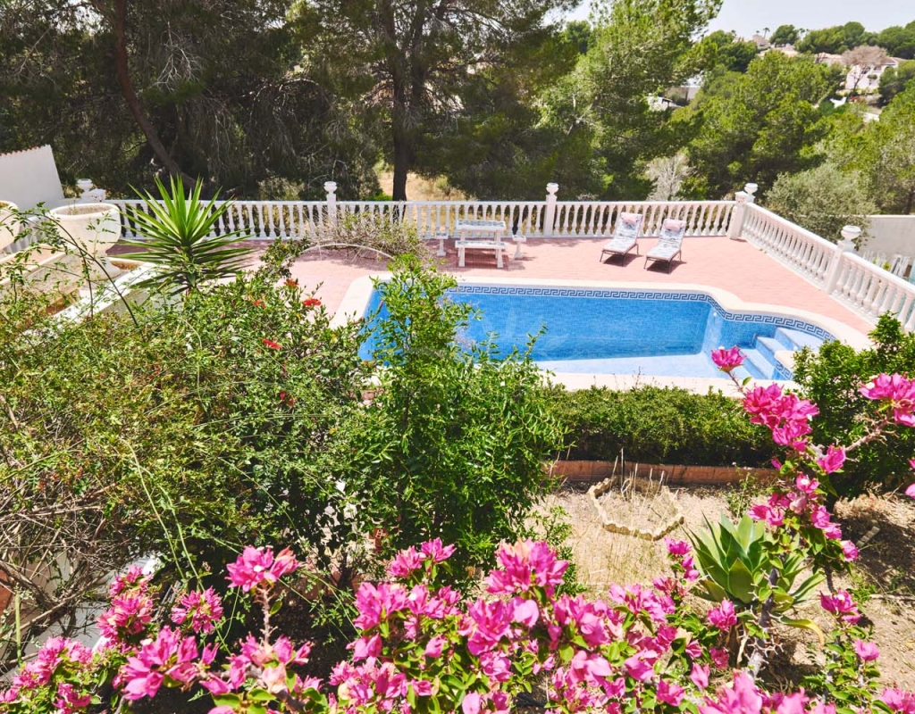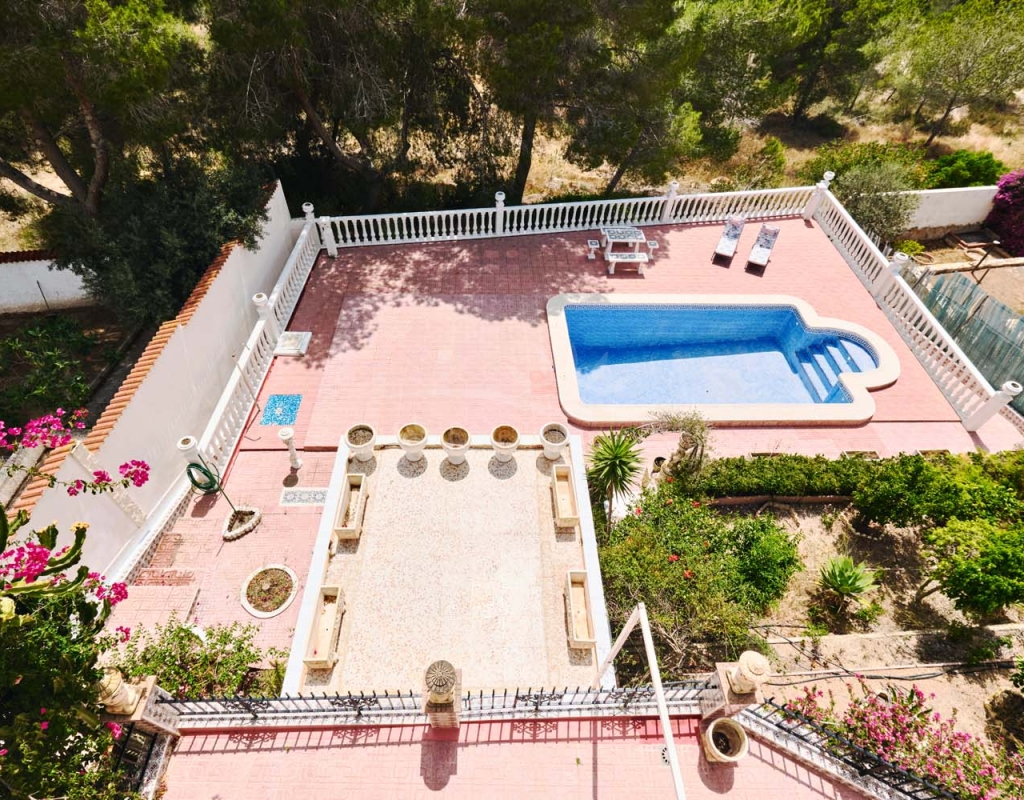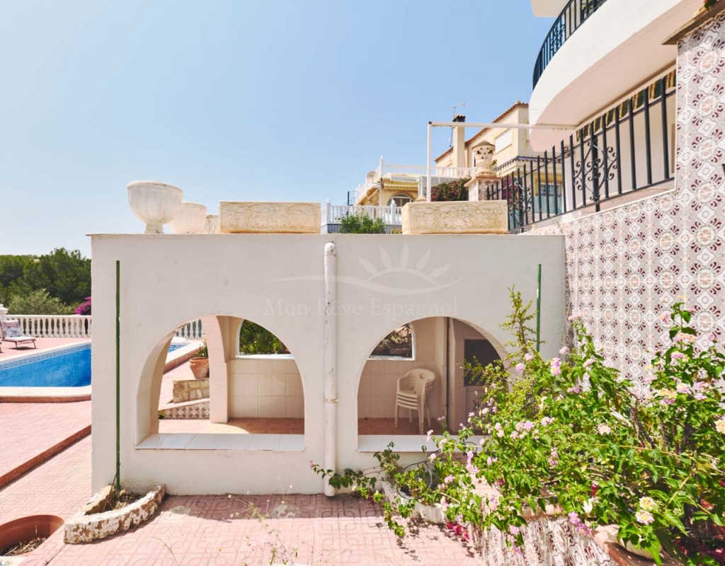 A few steps at the side of the villa lead down to the pool area which located at the rear of the plot backs onto the green area and there is even a gate to give you direct access. The pool area is full tiled and there is a outside bar with brick built BBQ and covered seating area, this space is ideal for entertaining or spending the day by the pool with family and friends. There is a large storage area below the pool and the owner will be selling the property furnished.