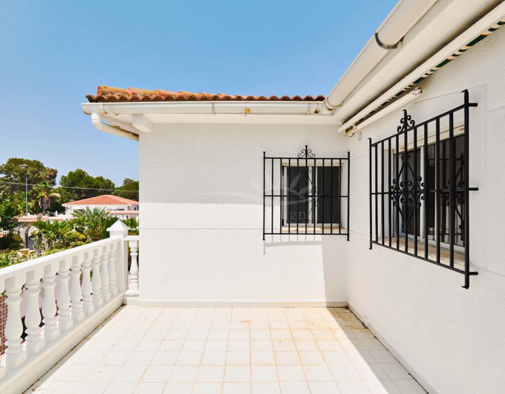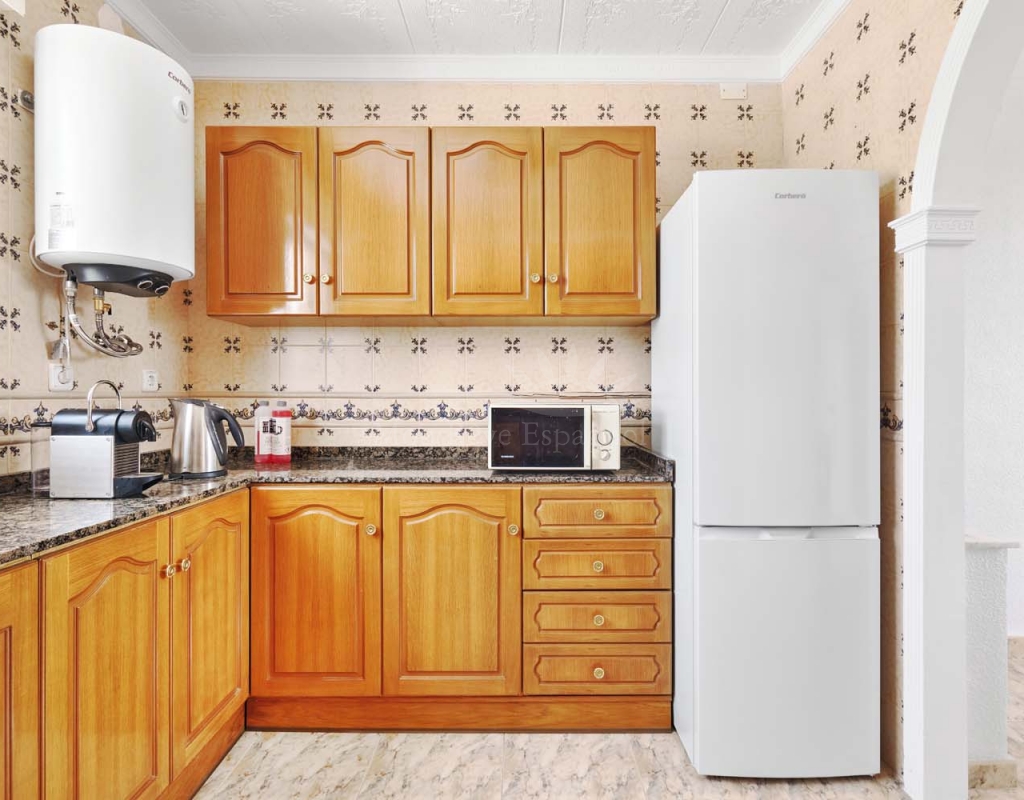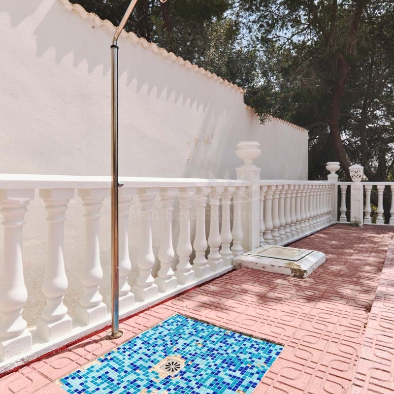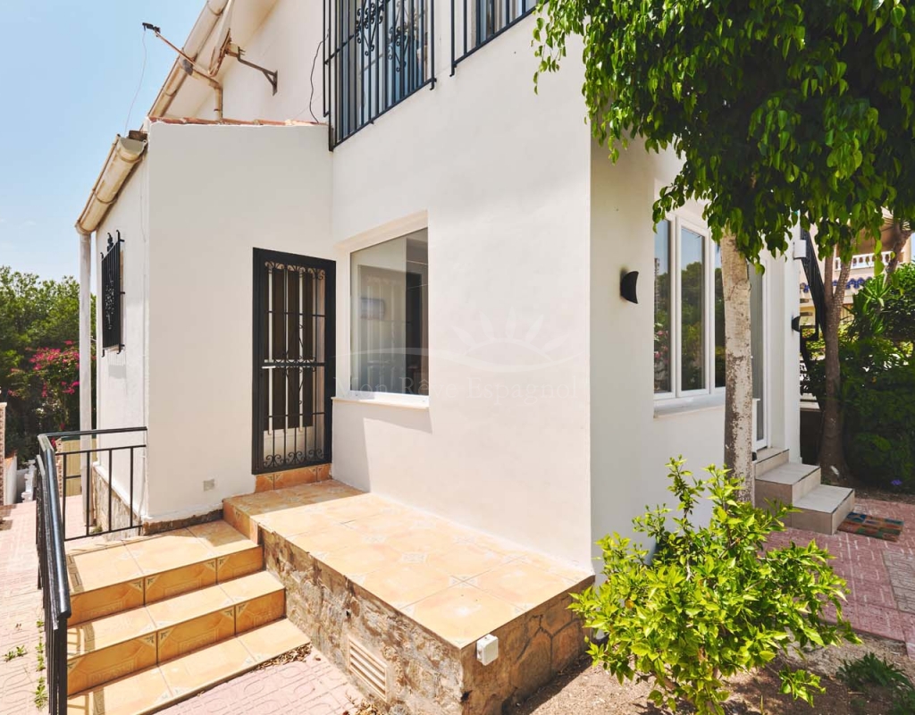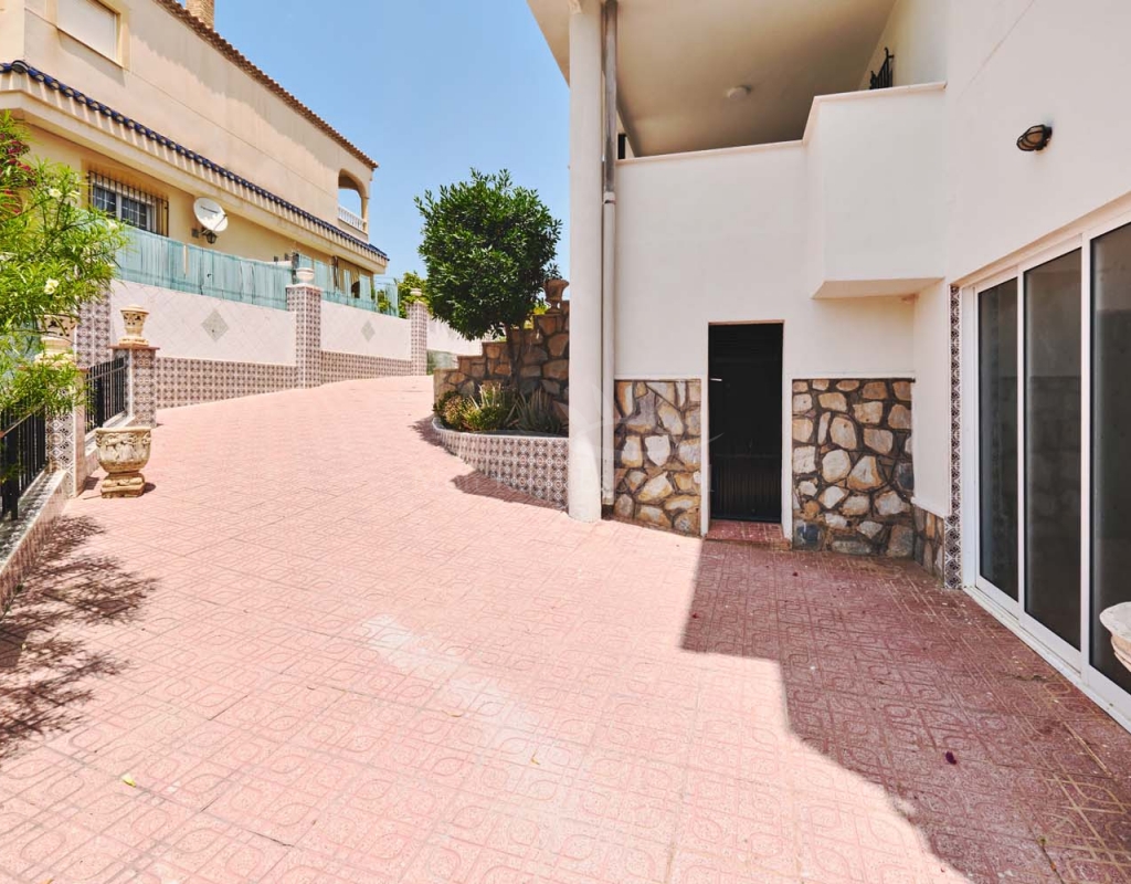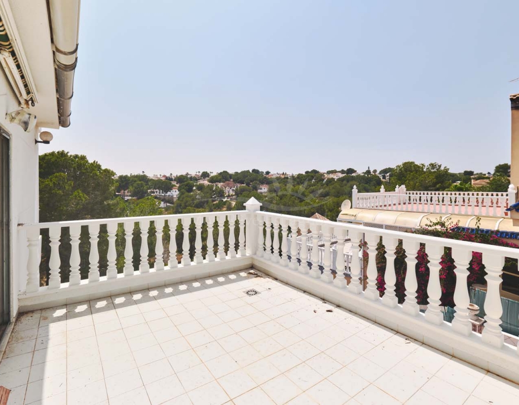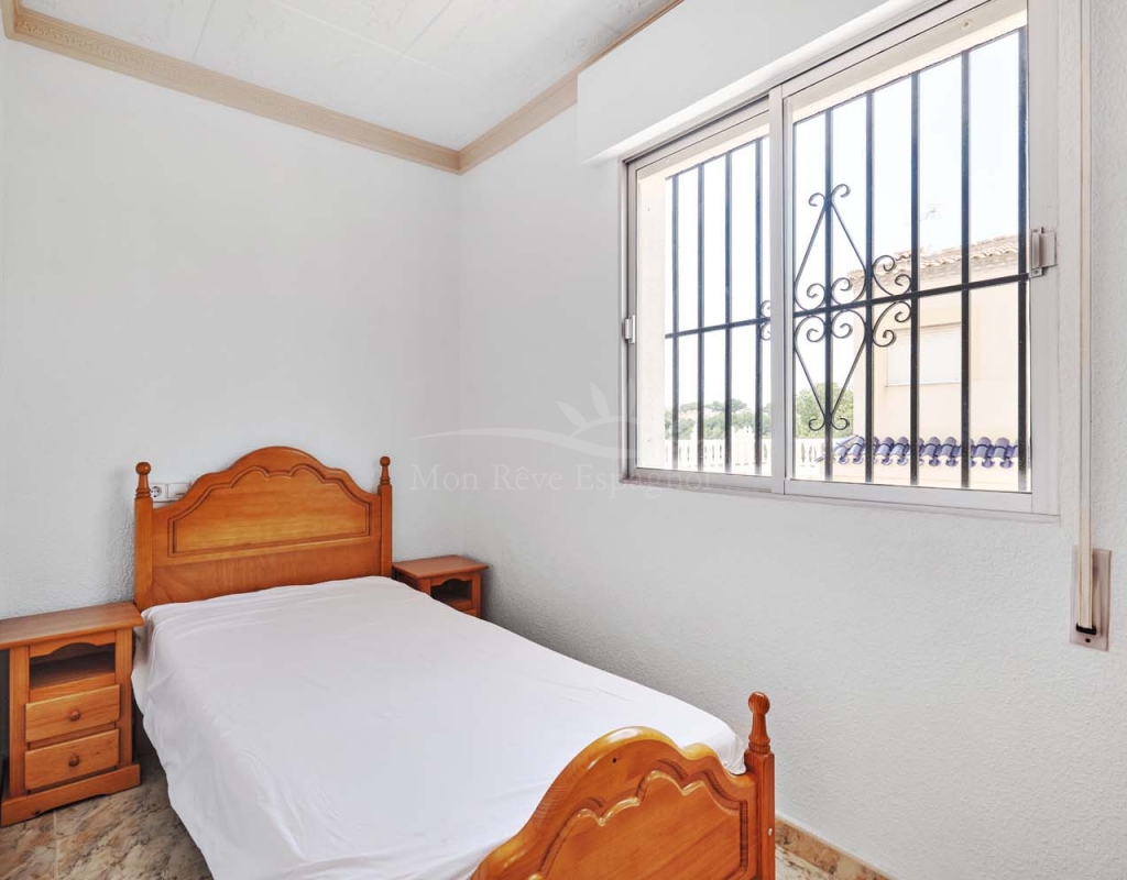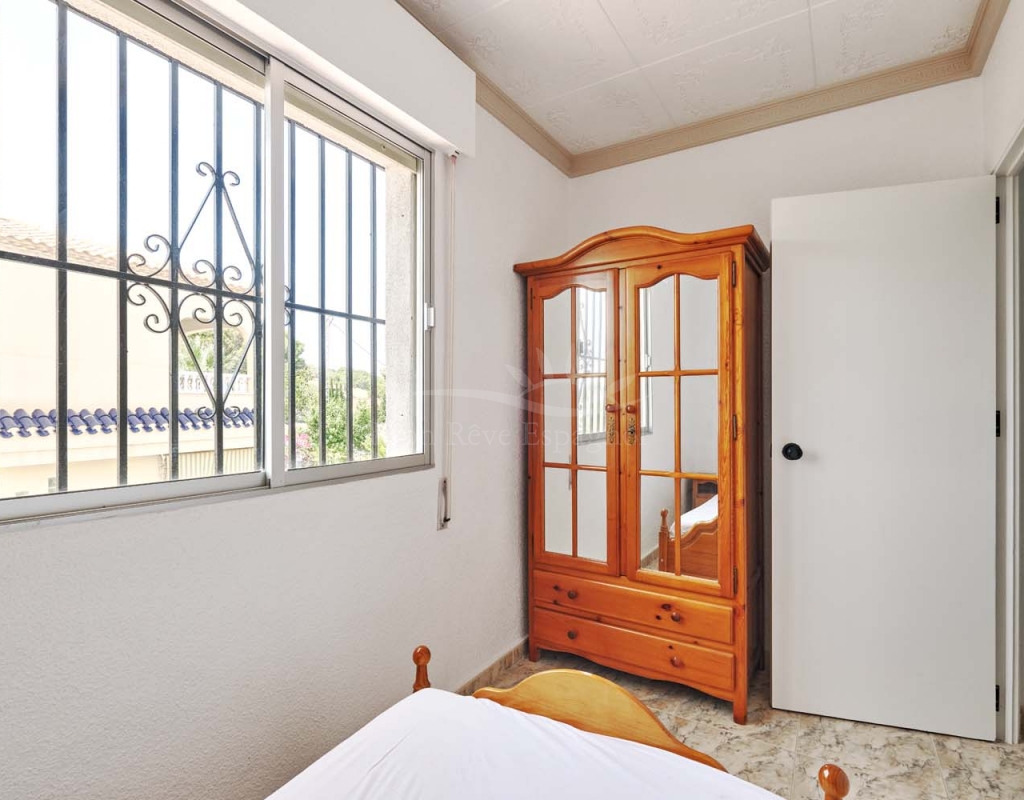A few steps at the side of the villa lead down to the pool area which located at the rear of the plot backs onto the green area and there is even a gate to give you direct access. The pool area is full tiled and there is a outside bar with brick built BBQ and covered seating area, this space is ideal for entertaining or spending the day by the pool with family and friends. There is a large storage area below the pool and the owner will be selling the property furnished.