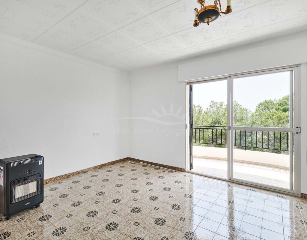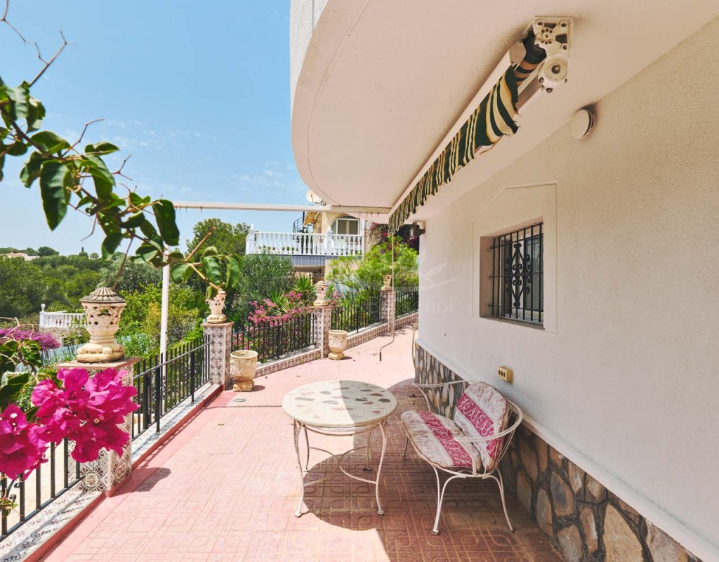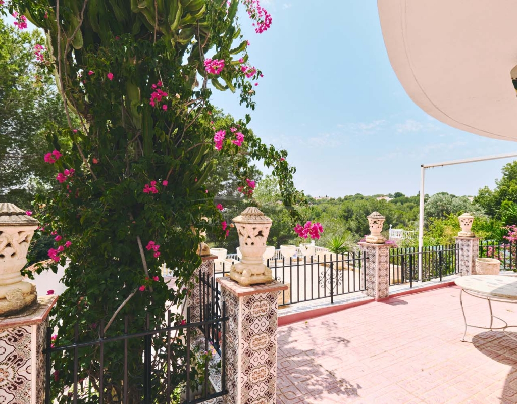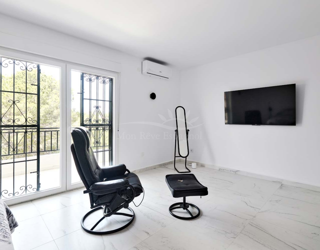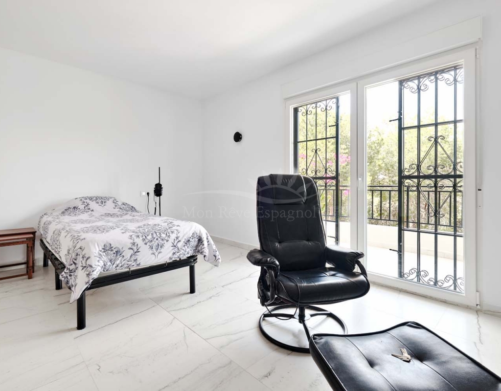 A set of external stairs from the front of the villa lead to the top floor of the property and the second half of the living space, this space is ideal for visitors as it can be locked up when not in use but allows any guests plenty of space with their own independent access. The top floor consists of a glazed room at the front which overlooks the garden, a spacious living room, large separate fully fitted kitchen, family bathroom, double bedroom and smaller single bedroom as with the ground floor. At the rear of the property is another large master bedroom with patio doors onto a terrace to enjoy those lovely countryside views at the rear, there is also a second door leading to another terrace with sun awning.