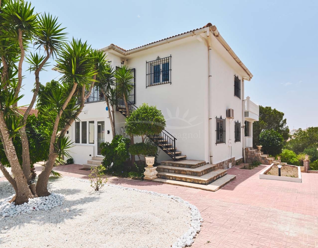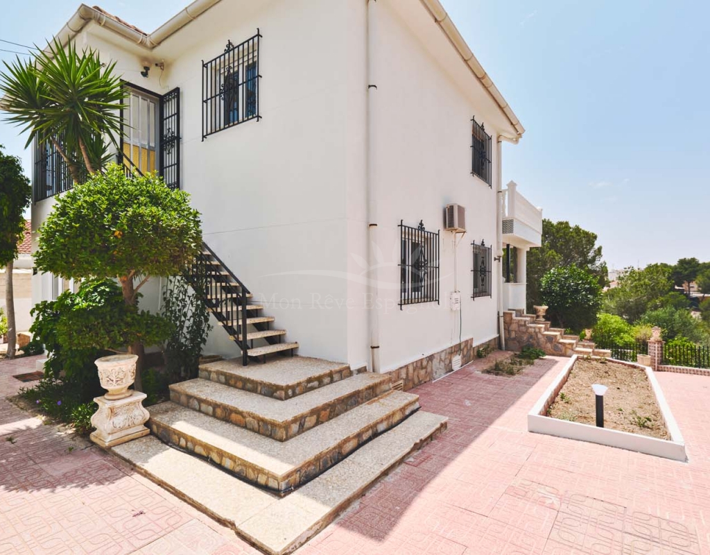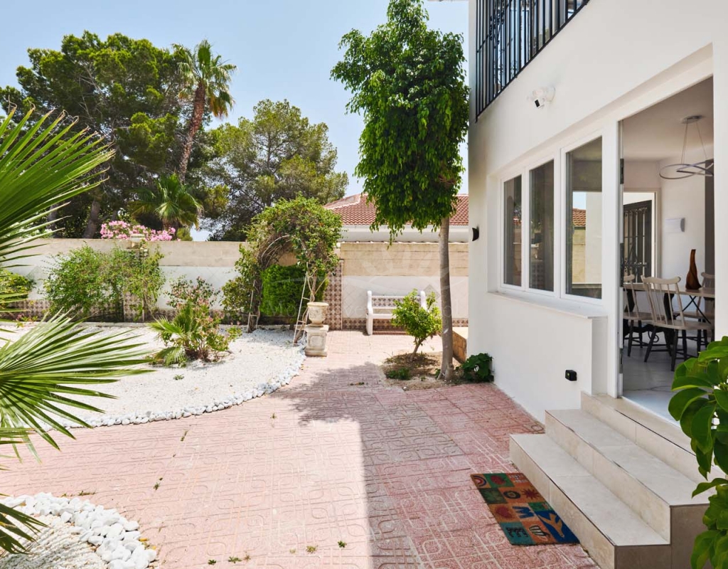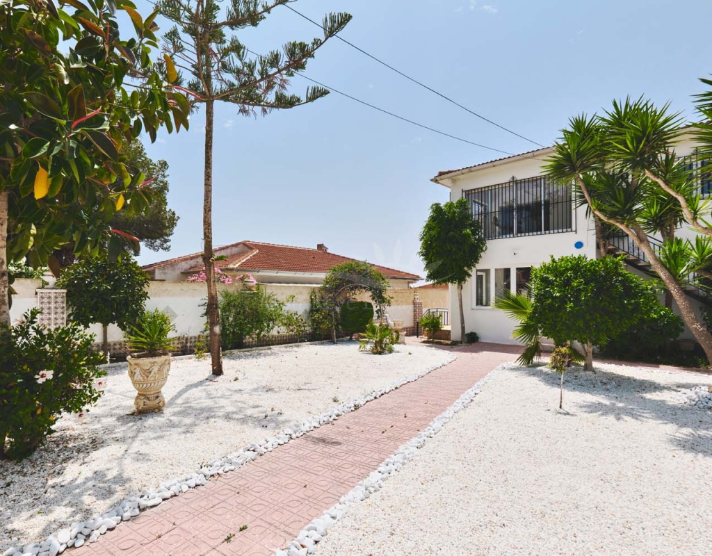 Entering onto the plot you are greeted by a pretty landscaped garden with established plants and trees for greenery, there are double gates giving access to off street parking with space for several cars. The villa is currently separated into two separate spaces which is ideal for visiting family and friends.