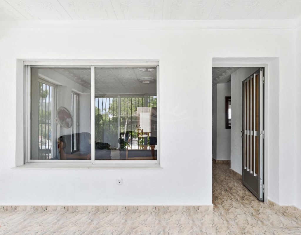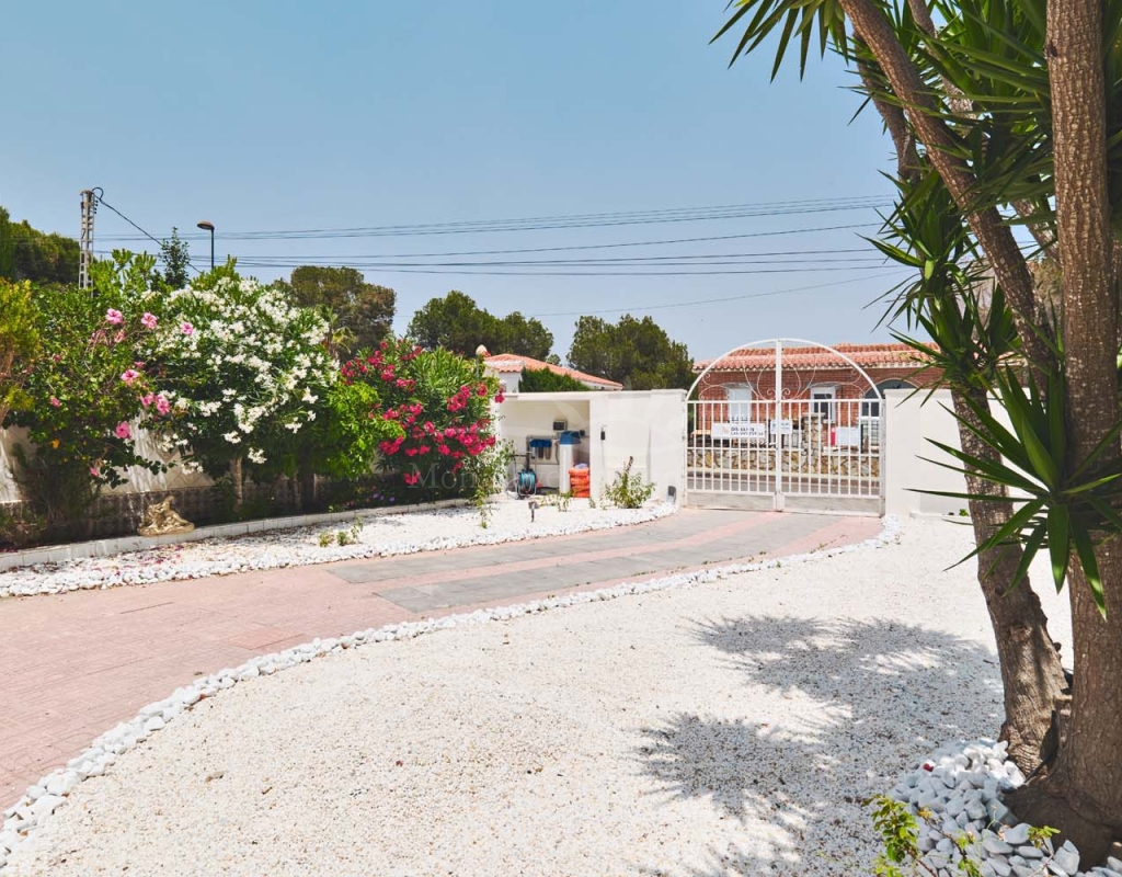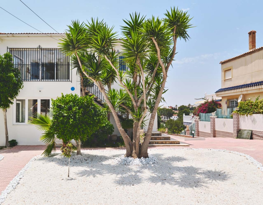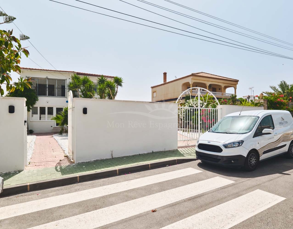 Entering onto the plot you are greeted by a pretty landscaped garden with established plants and trees for greenery, there are double gates giving access to off street parking with space for several cars. The villa is currently separated into two separate spaces which is ideal for visiting family and friends.