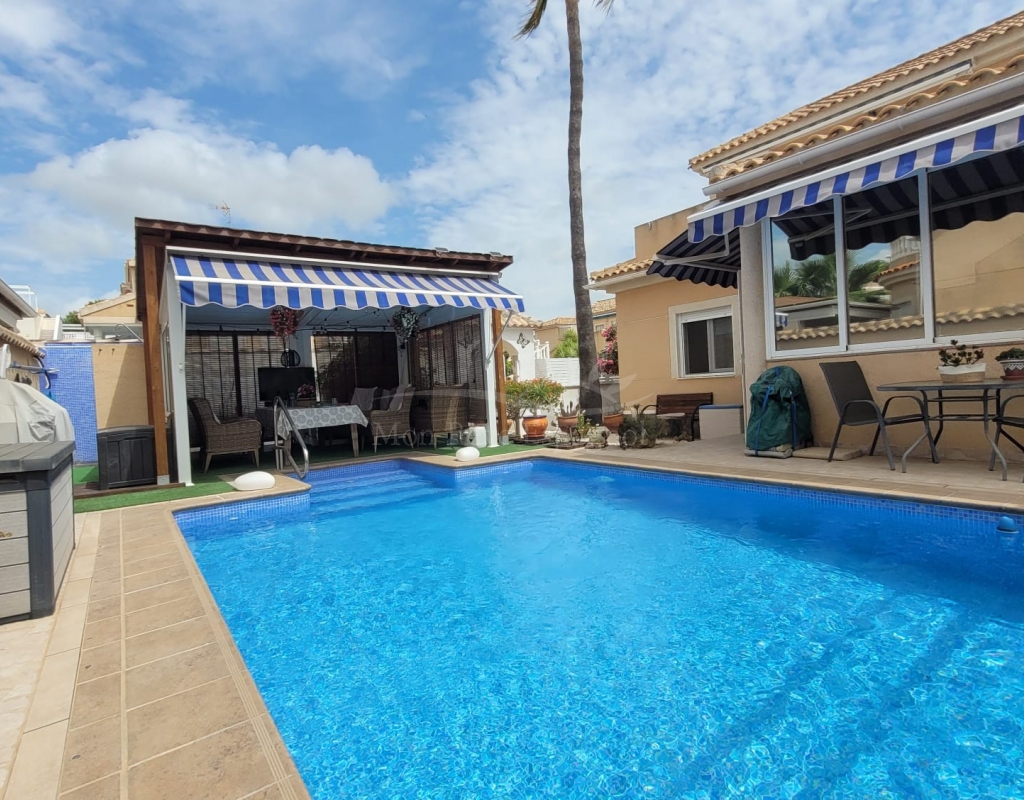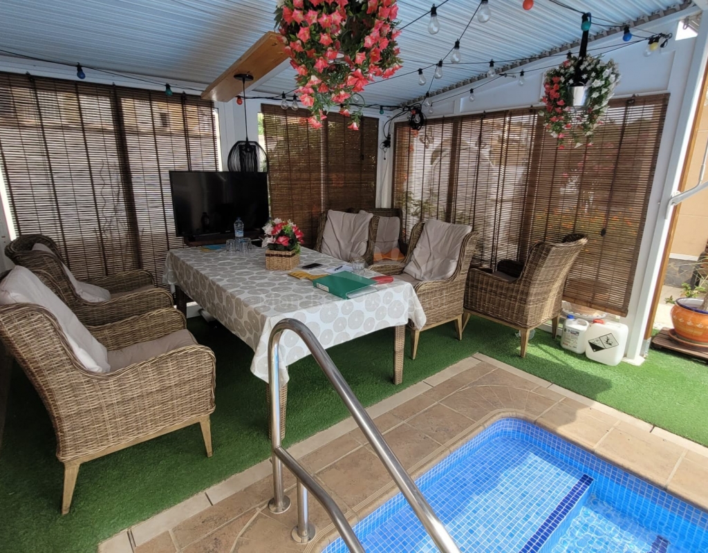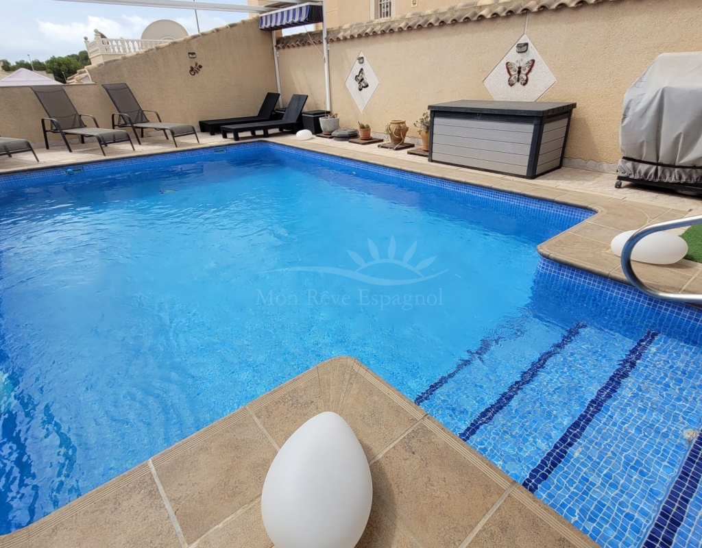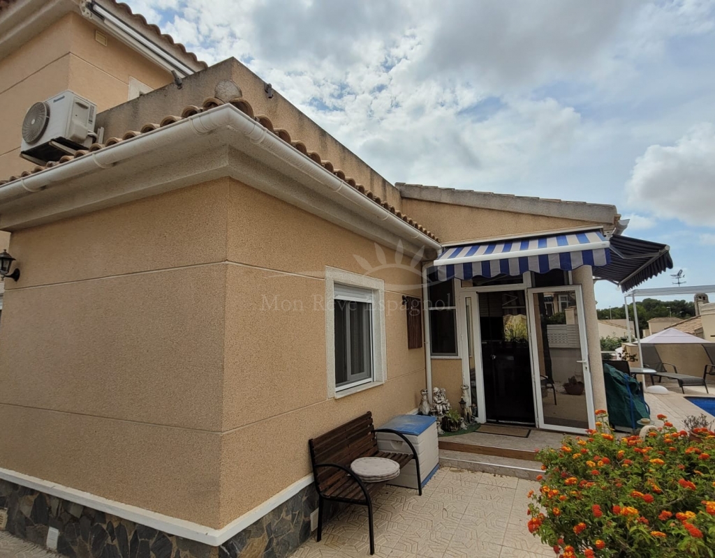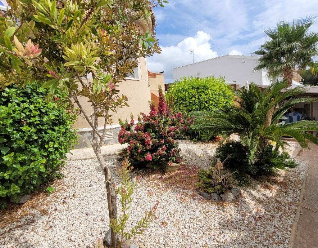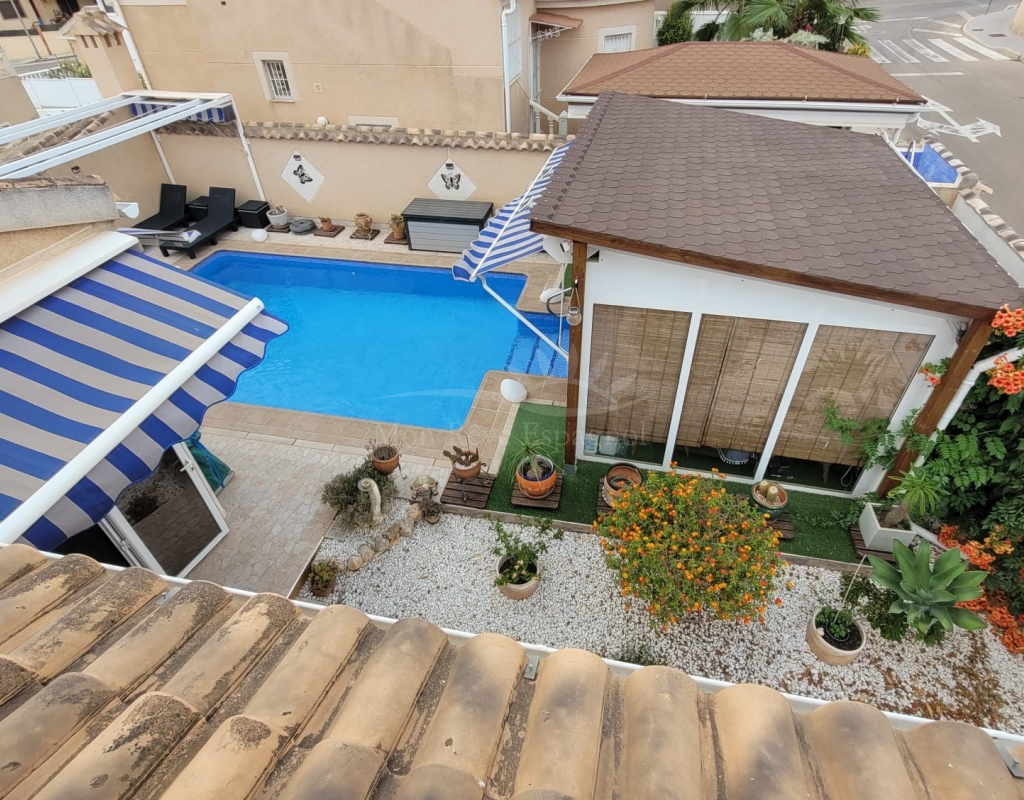 South-facing villa with sea views from the solarium, a separate guest apartment, and a private pool in Pinar de Campoverde. This south-facing property enjoys an ideal location within walking distance of green areas and the Río Seco River. The property sits on a flat, easy-maintain garden of approximately 365 m².