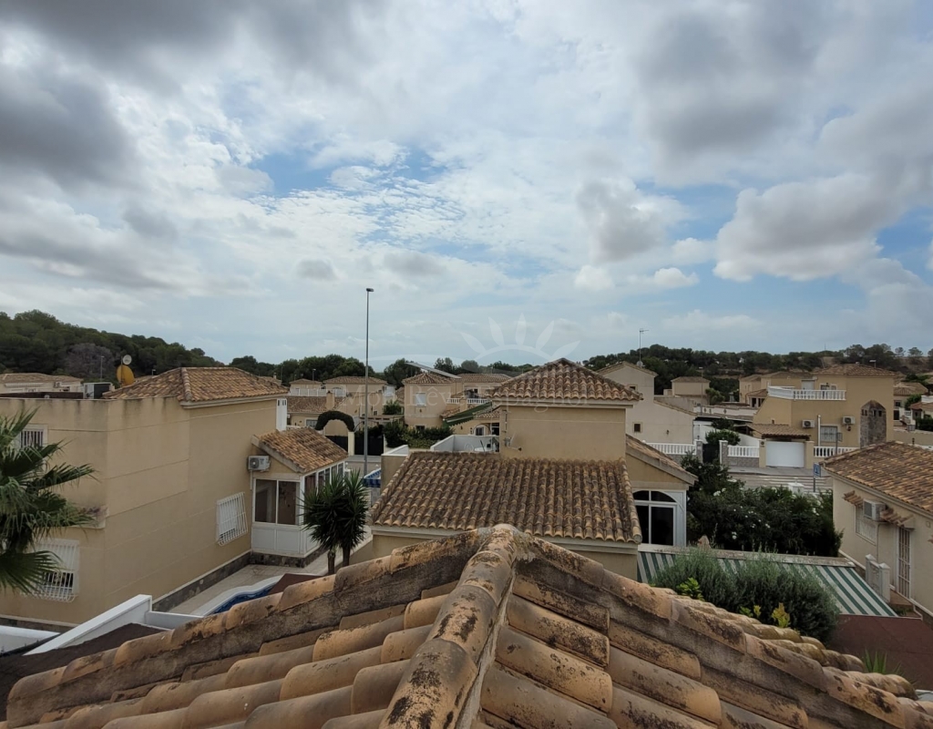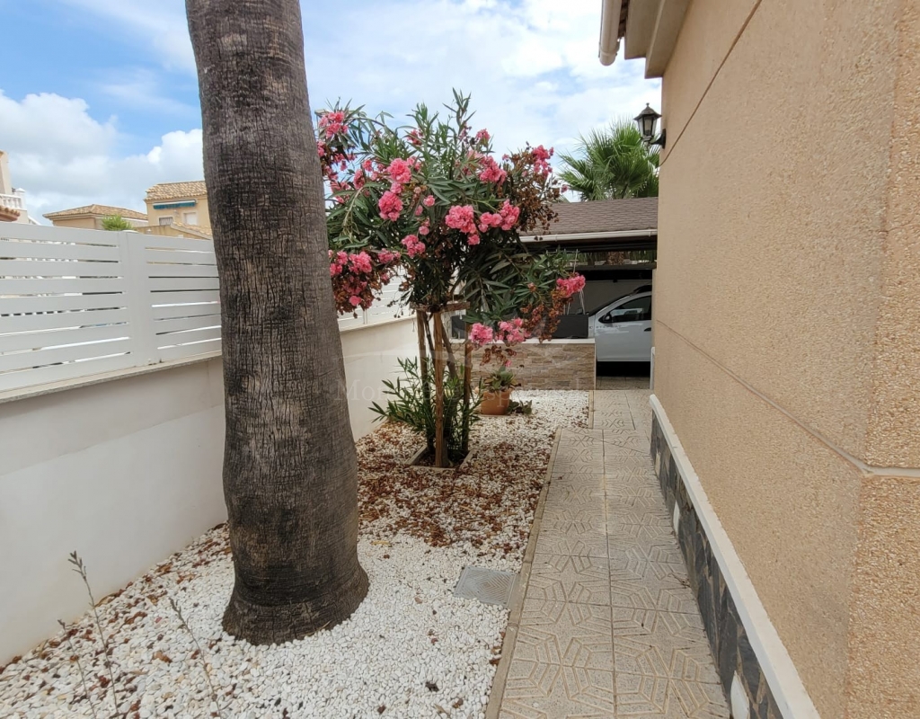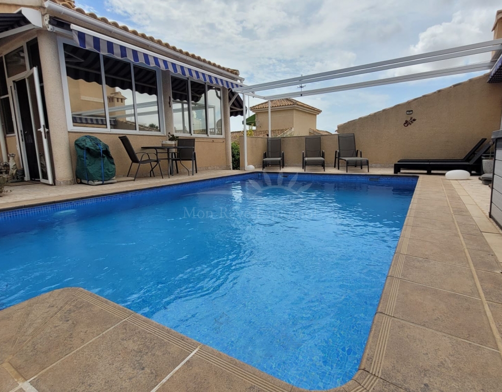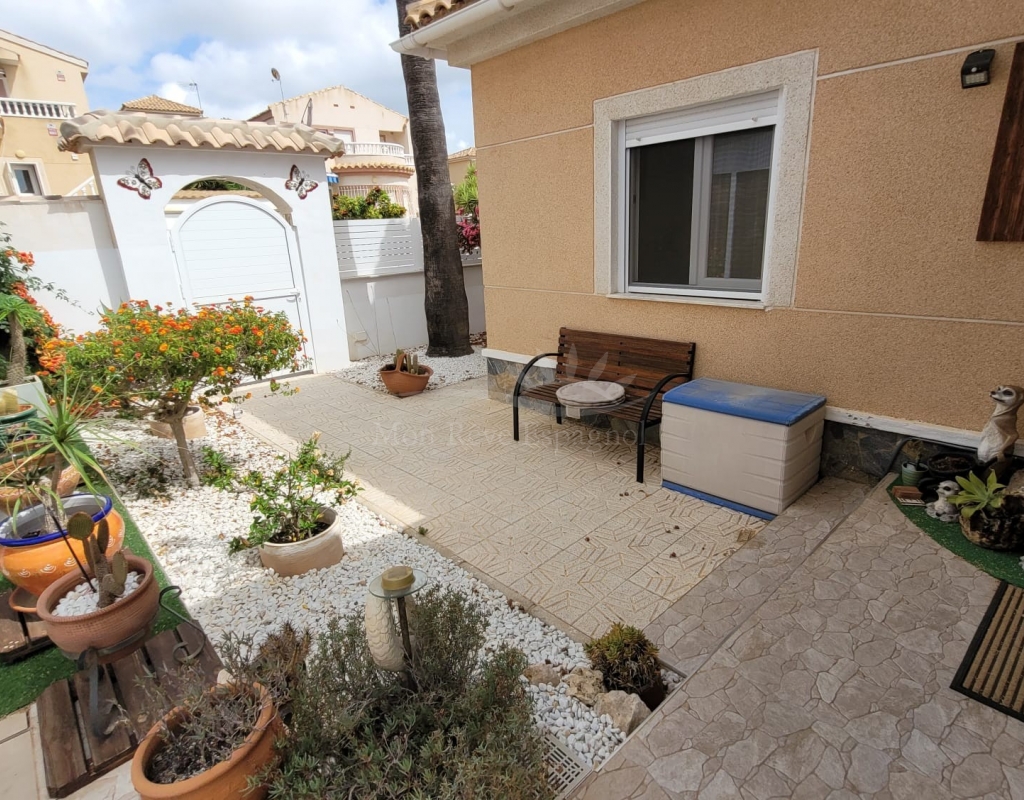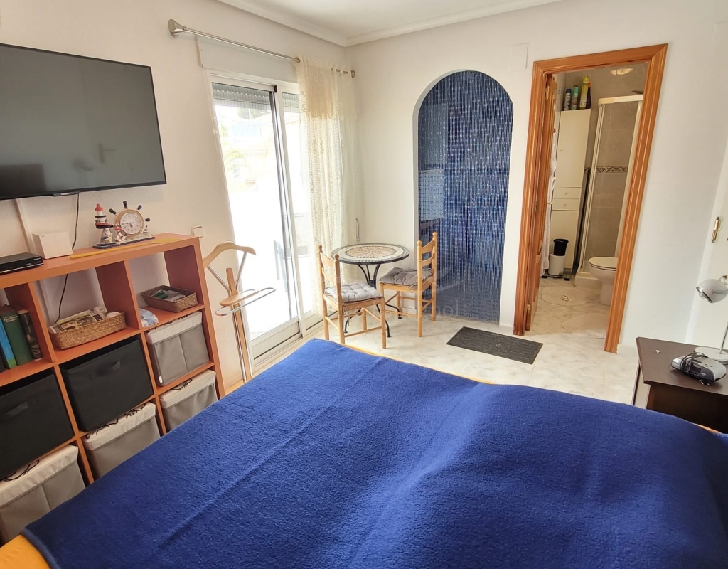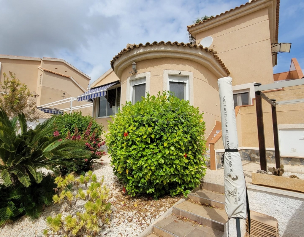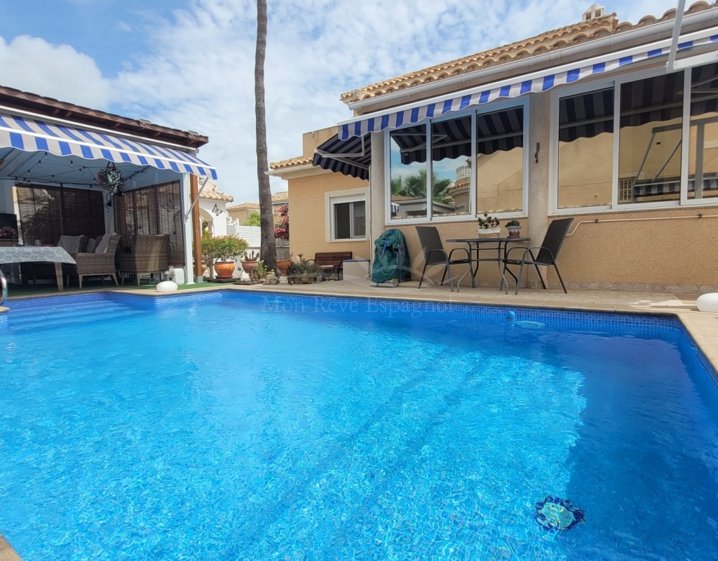 South-facing villa with sea views from the solarium, a separate guest apartment, and a private pool in Pinar de Campoverde. This south-facing property enjoys an ideal location within walking distance of green areas and the Río Seco River. The property sits on a flat, easy-maintain garden of approximately 365 m².