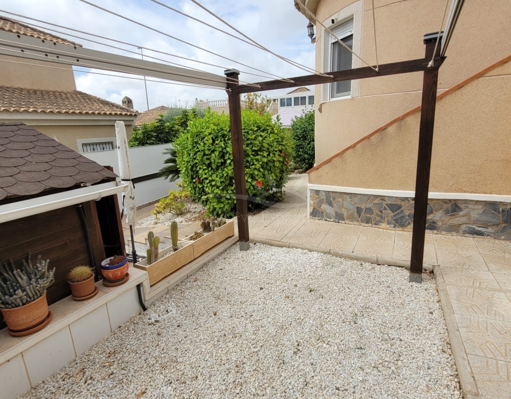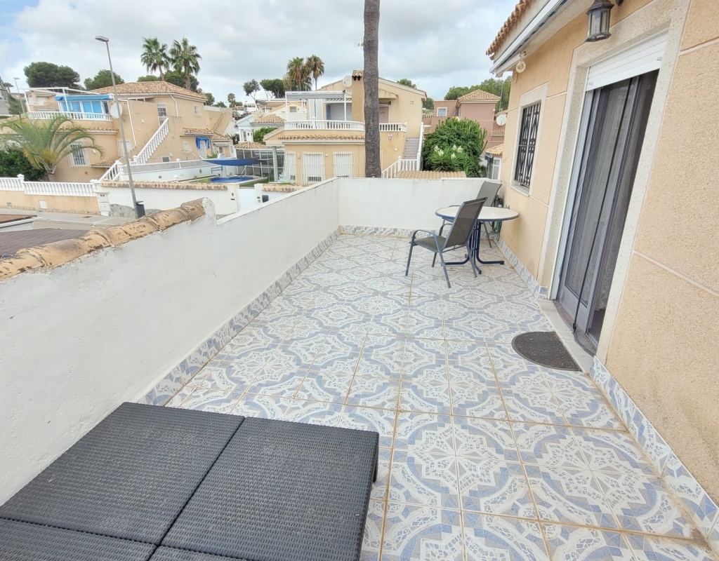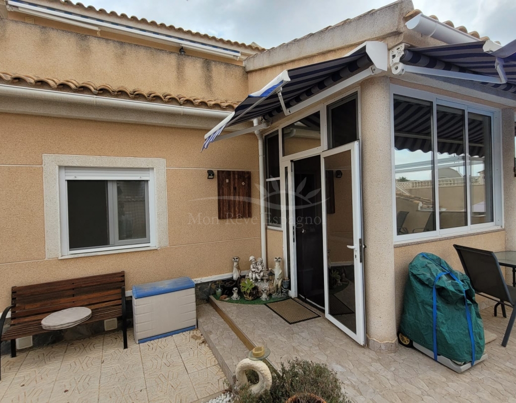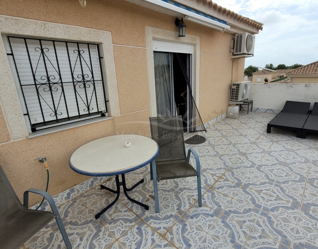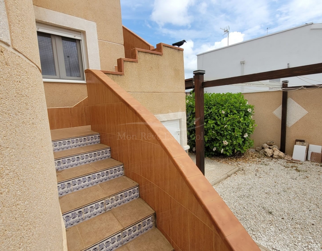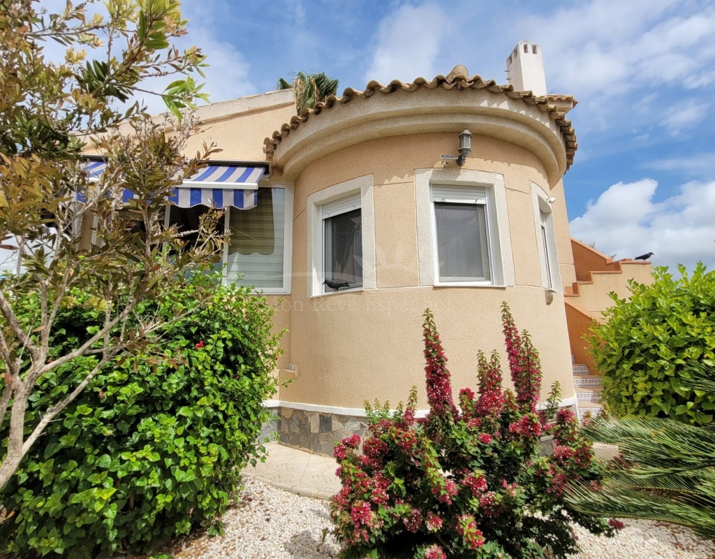South-facing villa with sea views from the solarium, a separate guest apartment, and a private pool in Pinar de Campoverde. This south-facing property enjoys an ideal location within walking distance of green areas and the Río Seco River. The property sits on a flat, easy-maintain garden of approximately 365 m².