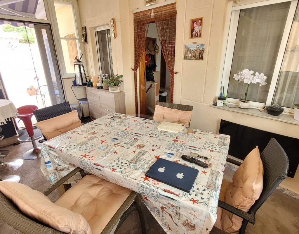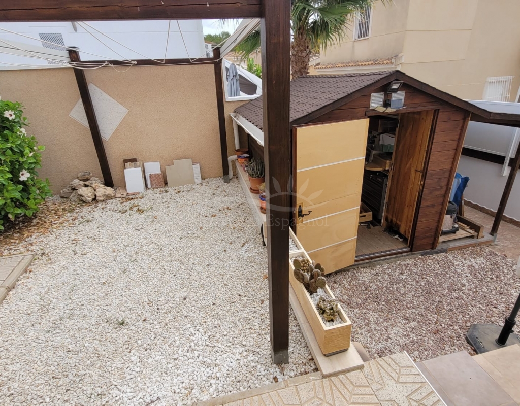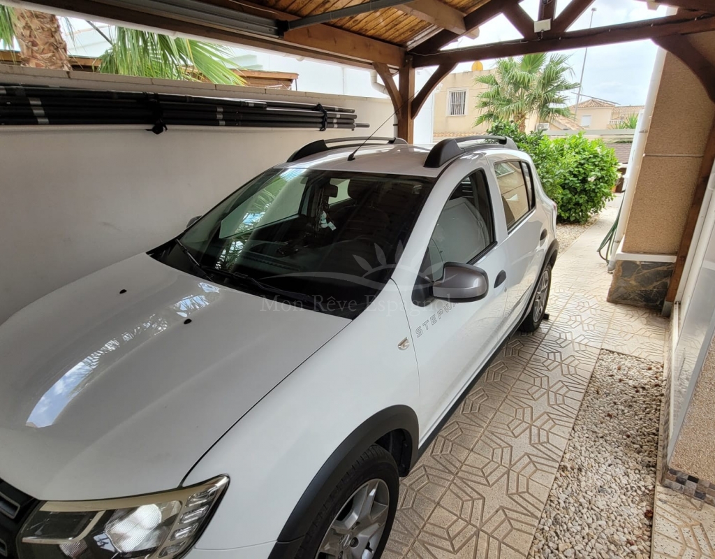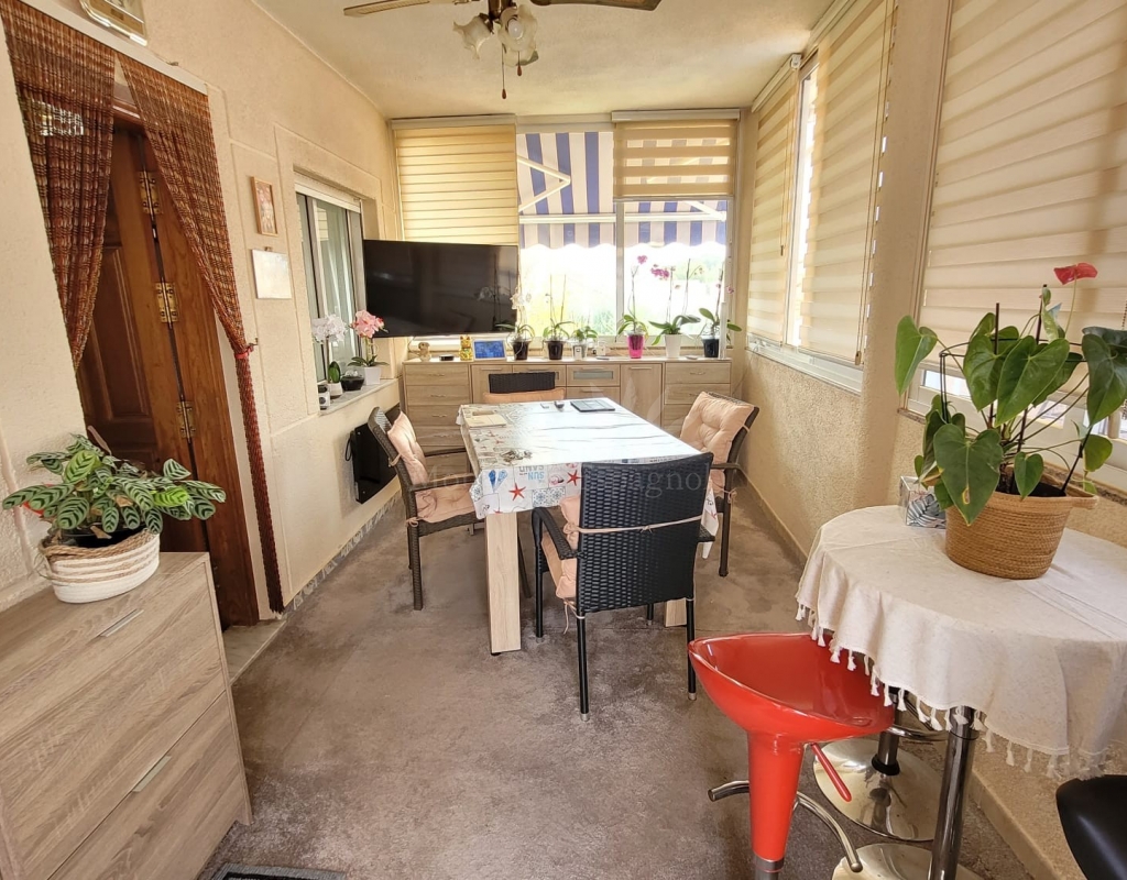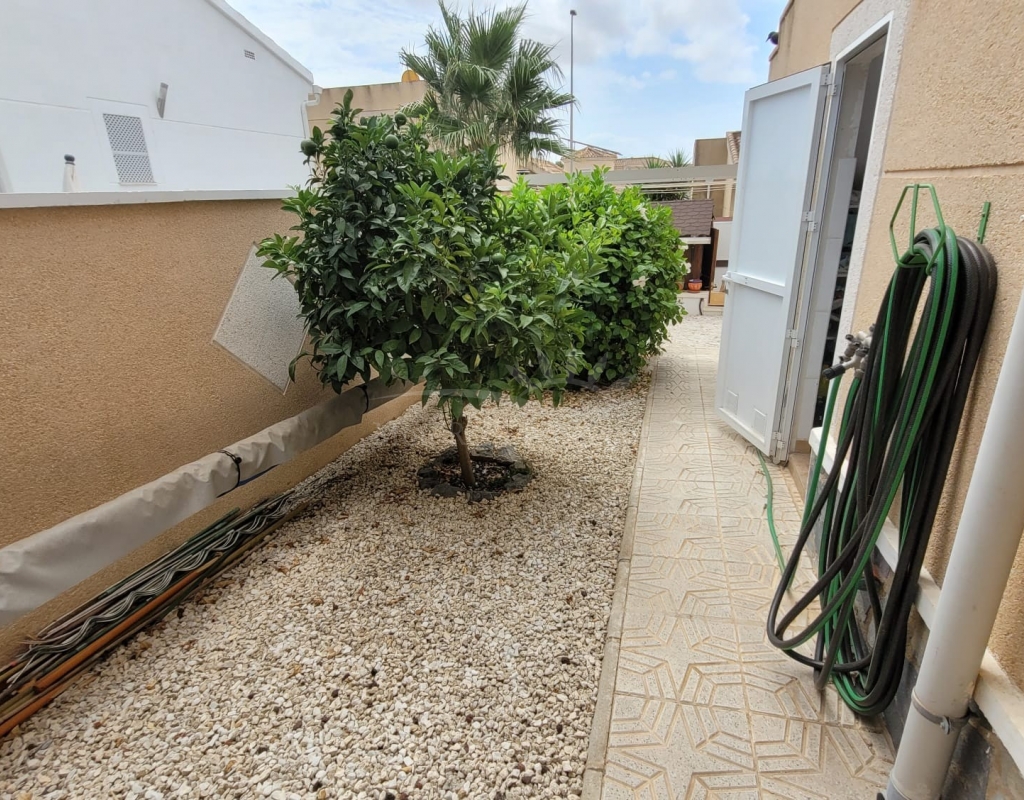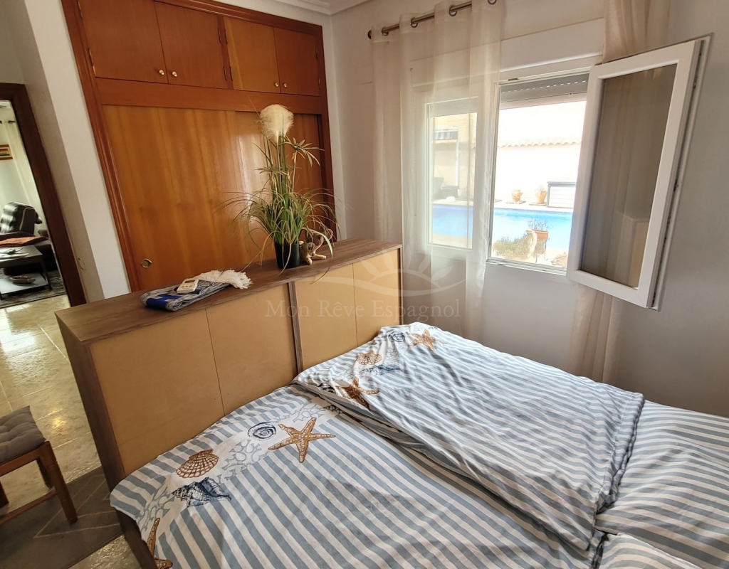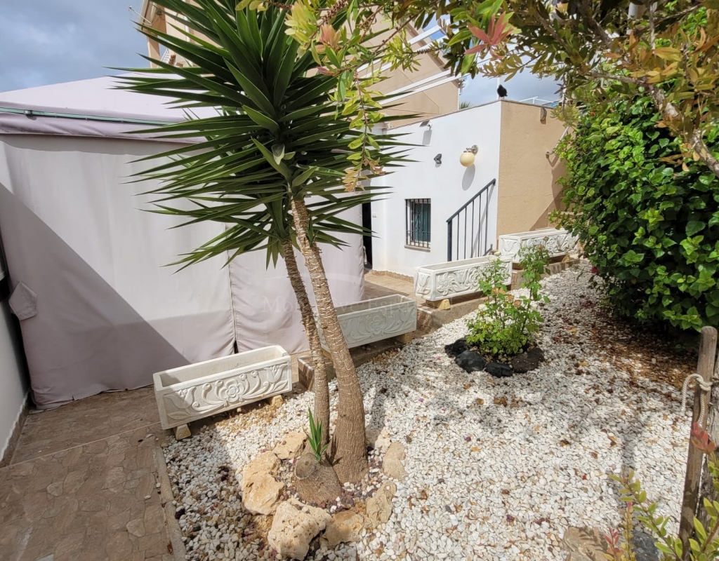 South-facing villa with sea views from the solarium, a separate guest apartment, and a private pool in Pinar de Campoverde. This south-facing property enjoys an ideal location within walking distance of green areas and the Río Seco River. The property sits on a flat, easy-maintain garden of approximately 365 m².