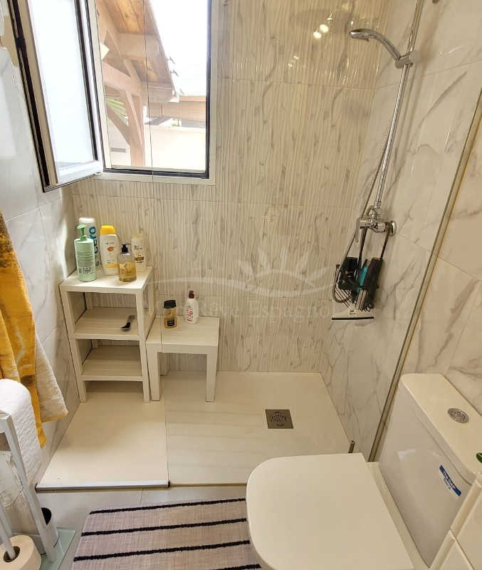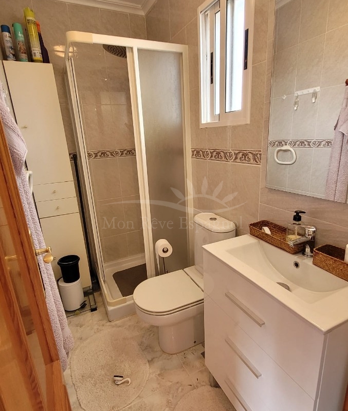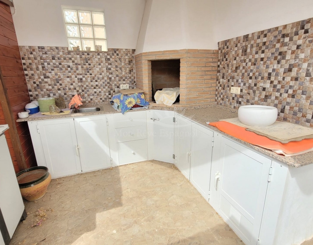 The main house is accessed through a glazed terrace, ideal for enjoying the sun and garden views. The terrace leads to a spacious living-dining room and a fully equipped open-plan kitchen. From this floor, you access the basement, the master bedroom with built-in wardrobes, a second small bedroom, also with built-in wardrobes, and a bathroom with a shower.
