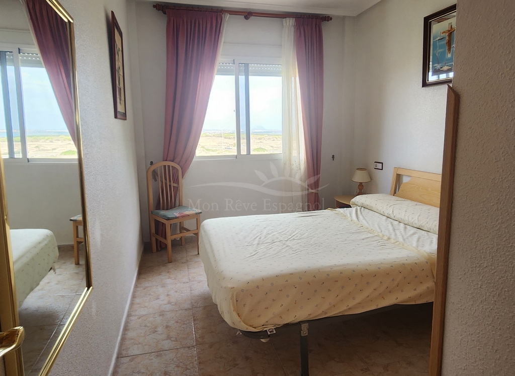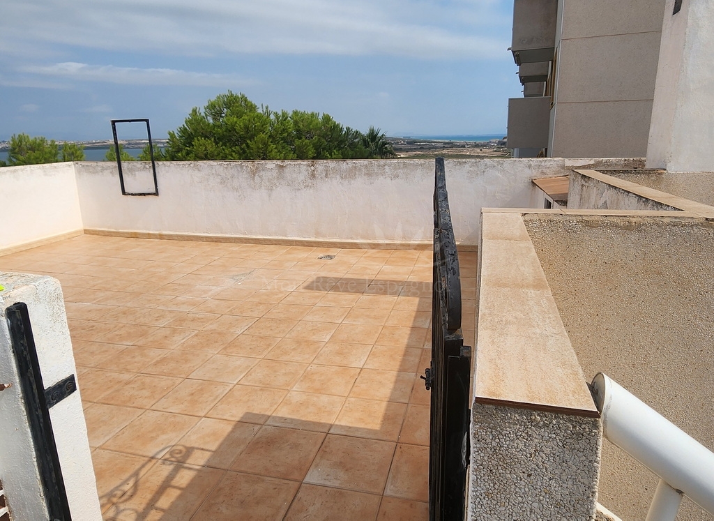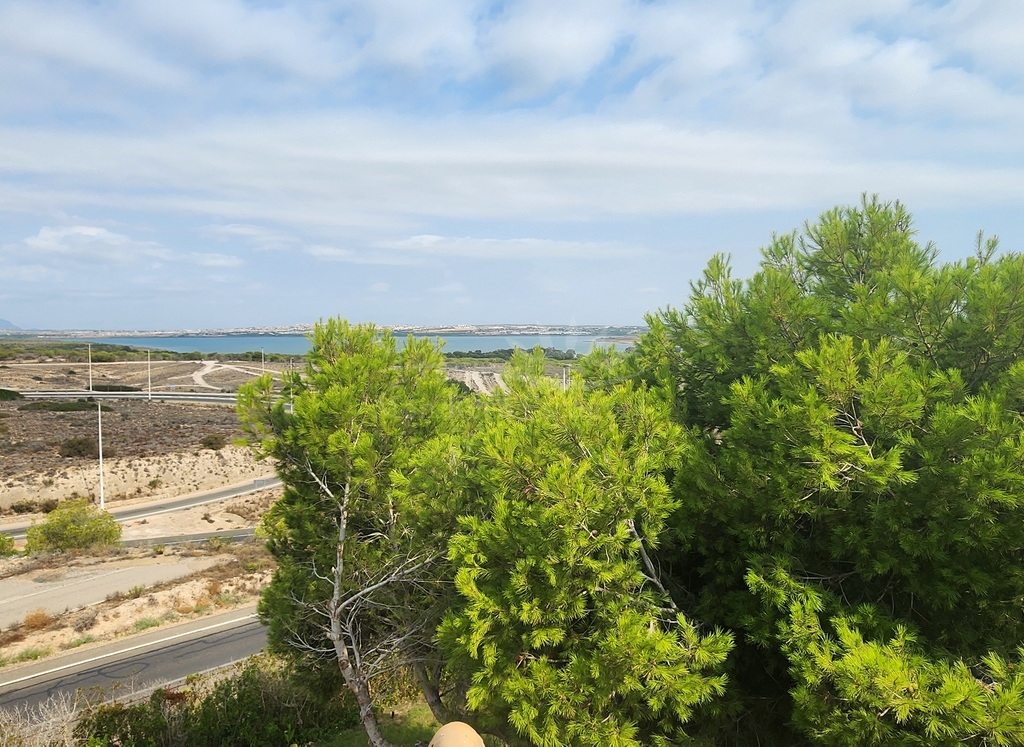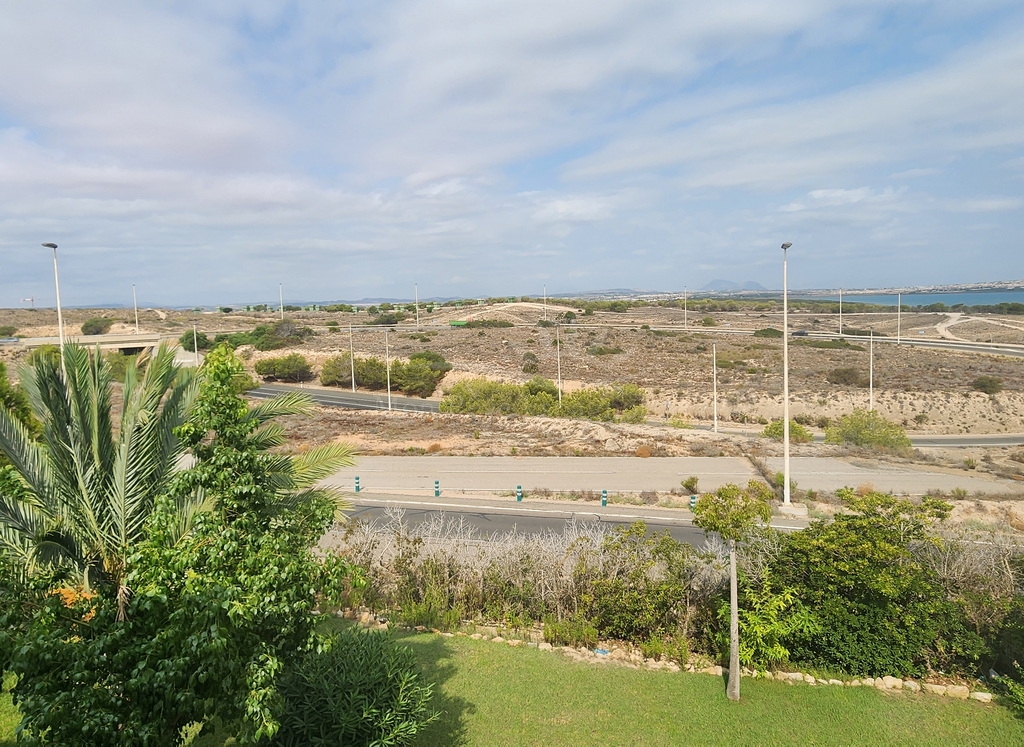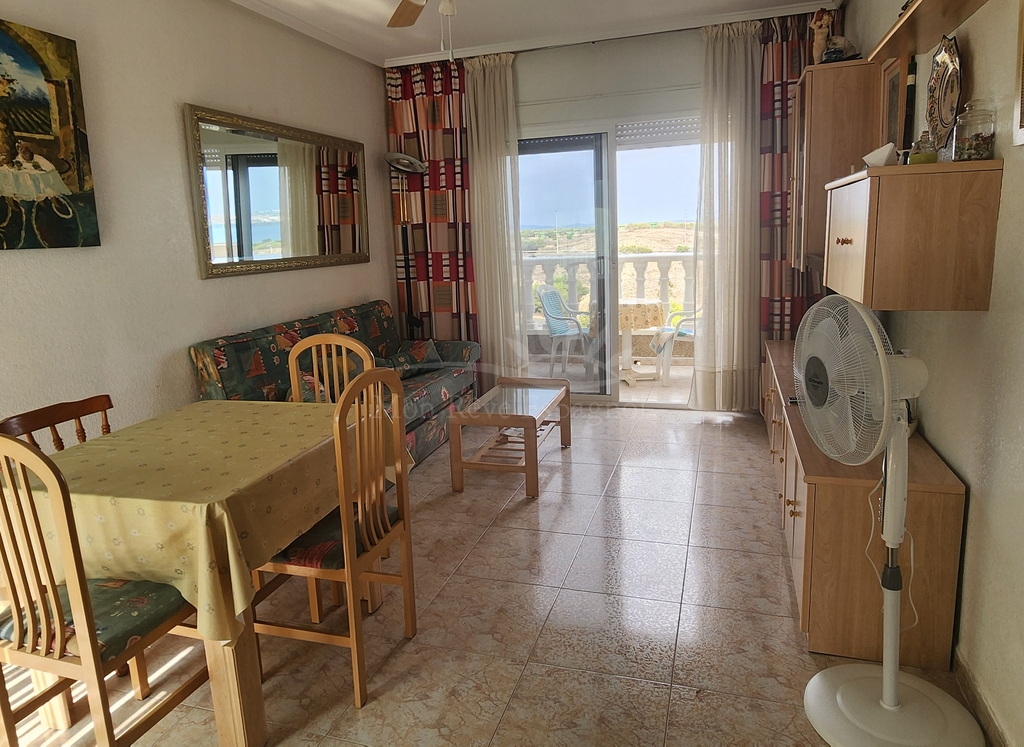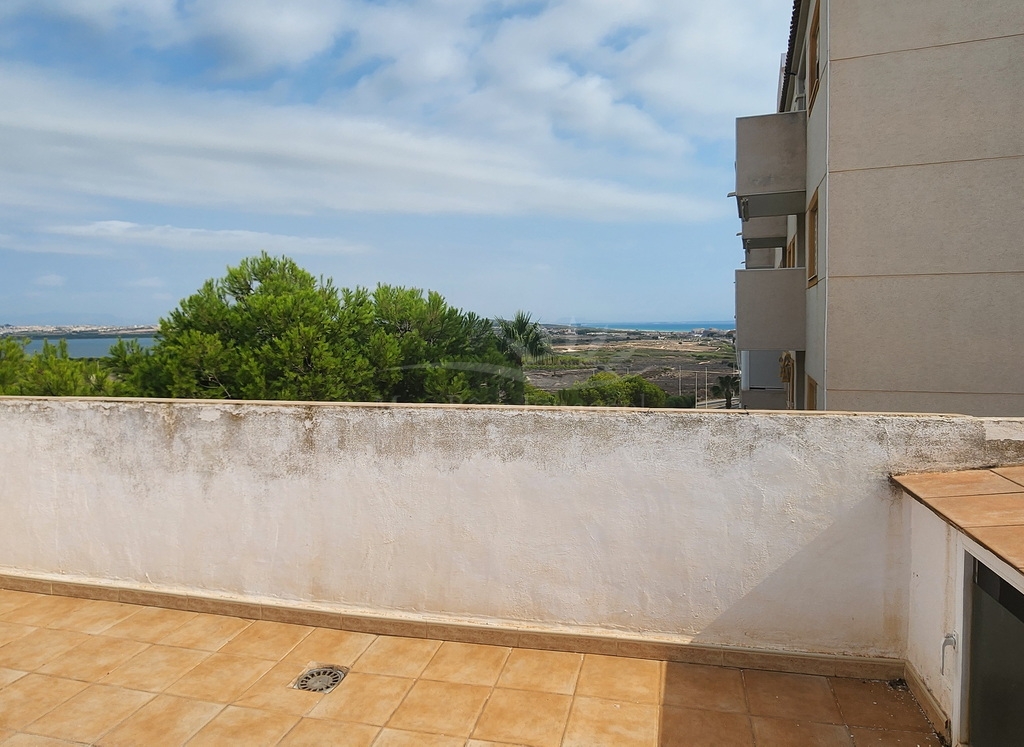 The apartment has two bedrooms, a bathroom, an open kitchen, a living/dining room with a terrace, and a solarium upstairs with views of the Aromatic Park, the Natural Park, and the La Mata lagoon. It is being sold furnished. It has access to a communal pool with beautiful green areas.