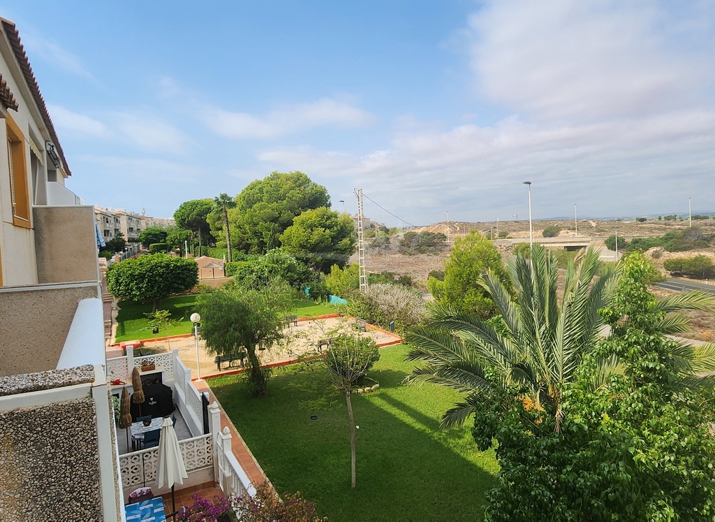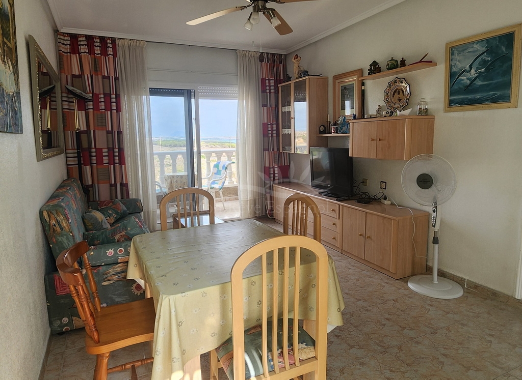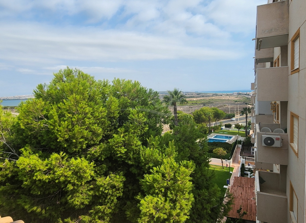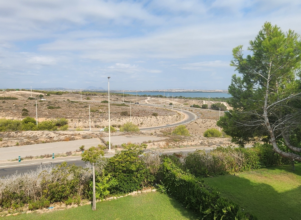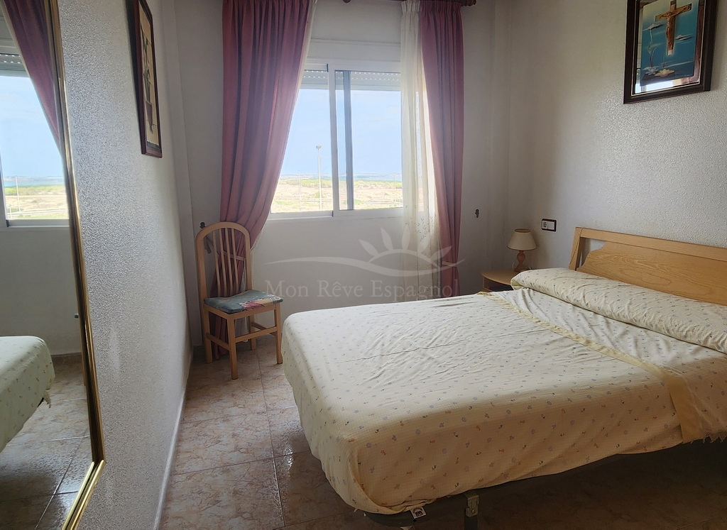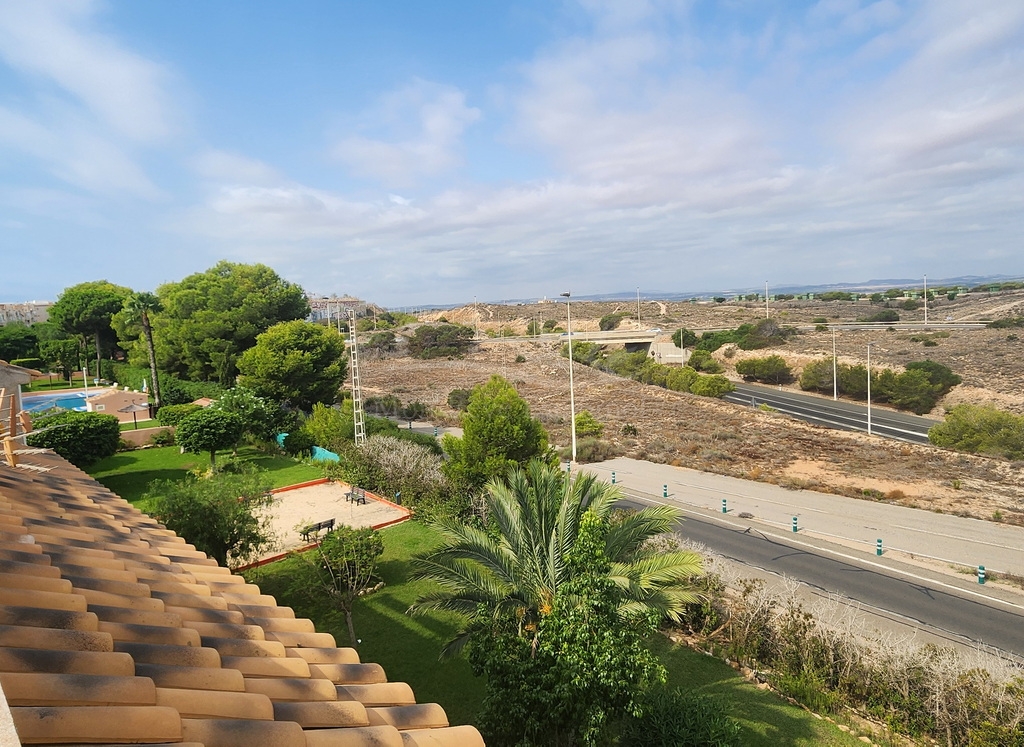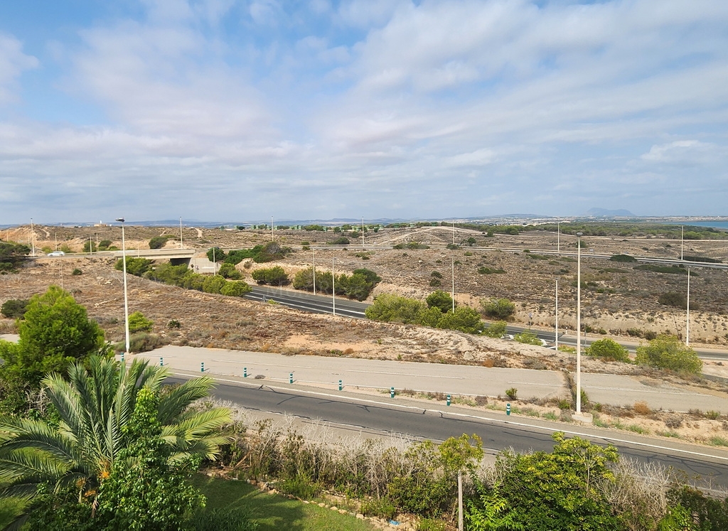 The apartment has two bedrooms, a bathroom, an open kitchen, a living/dining room with a terrace, and a solarium upstairs with views of the Aromatic Park, the Natural Park, and the La Mata lagoon. It is being sold furnished. It has access to a communal pool with beautiful green areas.