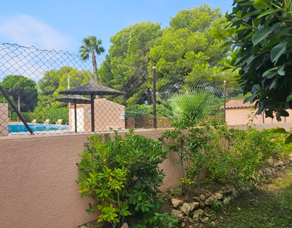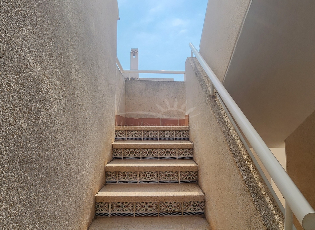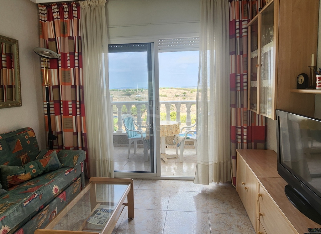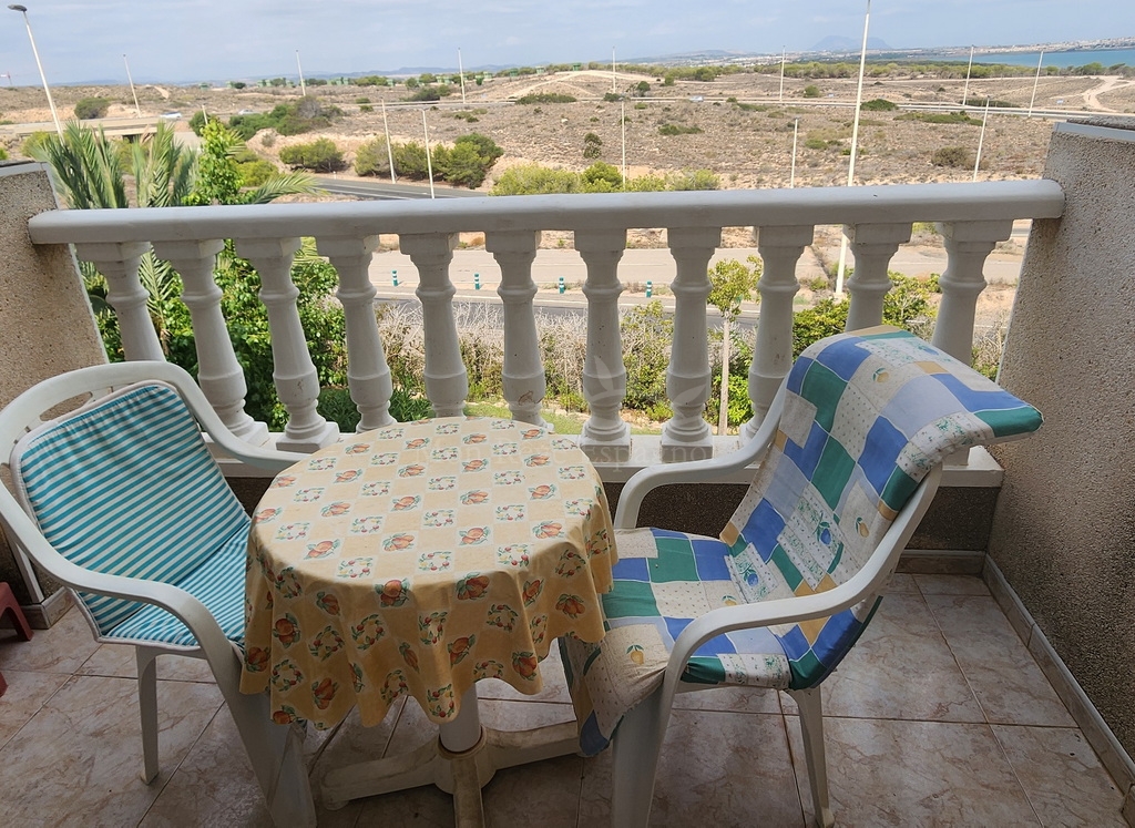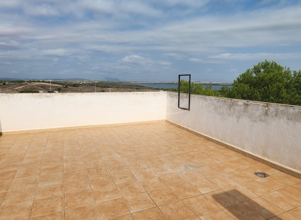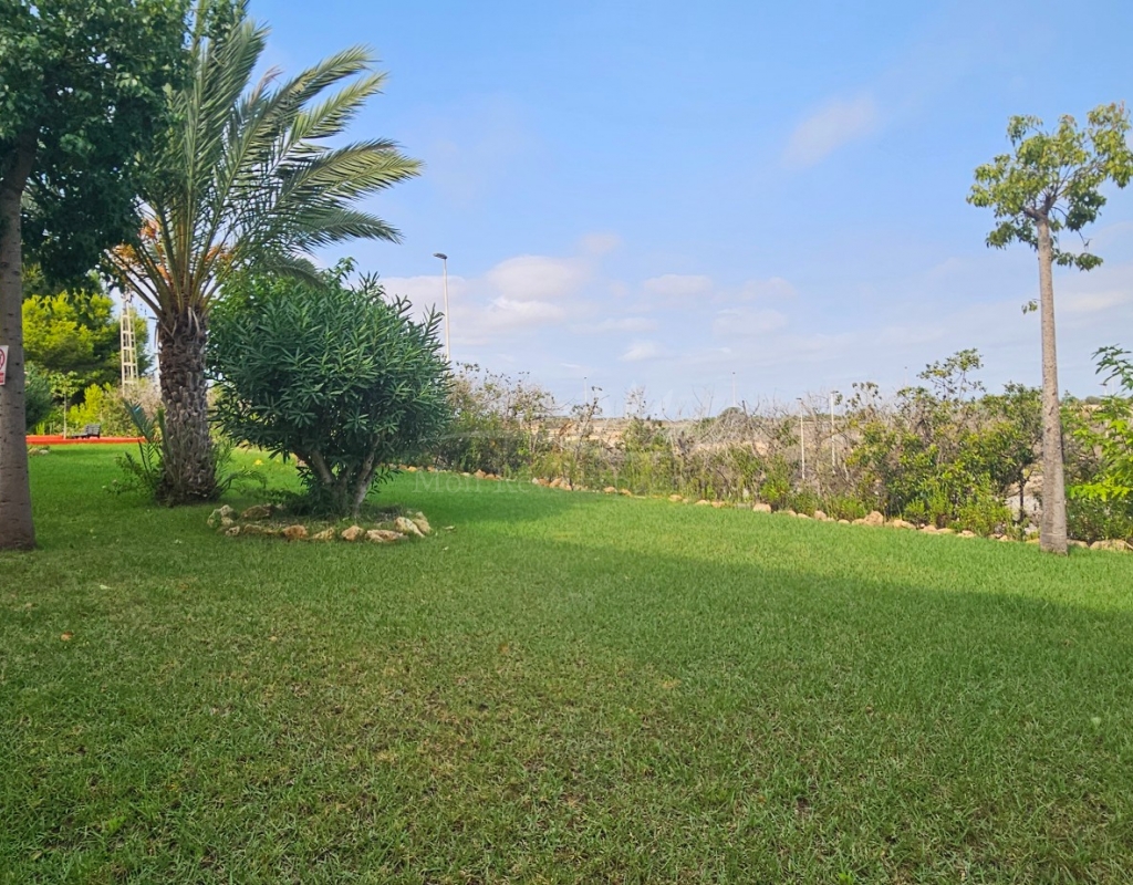 The apartment has two bedrooms, a bathroom, an open kitchen, a living/dining room with a terrace, and a solarium upstairs with views of the Aromatic Park, the Natural Park, and the La Mata lagoon. It is being sold furnished. It has access to a communal pool with beautiful green areas.