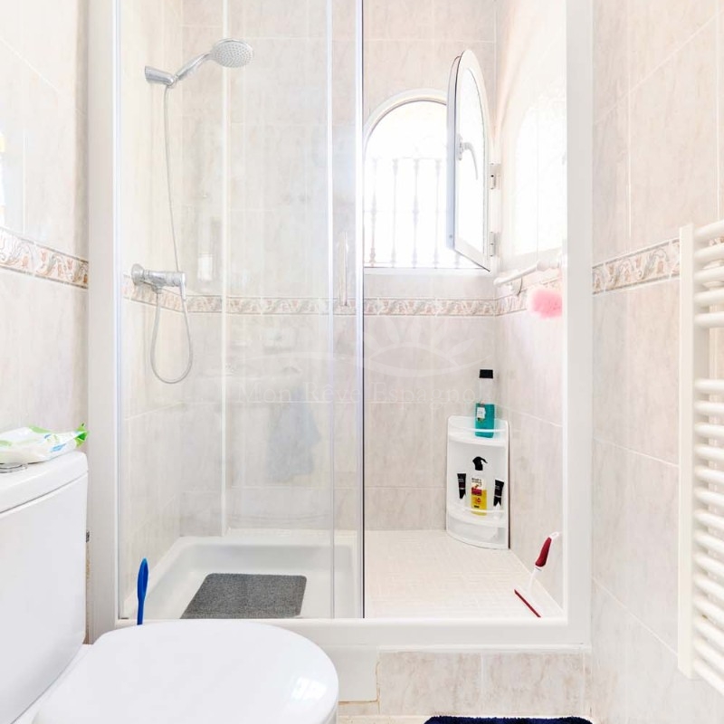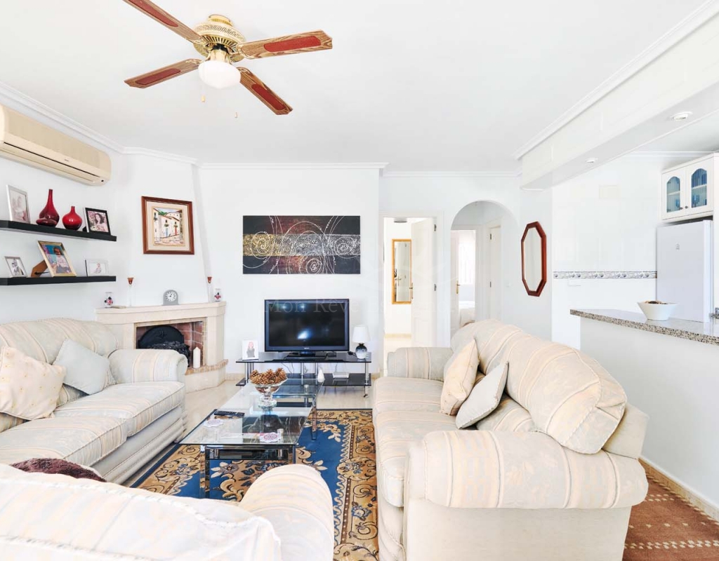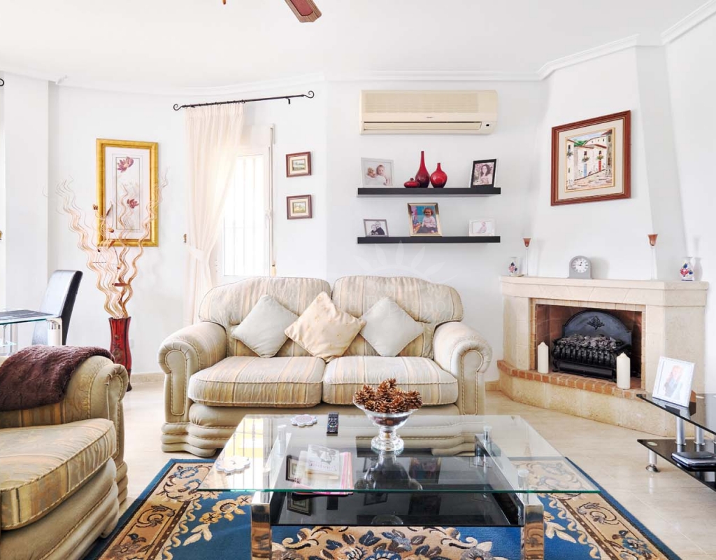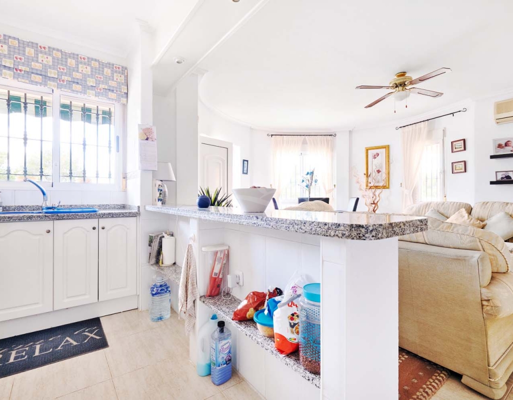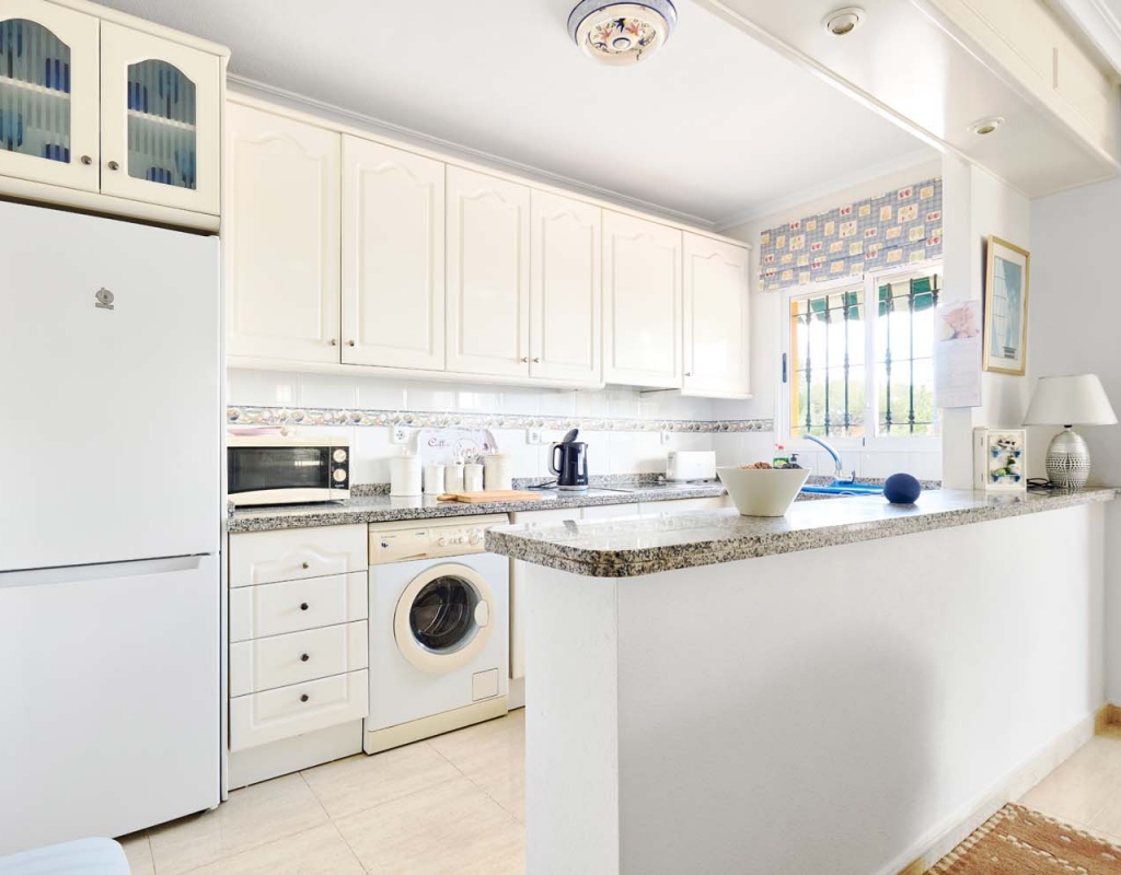 Entering the property through the pedestrian gates, a few steps lead to a terrace at the front of the villa. This terrace enjoys permanent sunshine and provides an ideal spot to enjoy the unobstructed views of the countryside and the Mar Menor. The entrance to the house leads onto this terrace and into a spacious and bright open-plan living/dining room with a fireplace and air conditioning. To the side of the living room is the open-plan kitchen with plenty of storage cupboards and a breakfast bar.