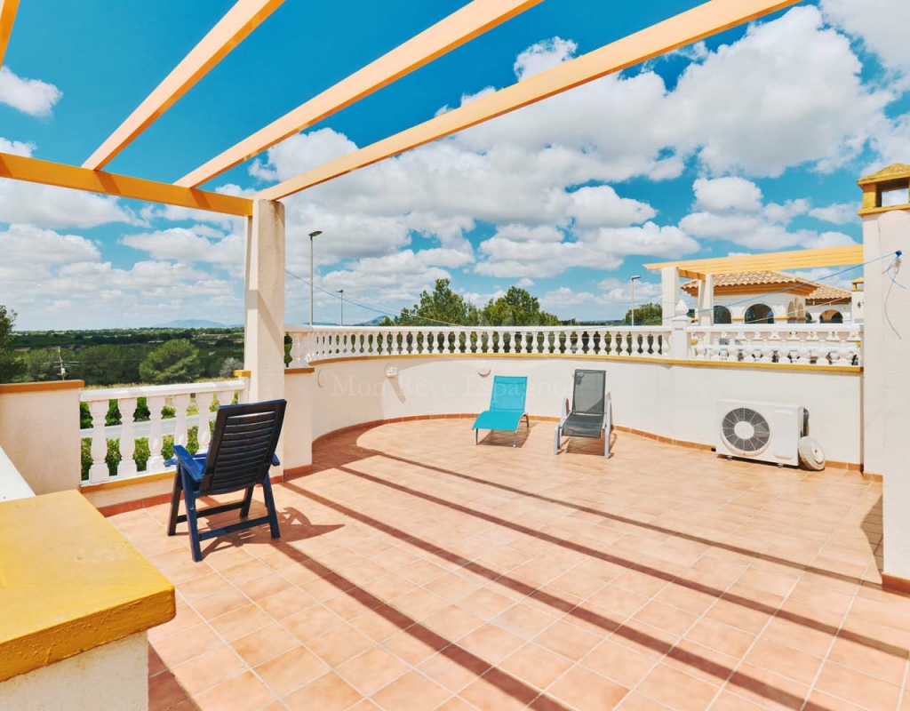 Outside, beautifully maintained grounds with off-street parking and planted plants and trees complete the property. To the side of the villa is a storage room, and to the rear, an external staircase leads to the solarium. The spacious and private solarium has a second storage room, ideal for enjoying the stunning views.