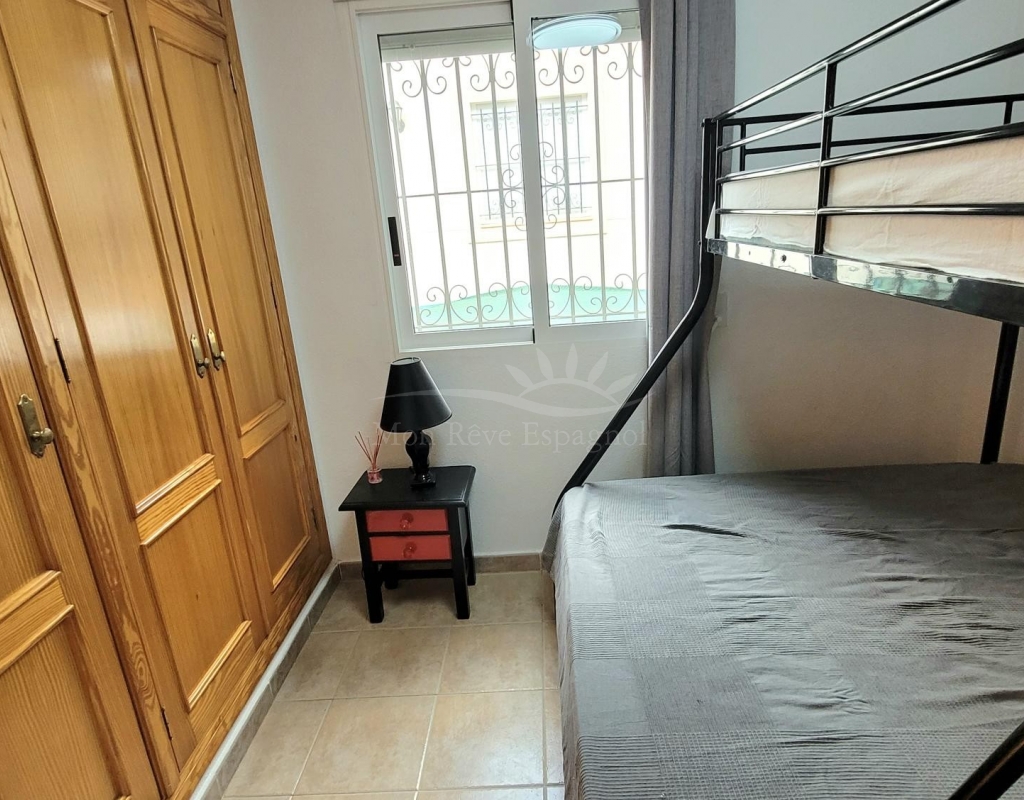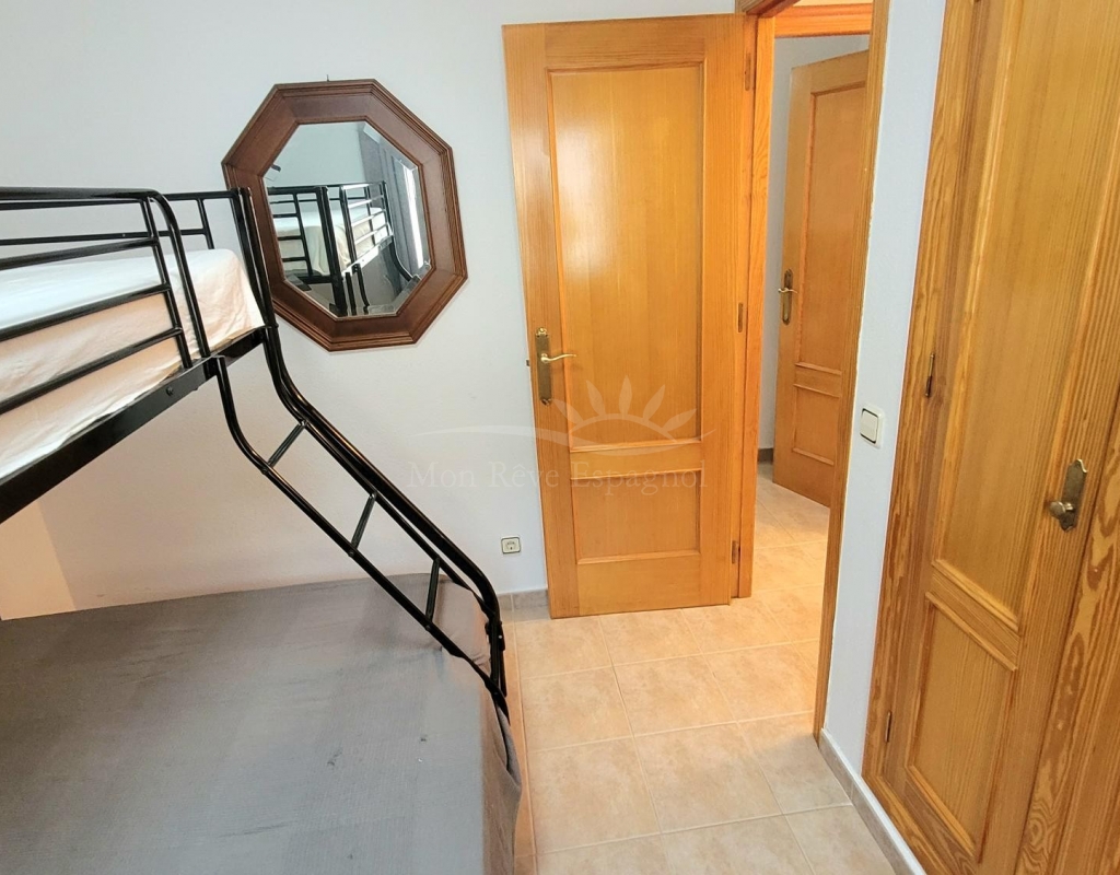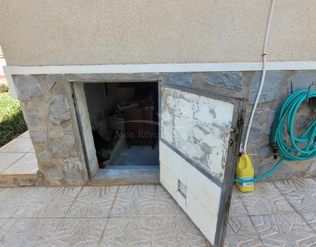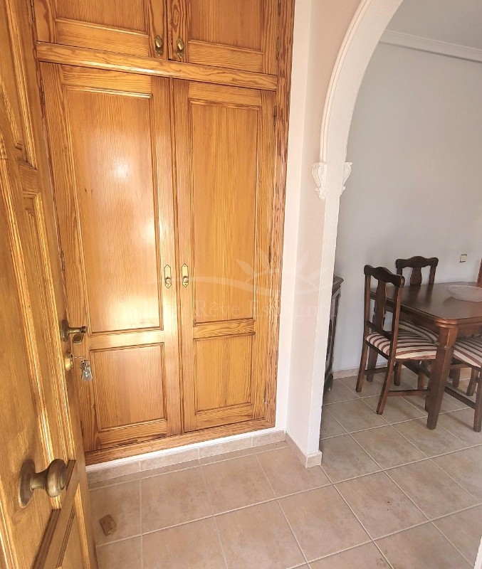 The entrance to the house is through the porch, which leads to an entrance hall with a built-in wardrobe. Then, a living-dining room. A hallway leads to a fully equipped kitchen, two bedrooms with built-in wardrobes, and a bathroom.
