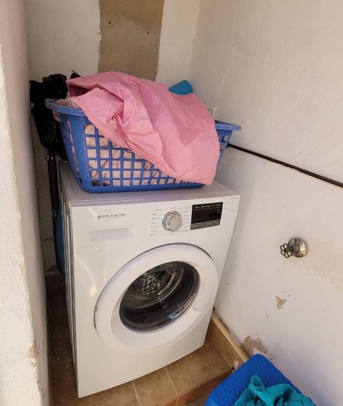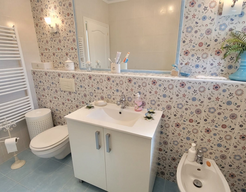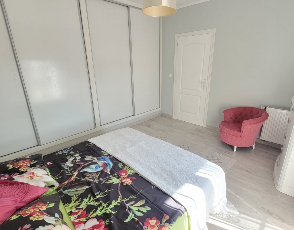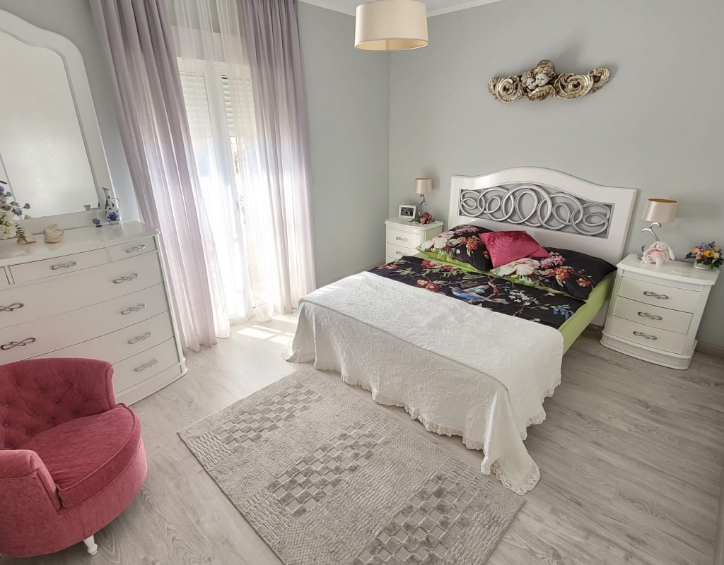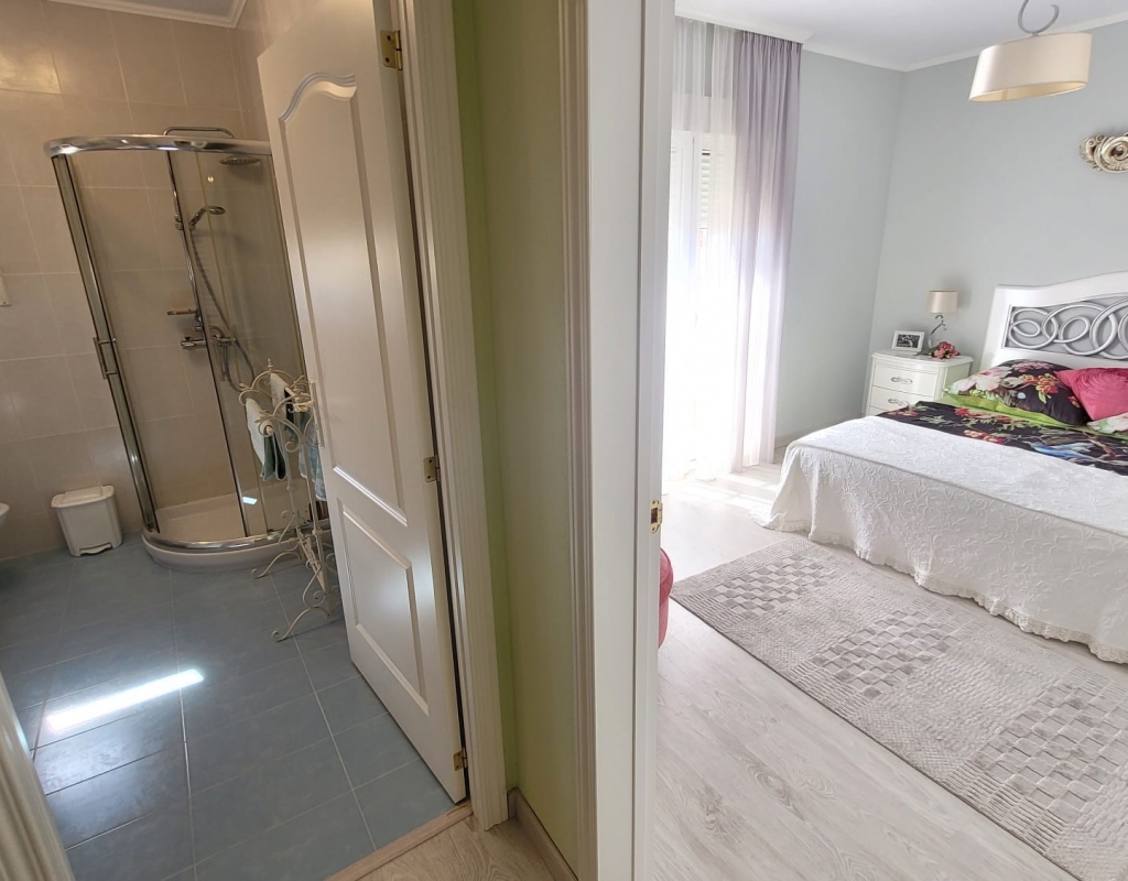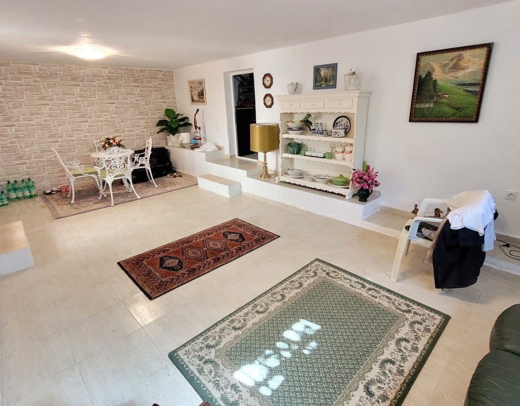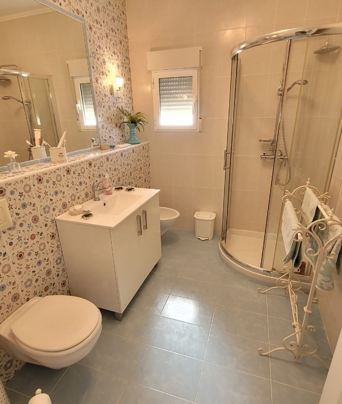 From the kitchen, a door leads to an internal staircase leading to the upper floor, also accessible from the outside and easily converted into a separate apartment. This floor includes a large bedroom with a balcony and built-in wardrobe, a bathroom, and a living-dining room with a balcony. This floor is pre-installed for heating.