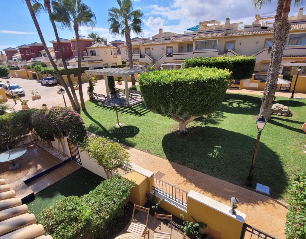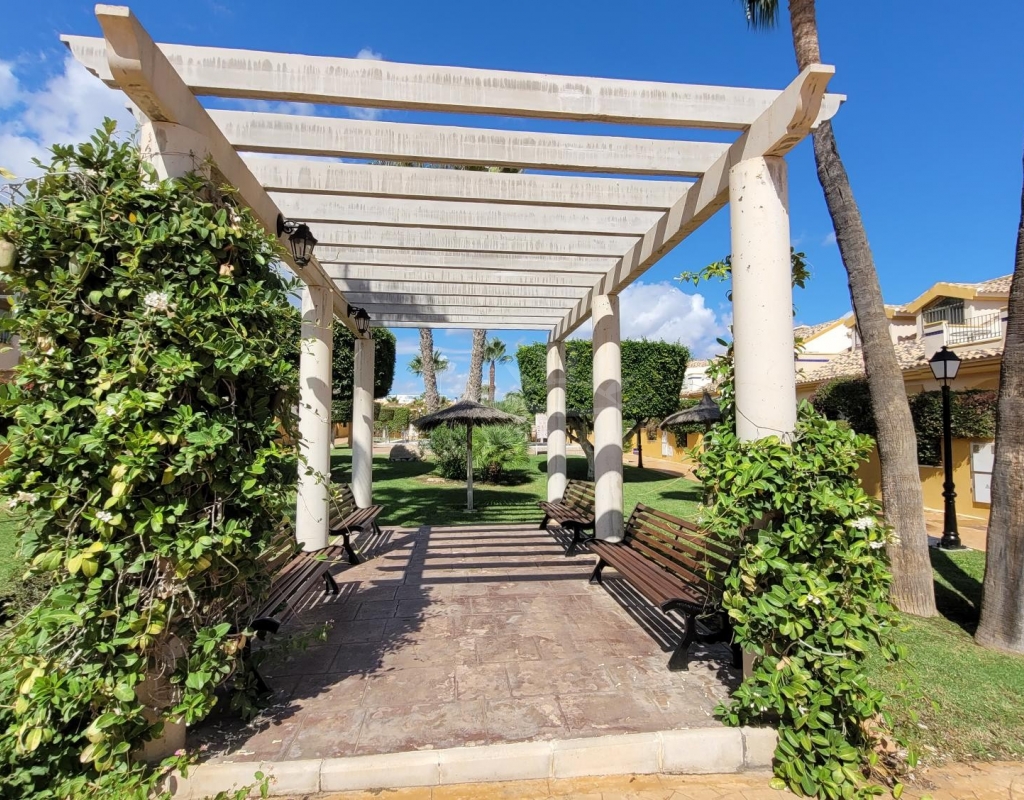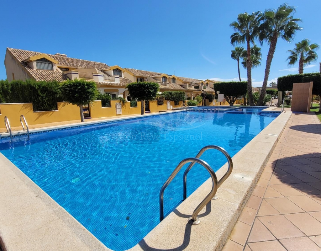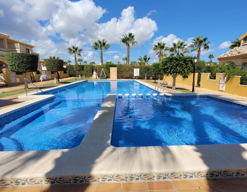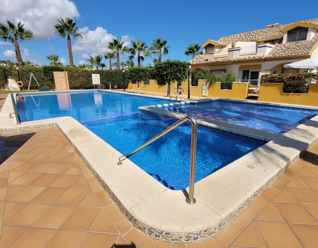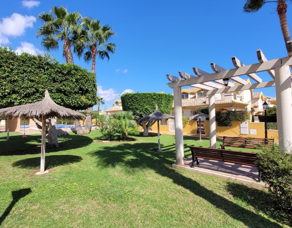 A charming 3-bedroom house with a south-facing orientation, situated in front of a lovely park with a communal swimming pool.