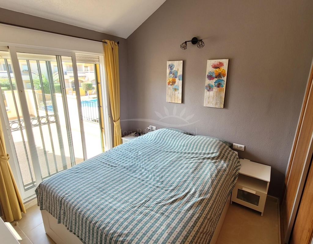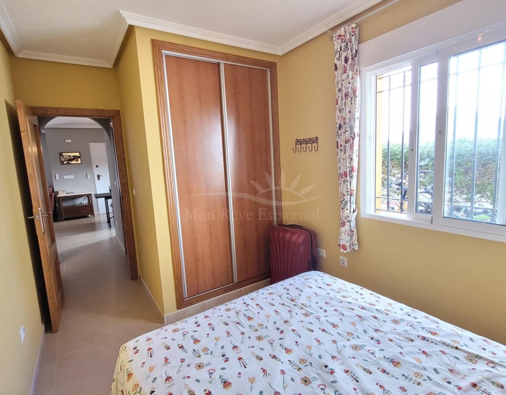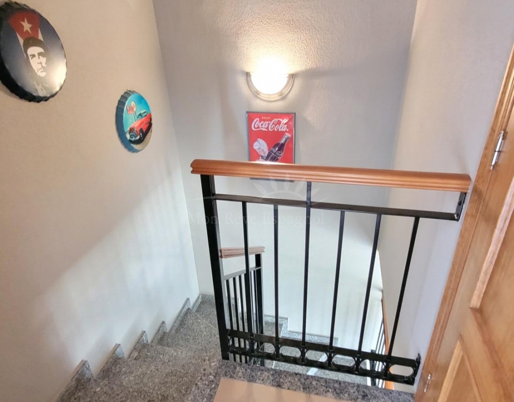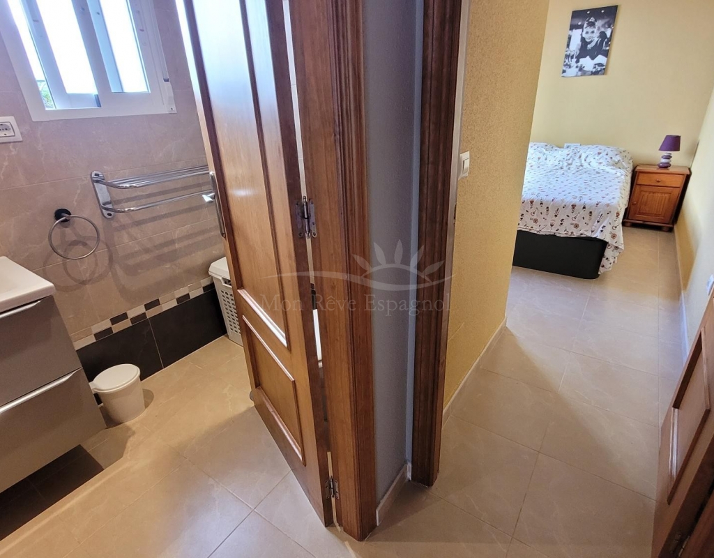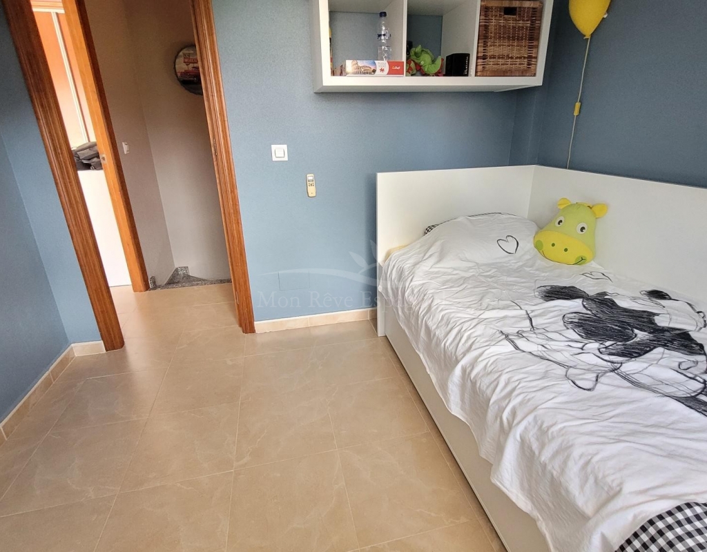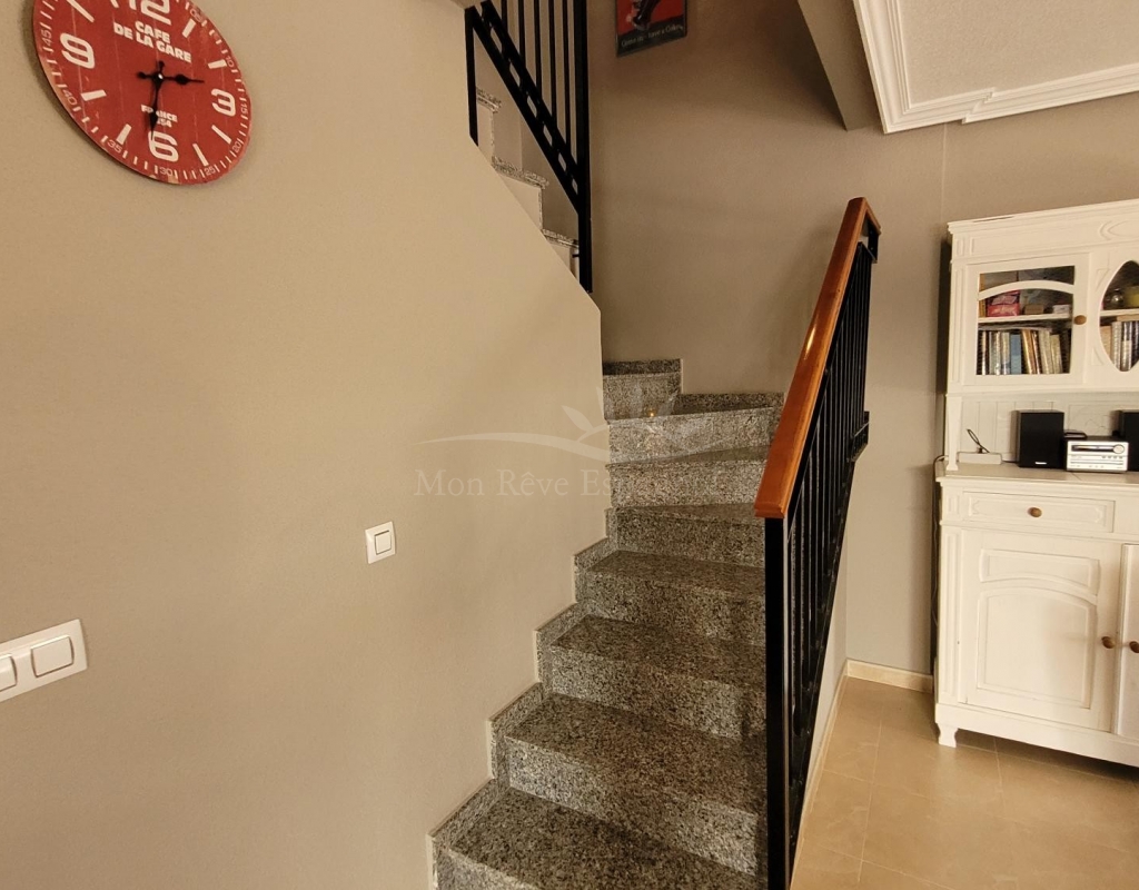 From the living room, a staircase leads upstairs to two bedrooms. One of these bedrooms is an en-suite, with its own bathroom and direct access to a sunny terrace offering stunning views of the park and the communal pool.
