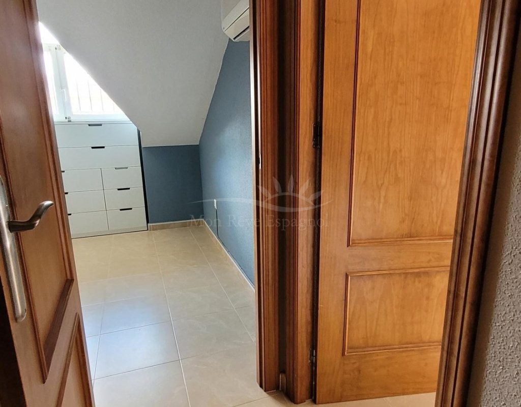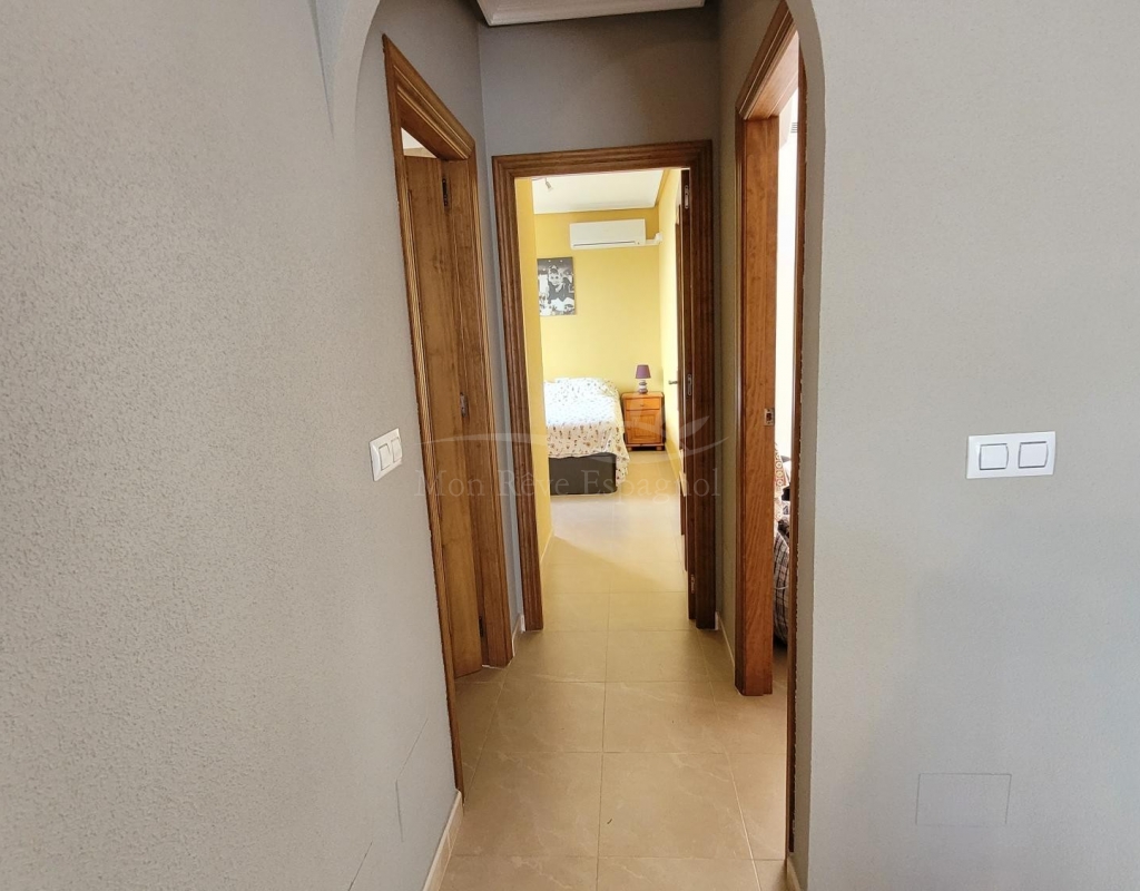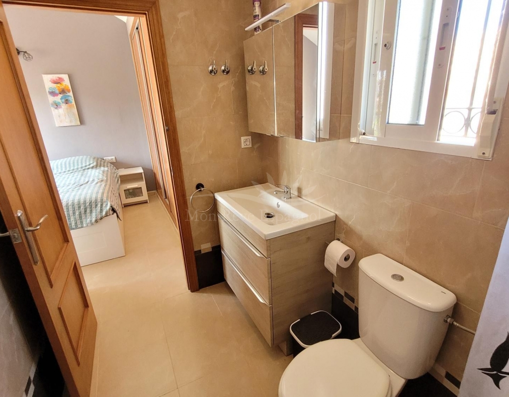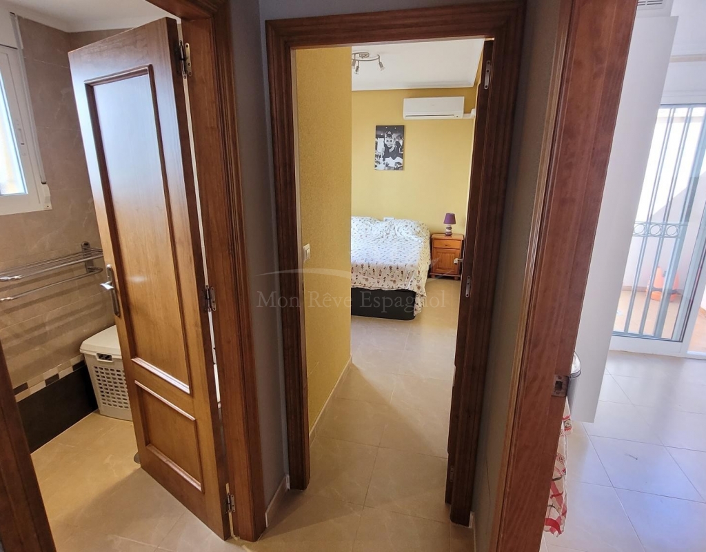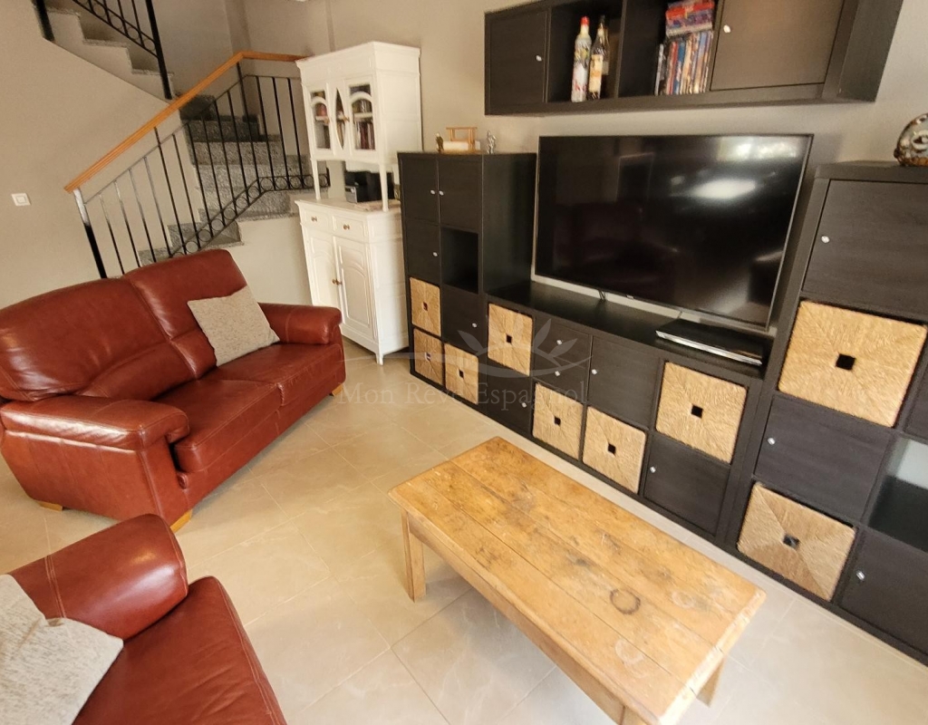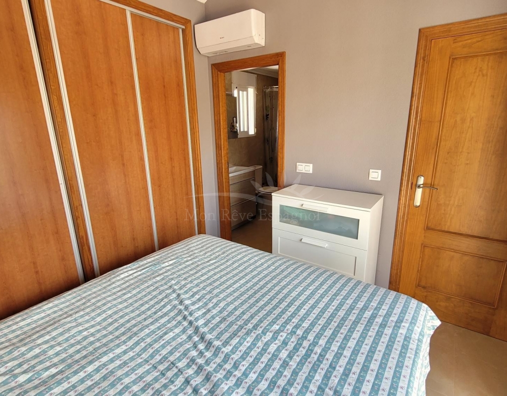 From the living room, a staircase leads upstairs to two bedrooms. One of these bedrooms is an en-suite, with its own bathroom and direct access to a sunny terrace offering stunning views of the park and the communal pool.