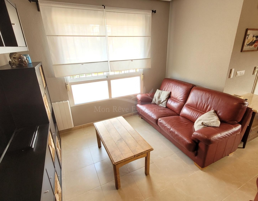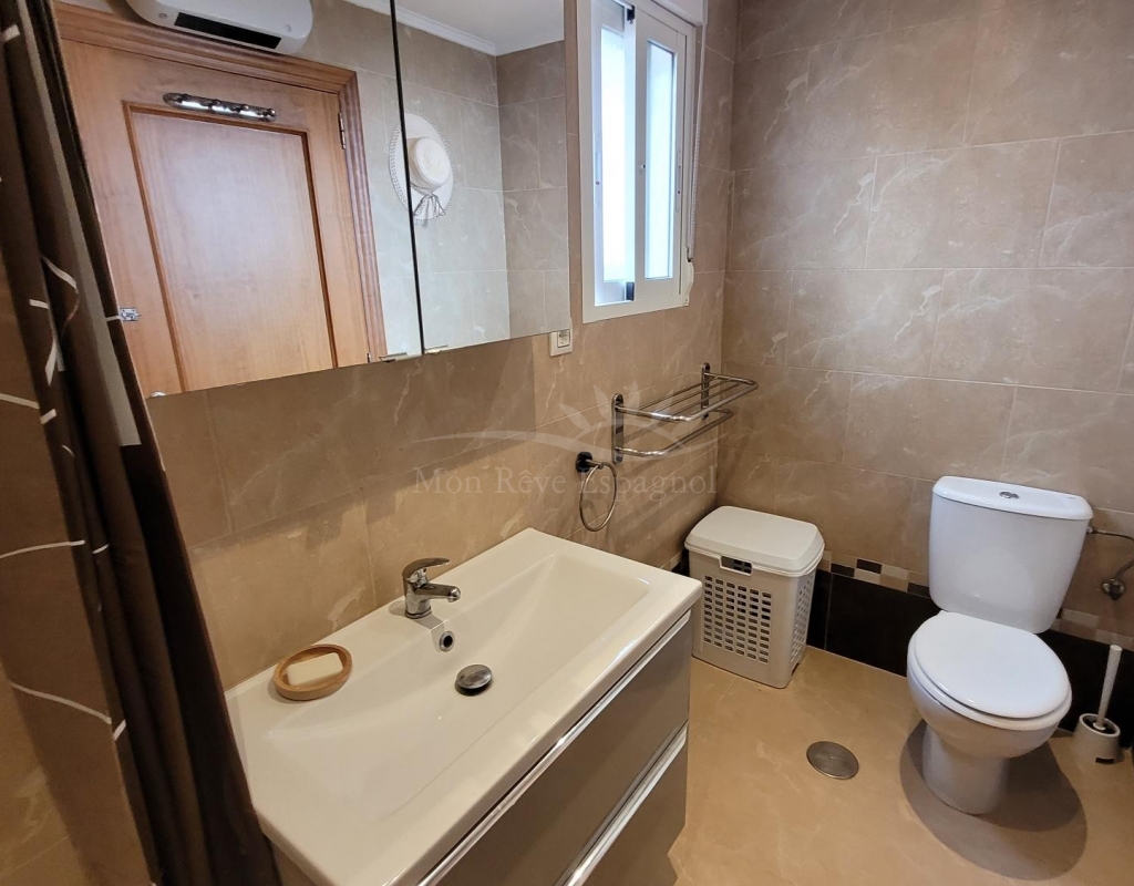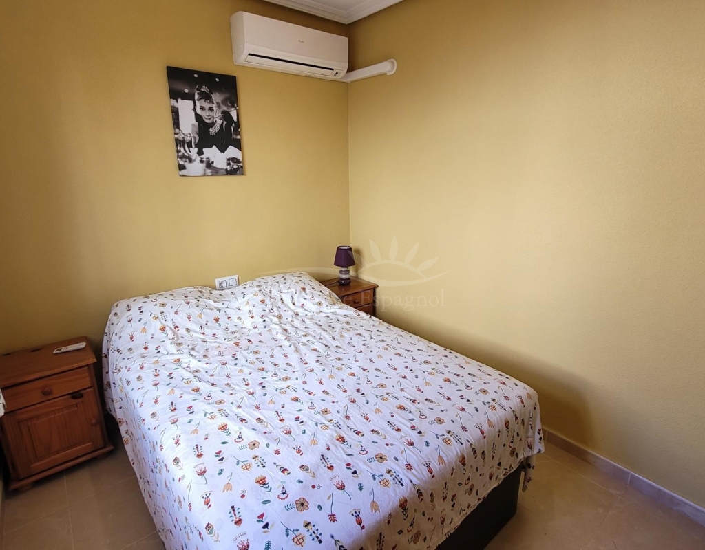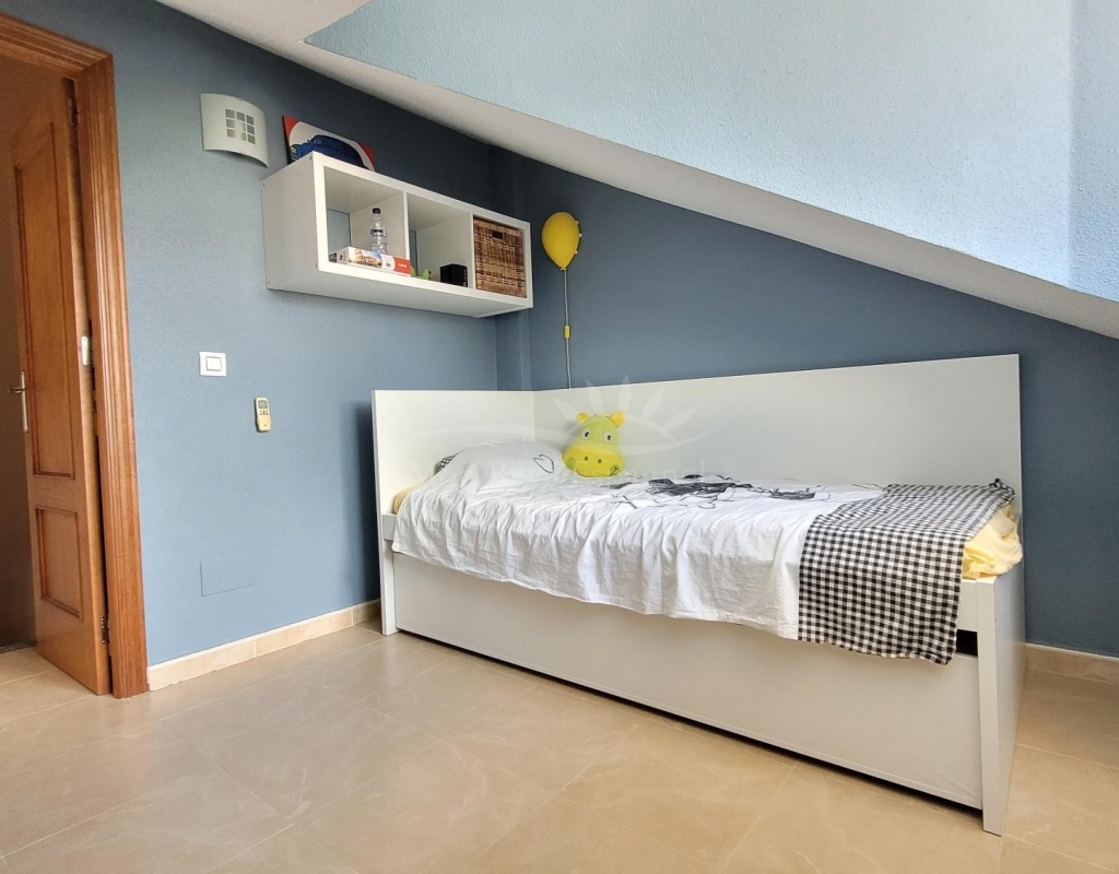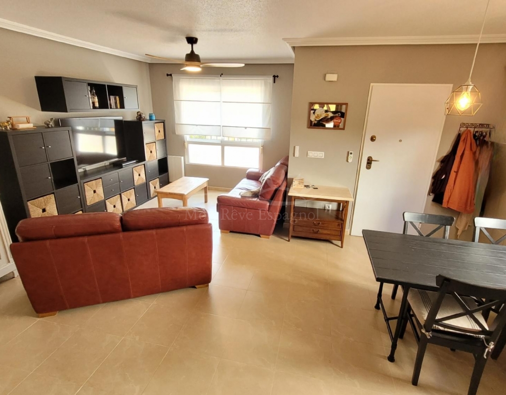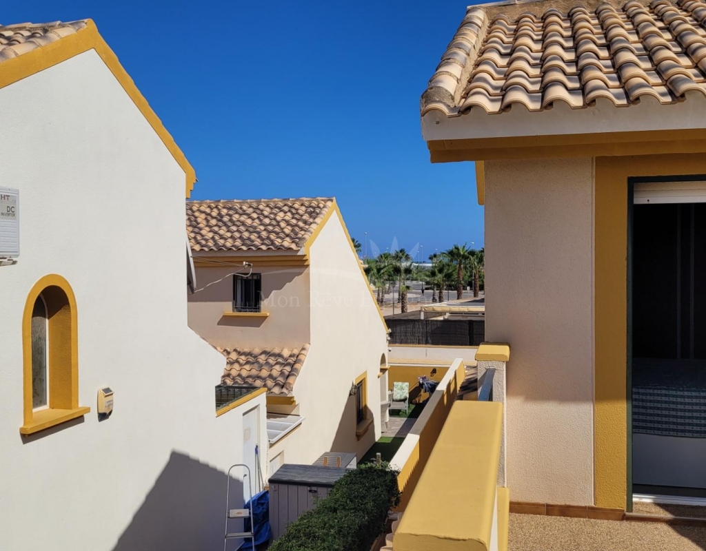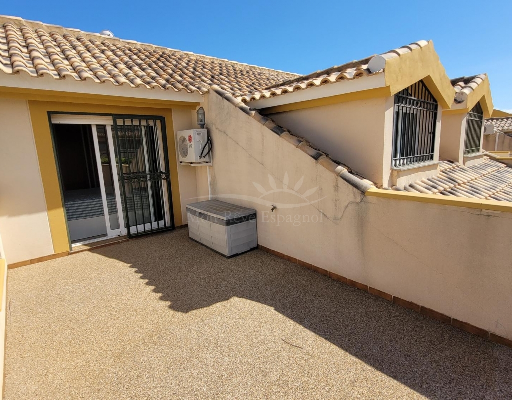 From the living room, a staircase leads upstairs to two bedrooms. One of these bedrooms is an en-suite, with its own bathroom and direct access to a sunny terrace offering stunning views of the park and the communal pool.