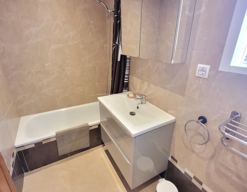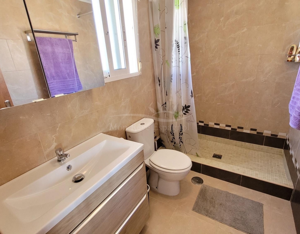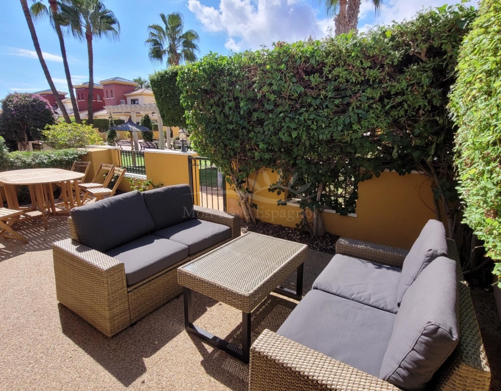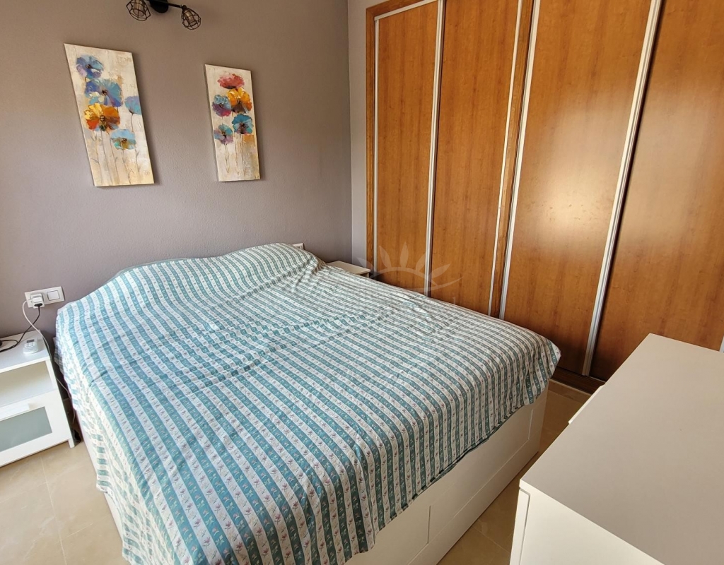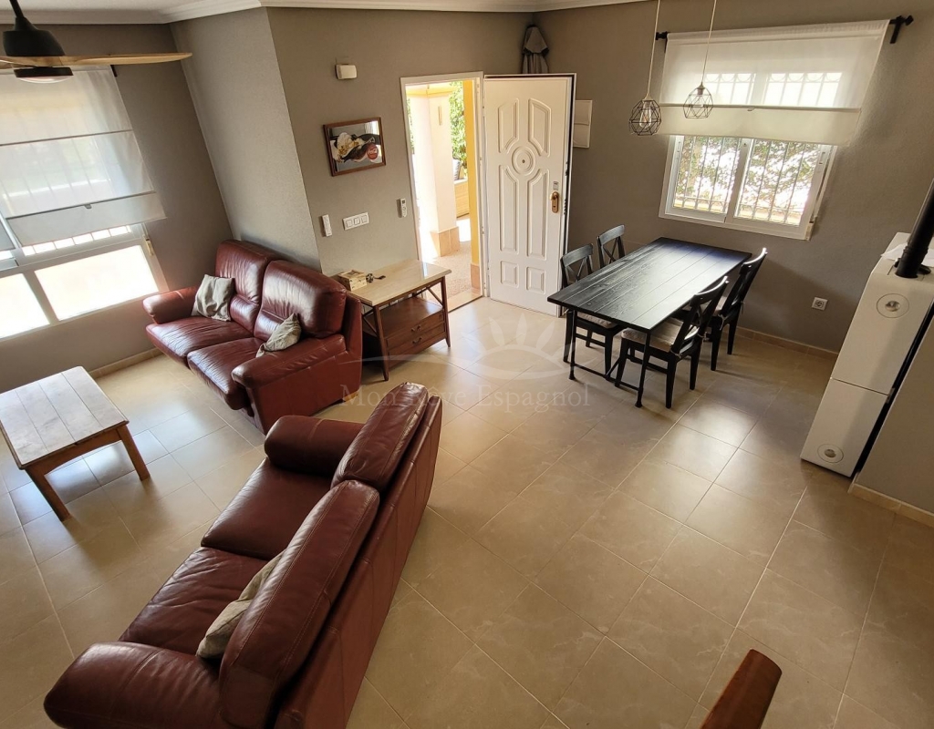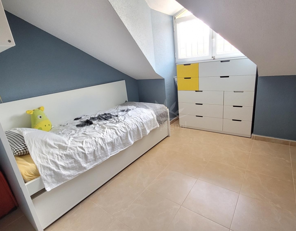 From the living room, a staircase leads upstairs to two bedrooms. One of these bedrooms is an en-suite, with its own bathroom and direct access to a sunny terrace offering stunning views of the park and the communal pool.
