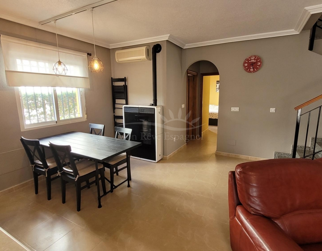 The entrance to the house is through a porch, which opens into a spacious living/dining room with air conditioning and a pellet stove. A hallway leads to a bathroom, a double bedroom with fitted wardrobes, and a fully equipped kitchen with a pantry and French doors opening onto a 5m² terrace where the washing machine is located.