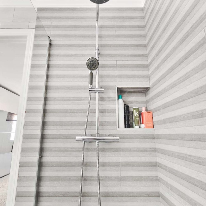 Bathrooms: 2 modern bathrooms with walk-in showers and built-in storage.