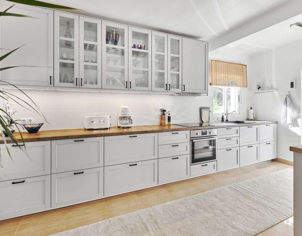 Kitchen: Fully renovated kitchen with ample storage and an adjacent utility room.
