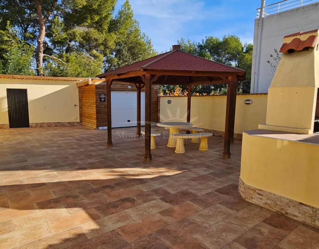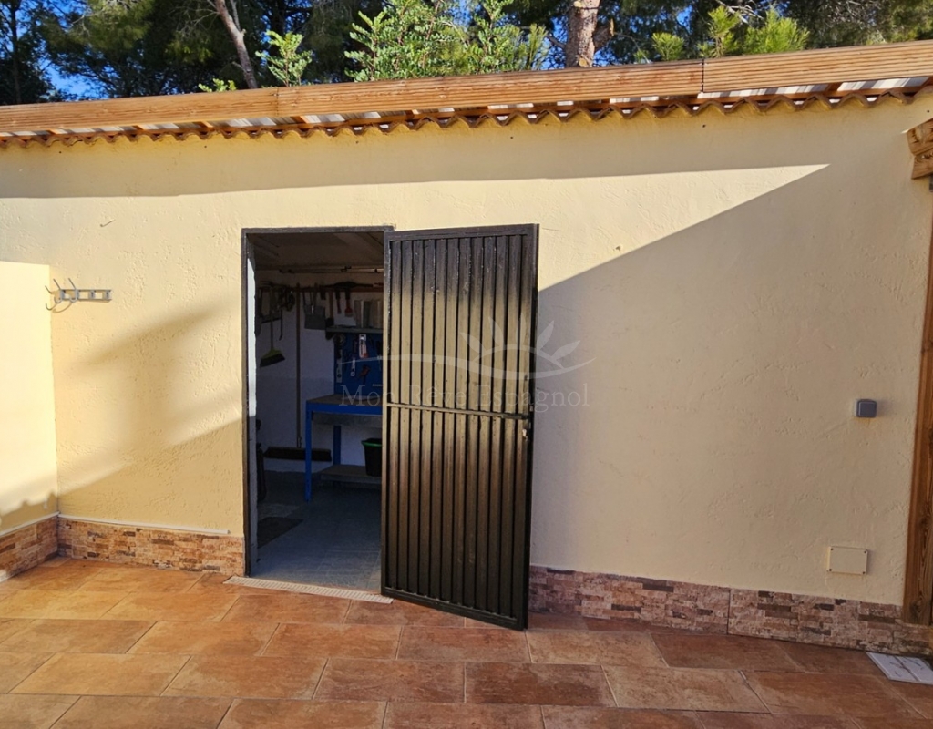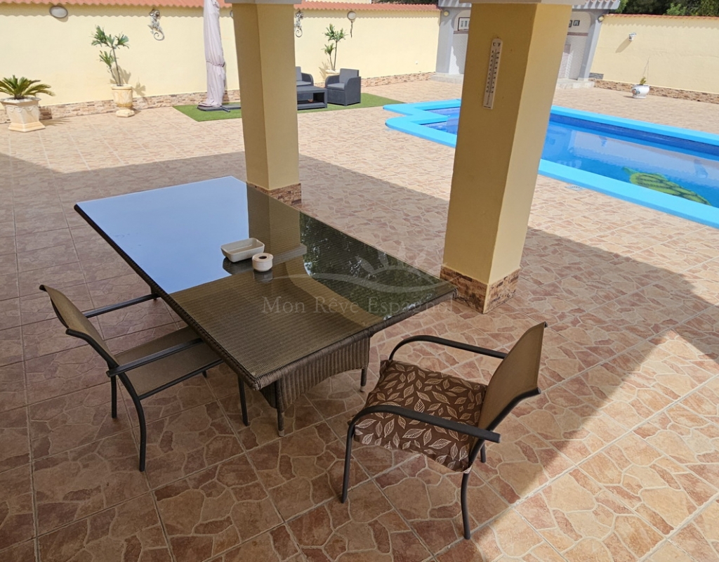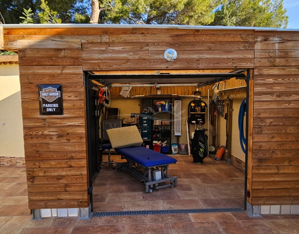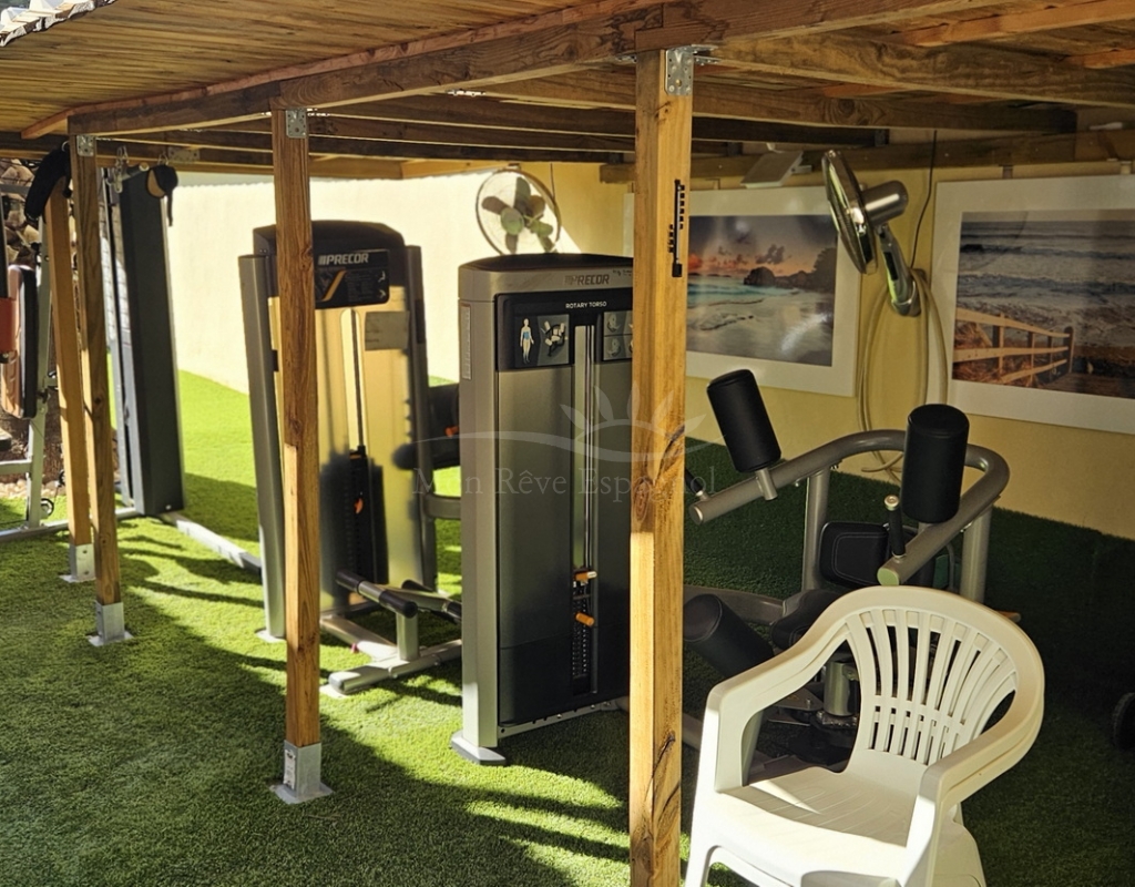 Outside, the property offers parking space for several vehicles, a covered carport for two cars, a gym, barbecue area, wooden shed, swimming pool, covered terrace and a large terrace surrounding the pool.