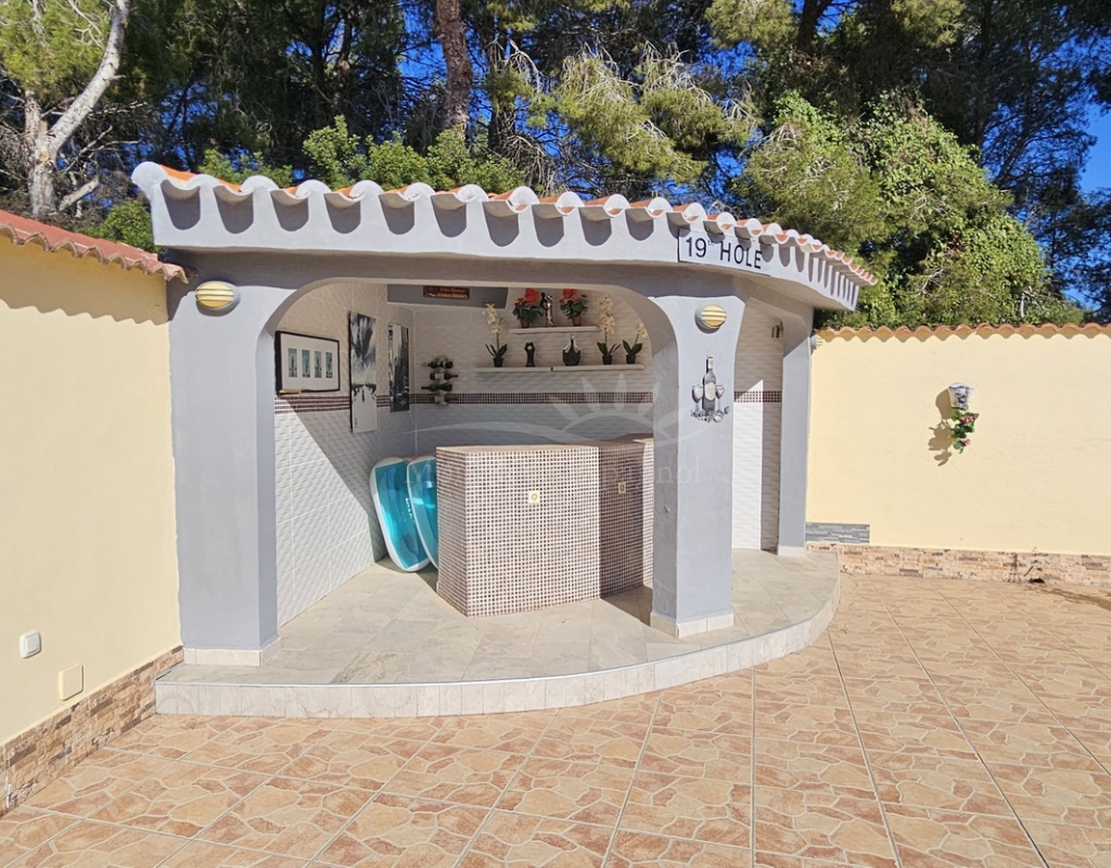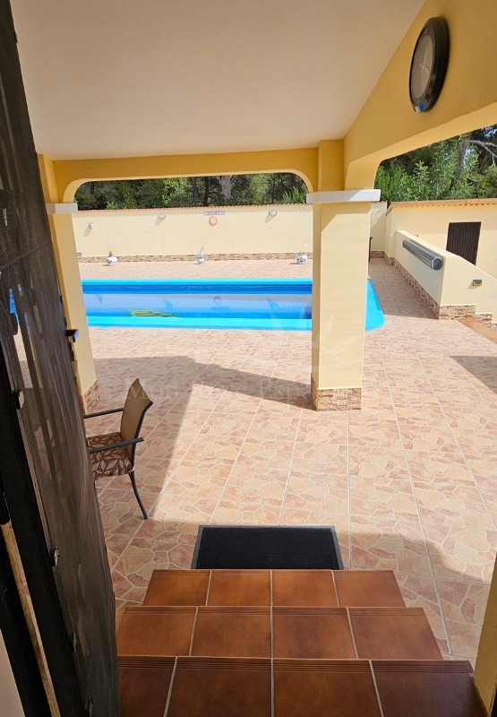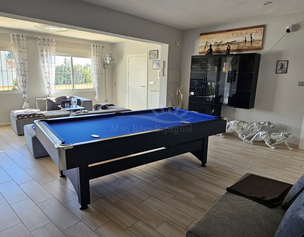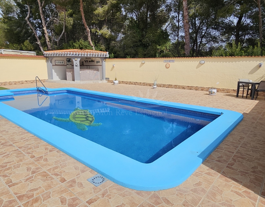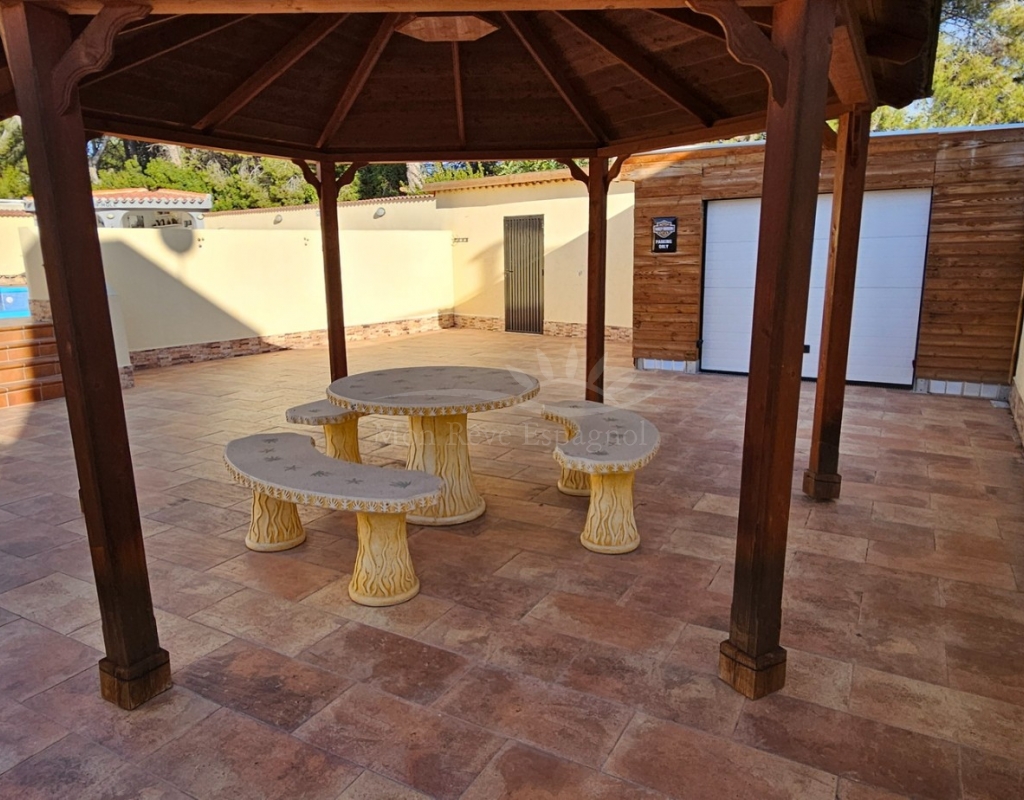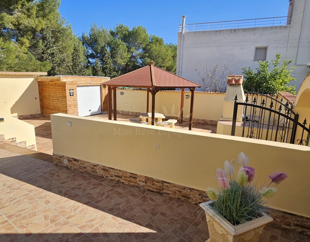 Outside, the property offers parking space for several vehicles, a covered carport for two cars, a gym, barbecue area, wooden shed, swimming pool, covered terrace and a large terrace surrounding the pool.