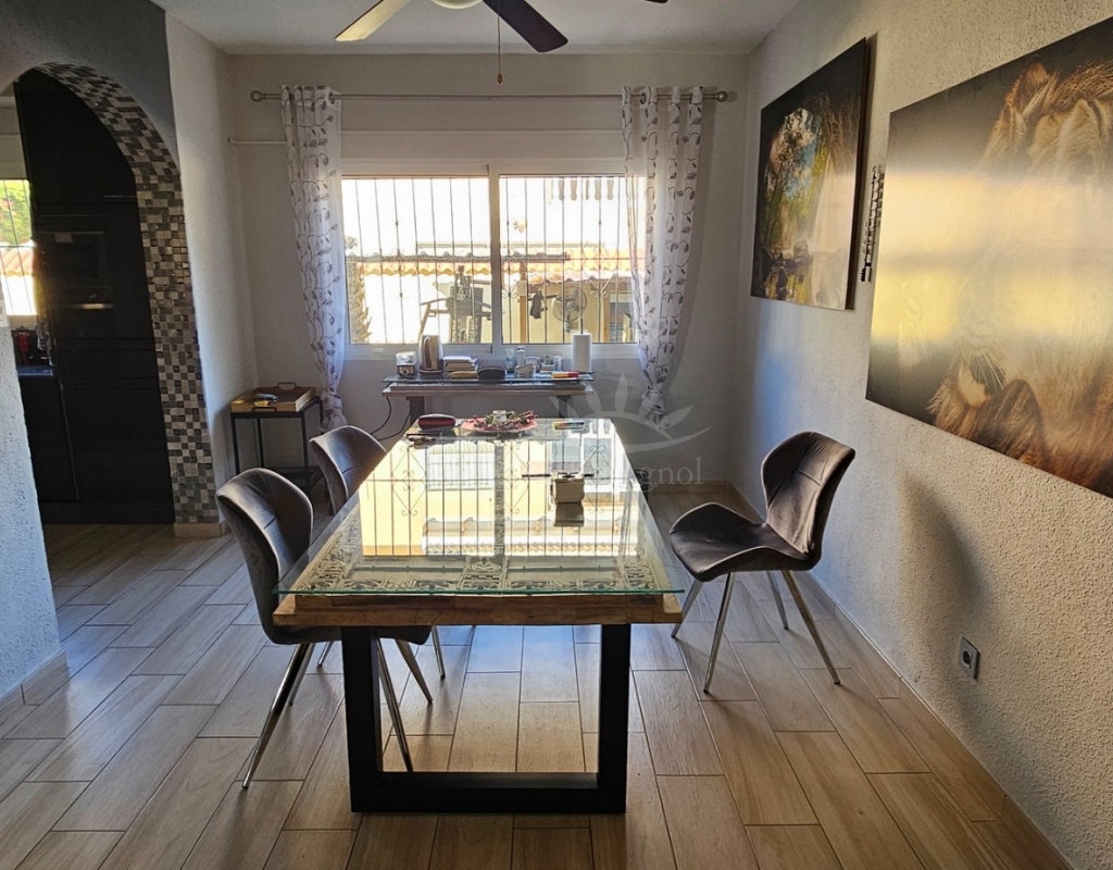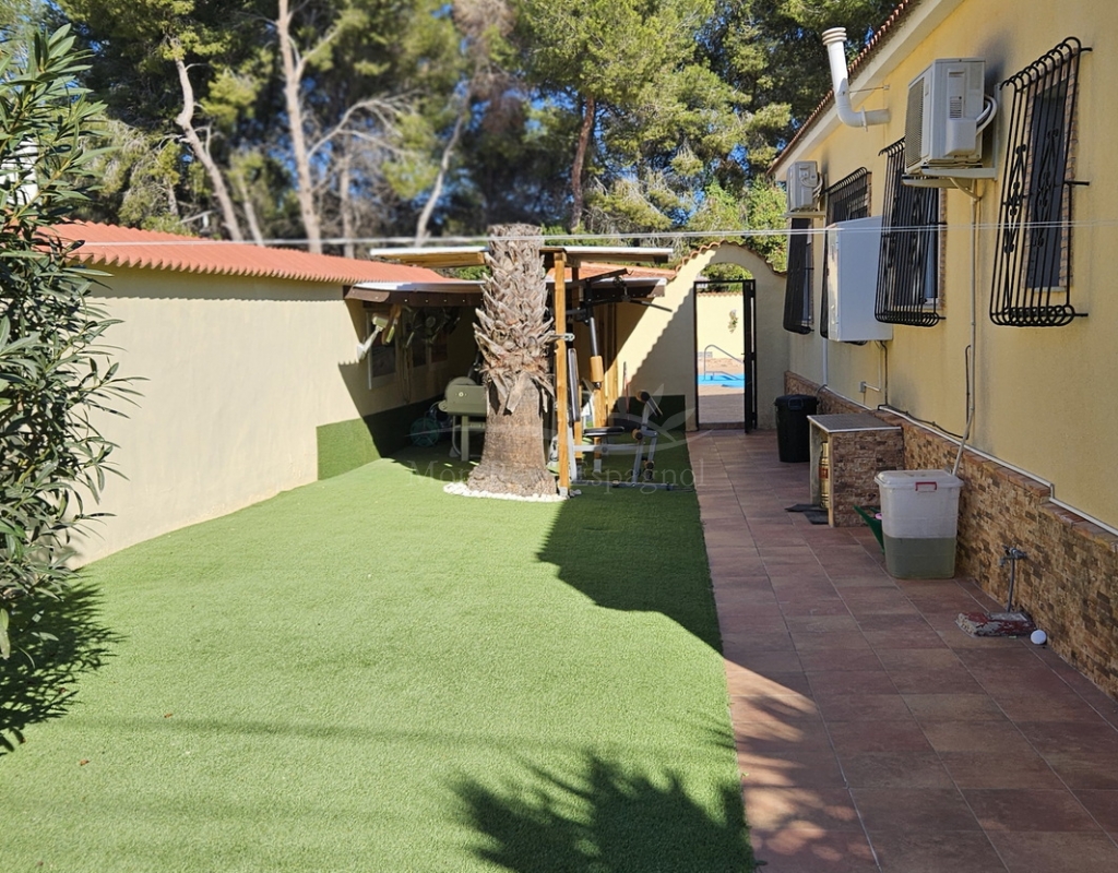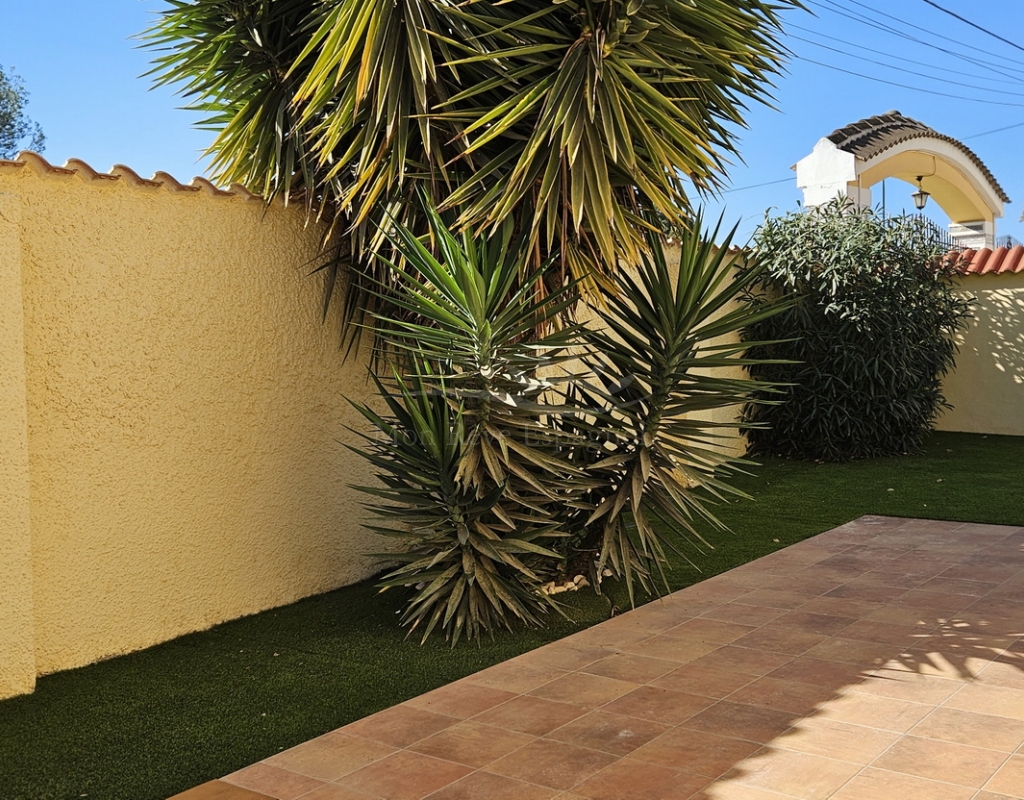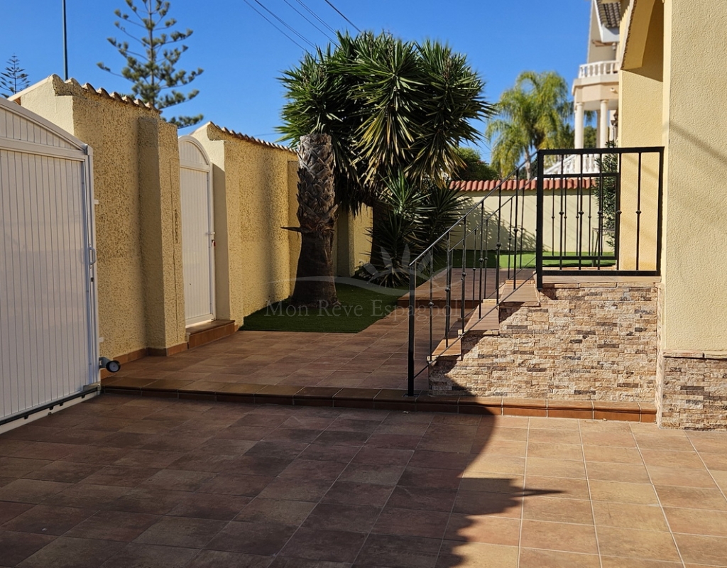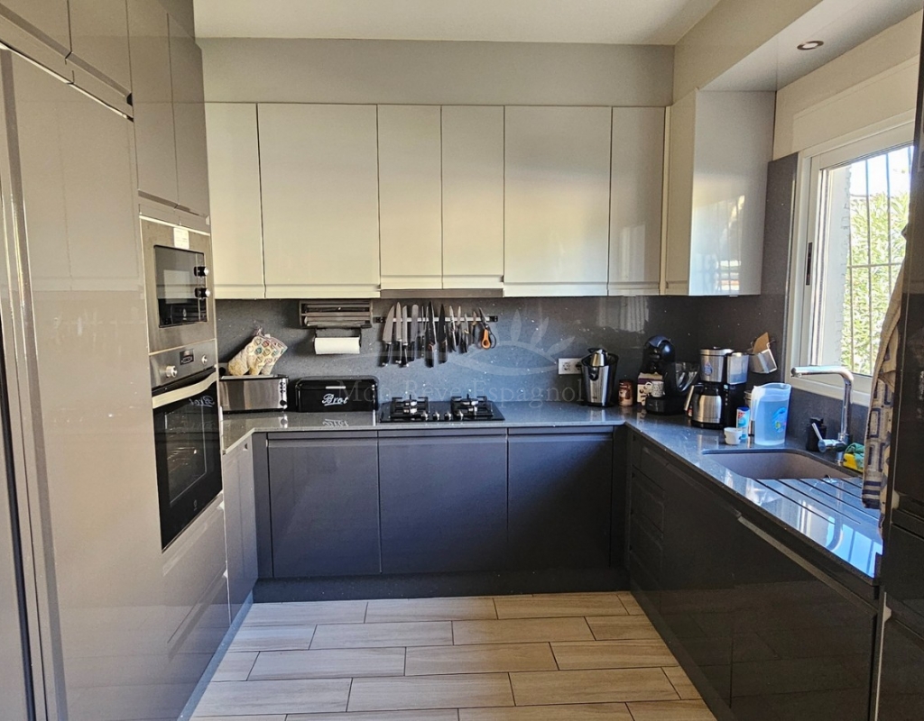 Single-storey villa with 175 m² of built area, set on a completely flat 864 m² plot. The property features a spacious and bright living room, dining area, fully equipped kitchen, four bedrooms and three bathrooms, two of them en suite.