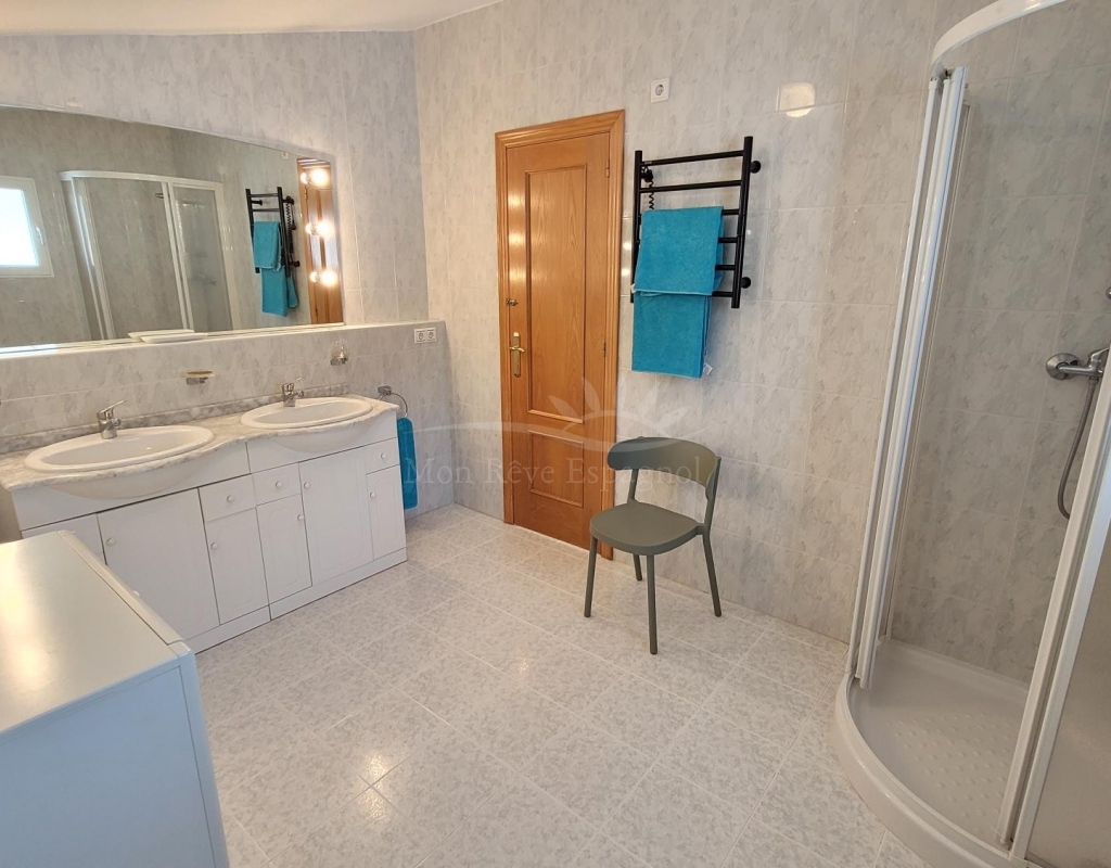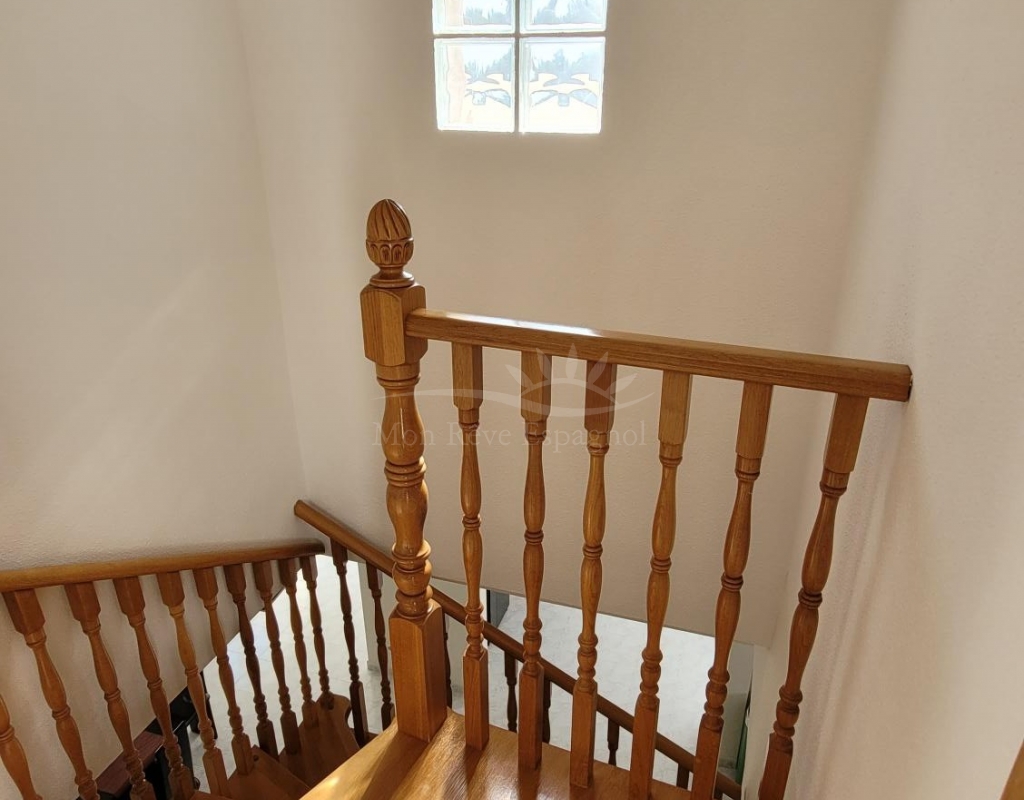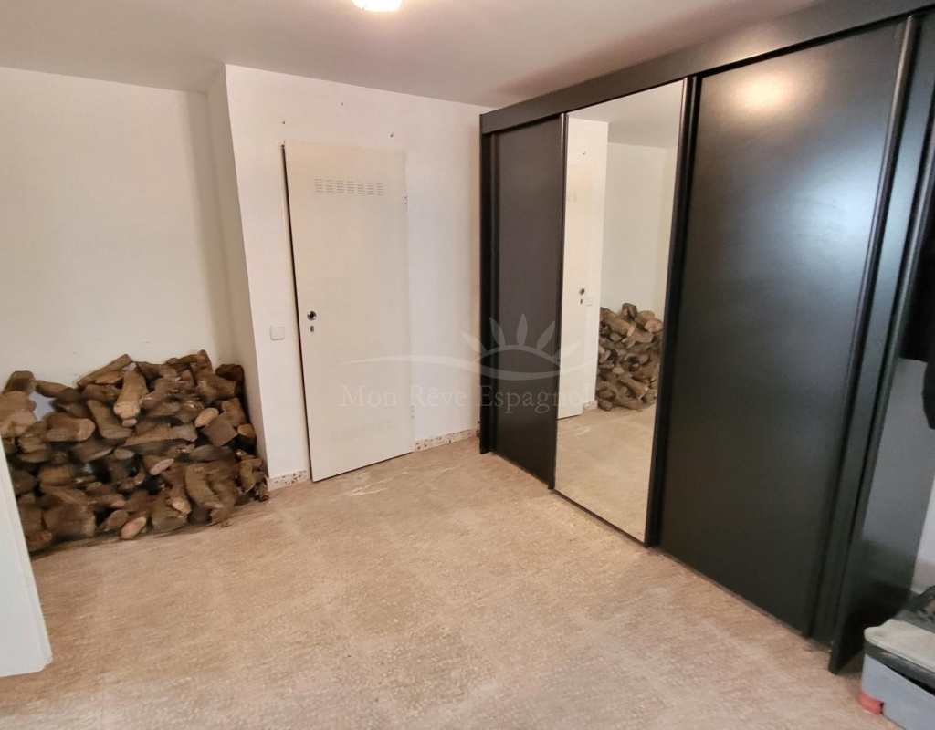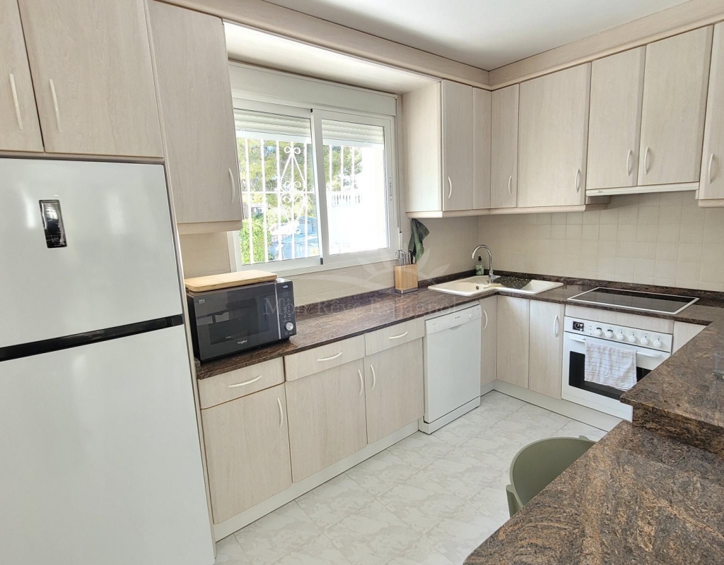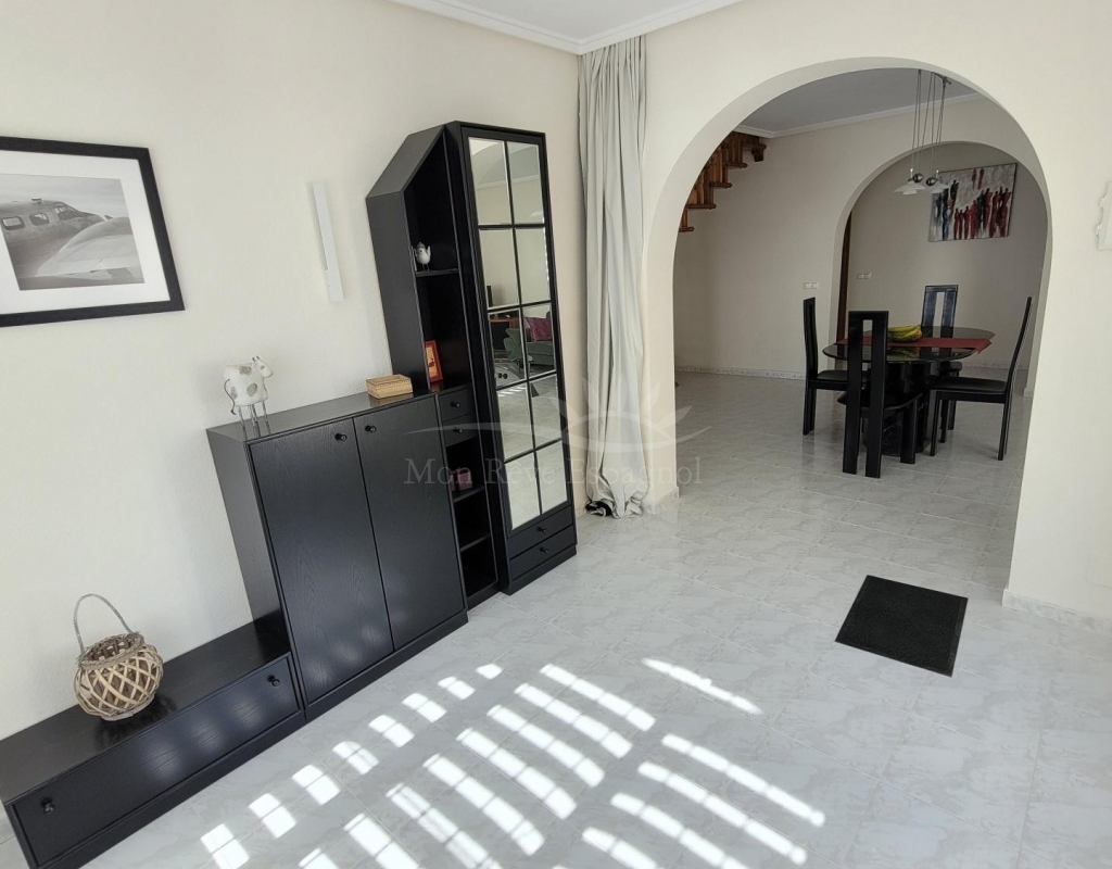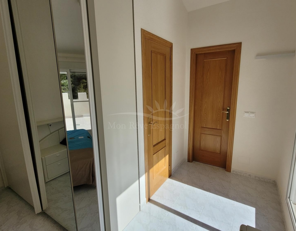 On the ground floor, the property offers an entrance hall, a bright living room with fireplace, a spacious dining area, a fully equipped semi-open kitchen, two bedrooms with fitted wardrobes, and a complete bathroom. From the living room, a staircase leads to the upper floor, where you will find the master bedroom, a dressing room, a bathroom, and a large private terrace.
