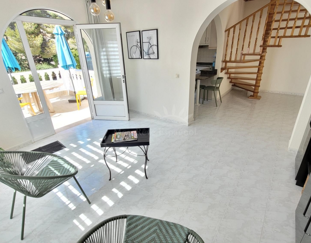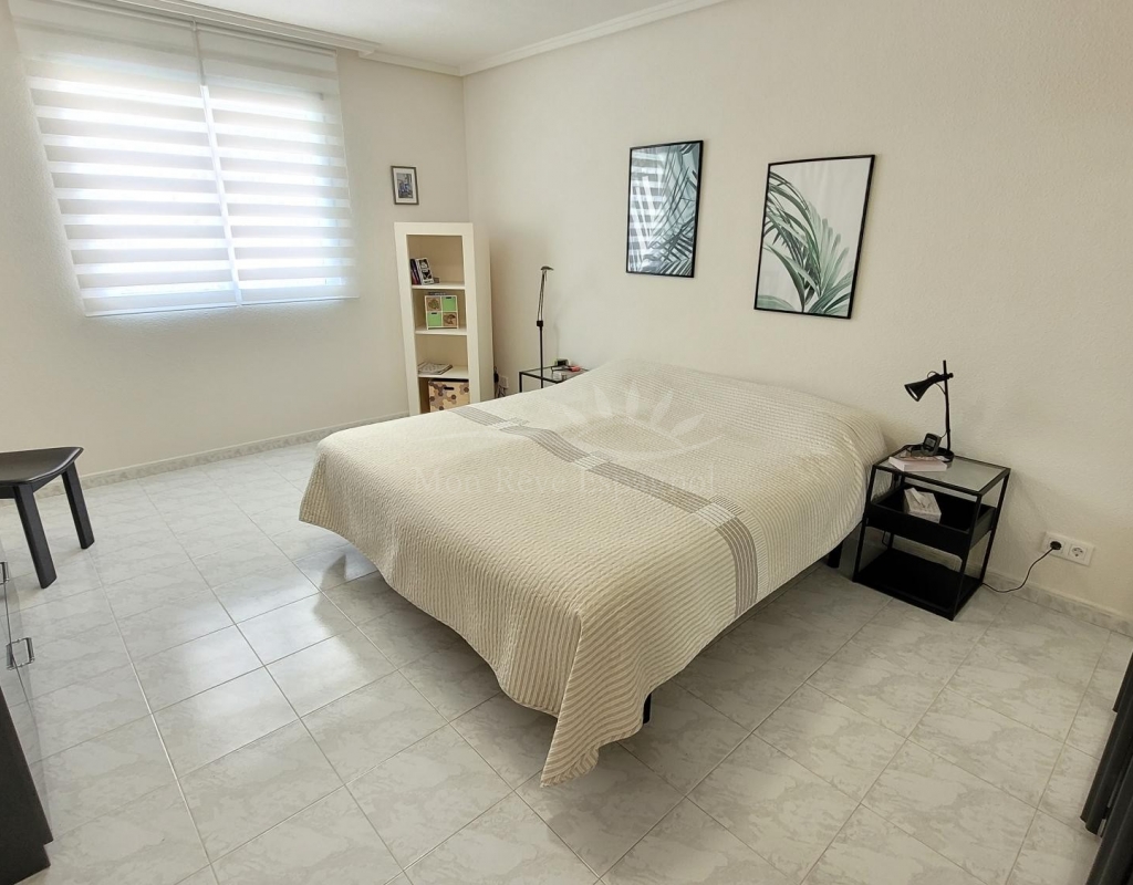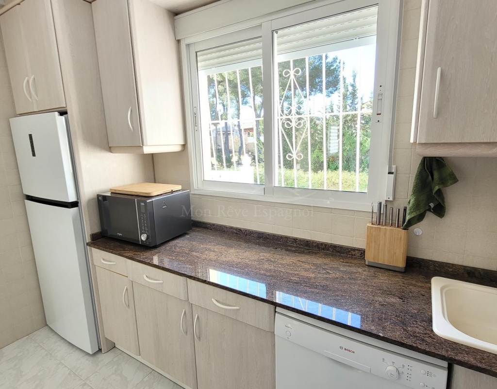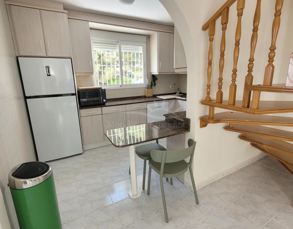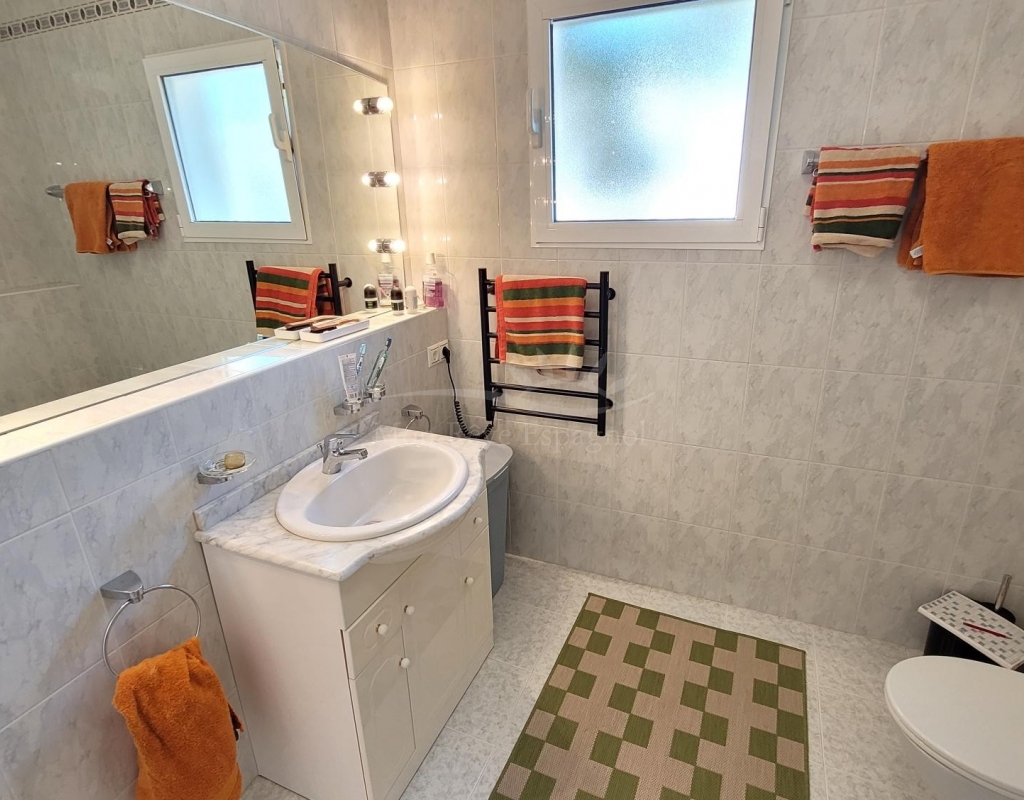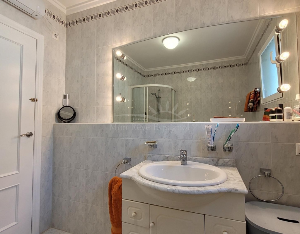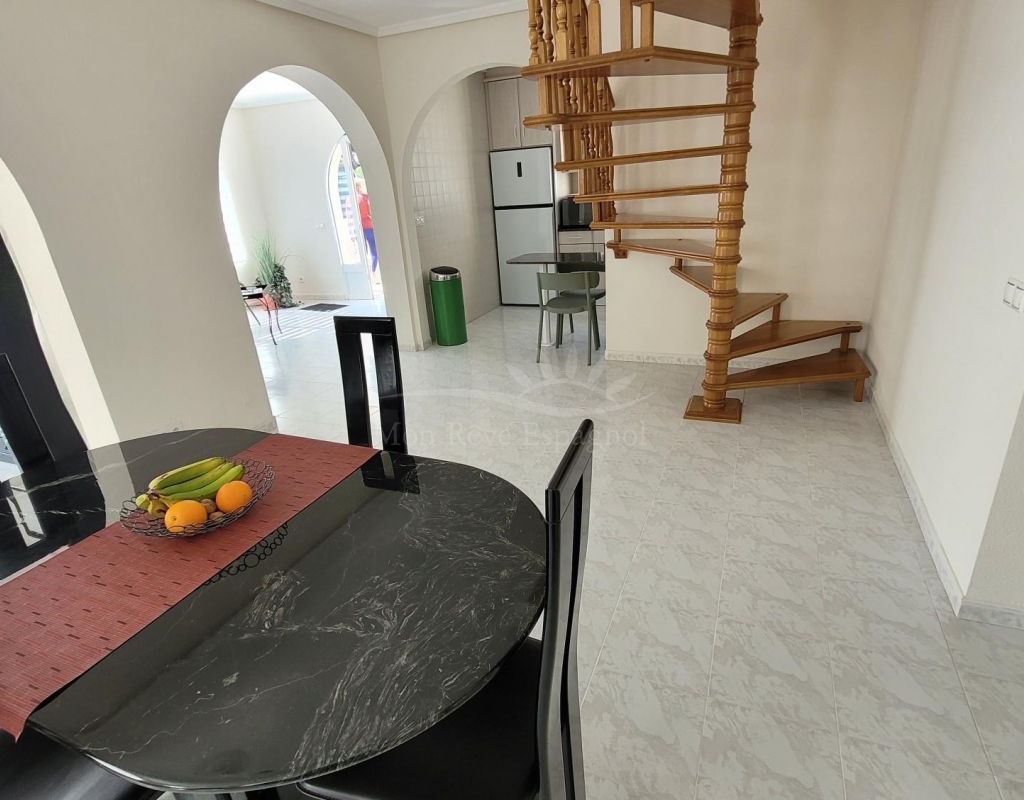 On the ground floor, the property offers an entrance hall, a bright living room with fireplace, a spacious dining area, a fully equipped semi-open kitchen, two bedrooms with fitted wardrobes, and a complete bathroom. From the living room, a staircase leads to the upper floor, where you will find the master bedroom, a dressing room, a bathroom, and a large private terrace.