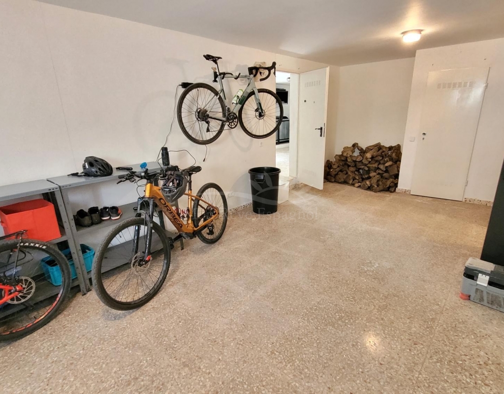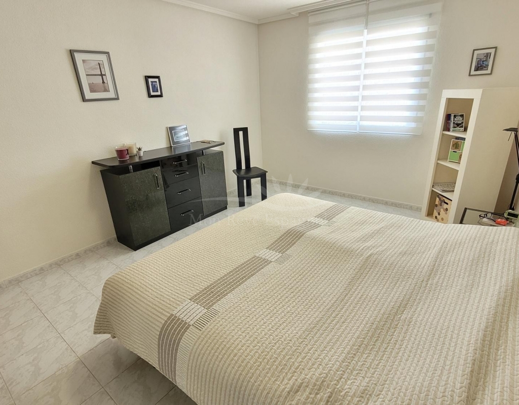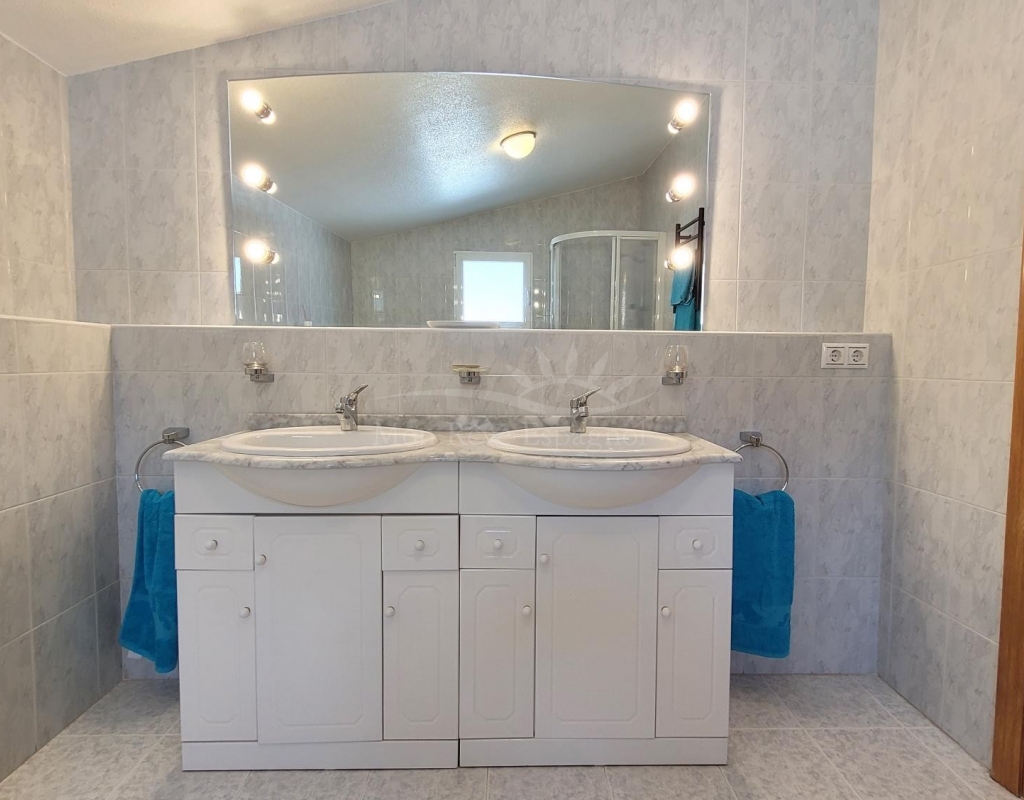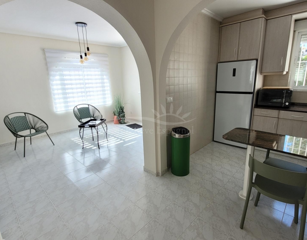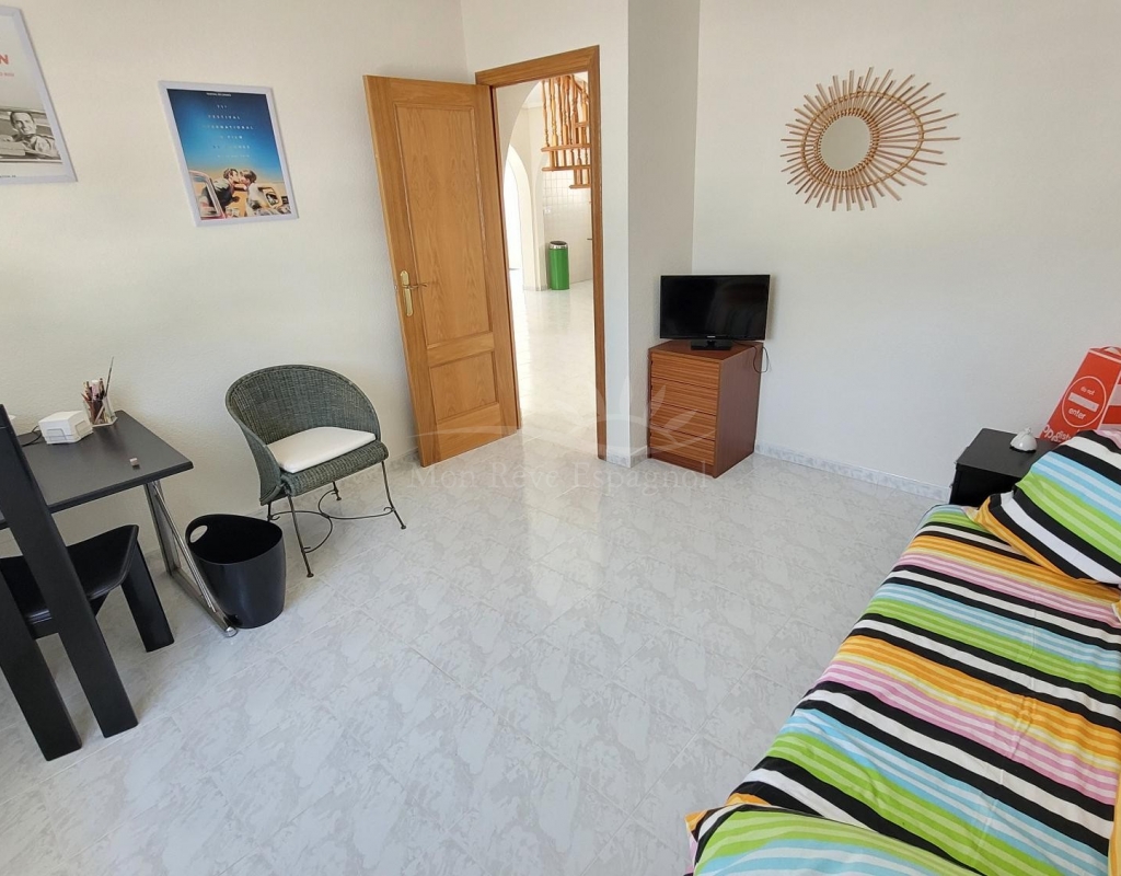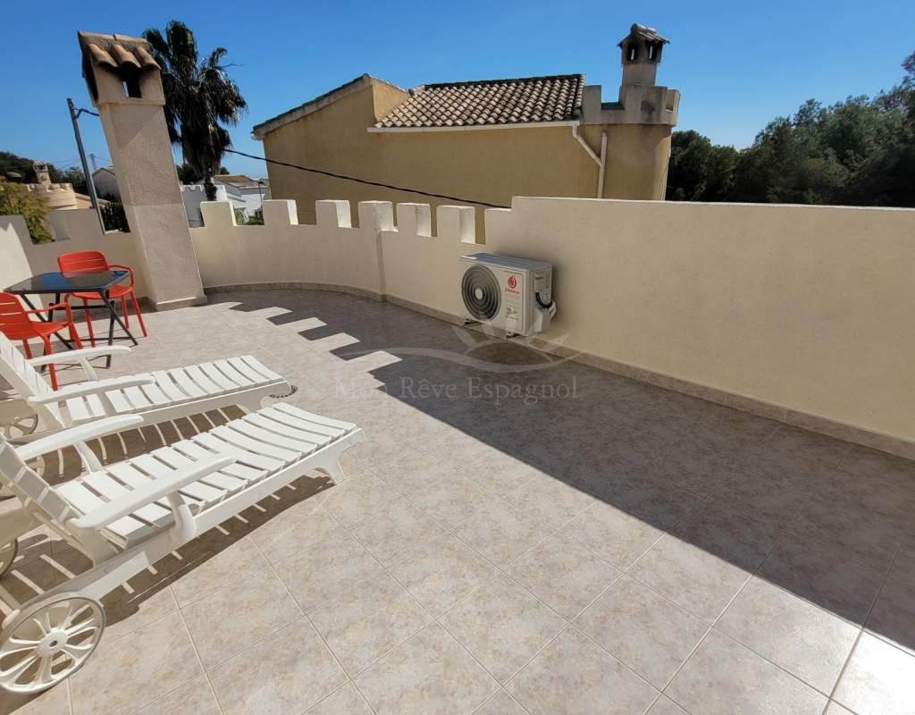 On the ground floor, the property offers an entrance hall, a bright living room with fireplace, a spacious dining area, a fully equipped semi-open kitchen, two bedrooms with fitted wardrobes, and a complete bathroom. From the living room, a staircase leads to the upper floor, where you will find the master bedroom, a dressing room, a bathroom, and a large private terrace.