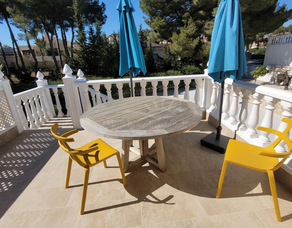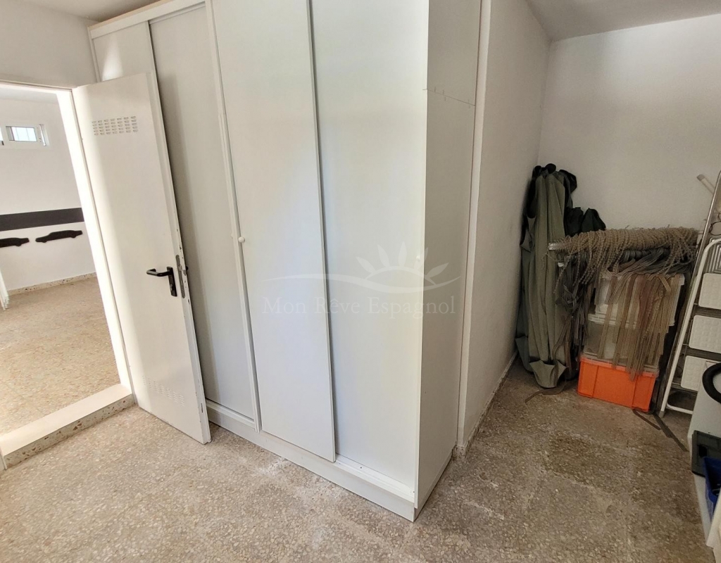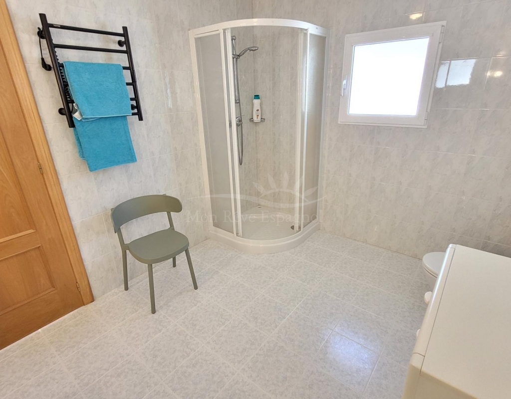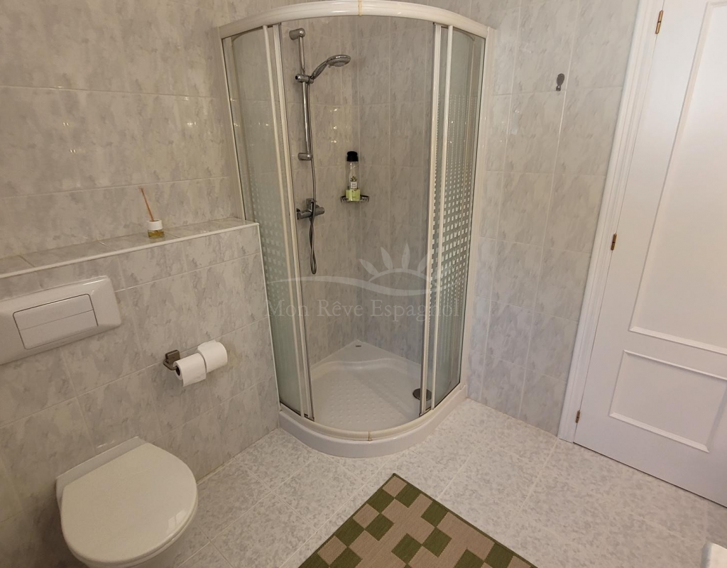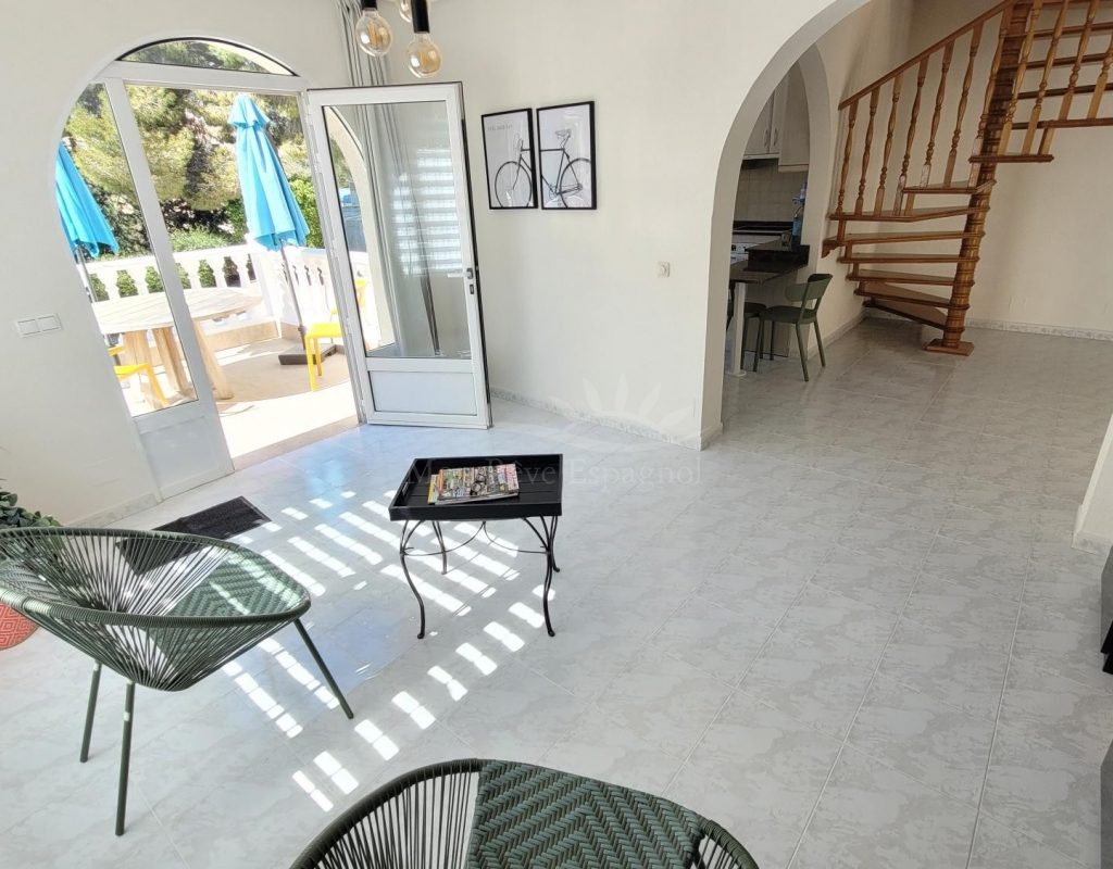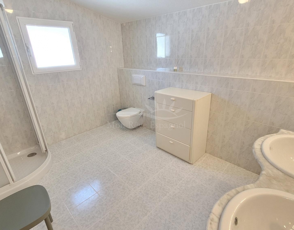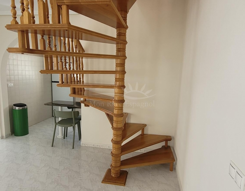 On the ground floor, the property offers an entrance hall, a bright living room with fireplace, a spacious dining area, a fully equipped semi-open kitchen, two bedrooms with fitted wardrobes, and a complete bathroom. From the living room, a staircase leads to the upper floor, where you will find the master bedroom, a dressing room, a bathroom, and a large private terrace.