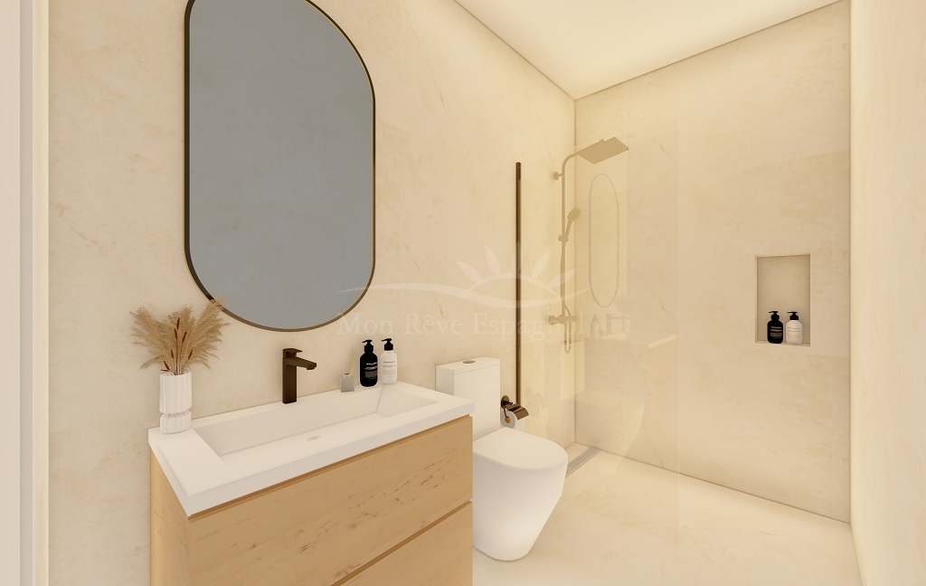 - Salles de bains entièrement équipées : WC suspendu, parois de douche, meuble vasque + miroir éclairé, douche à effet pluie