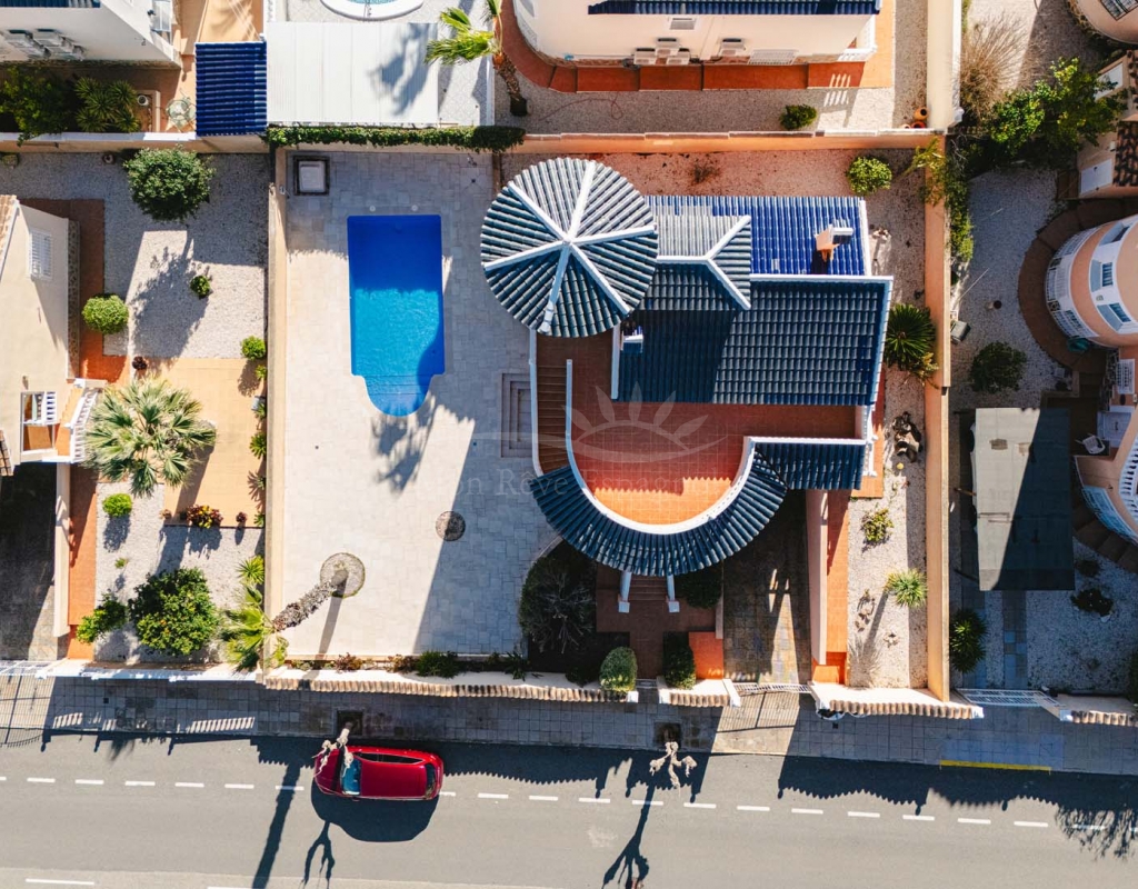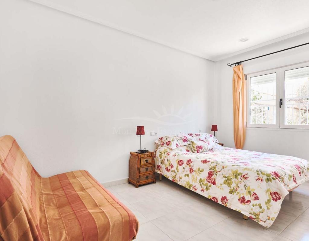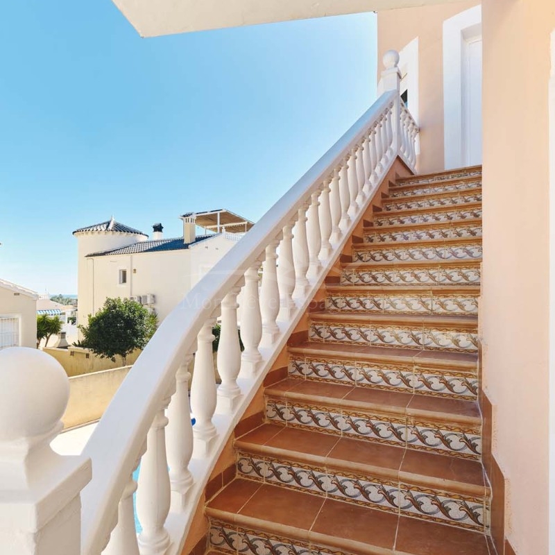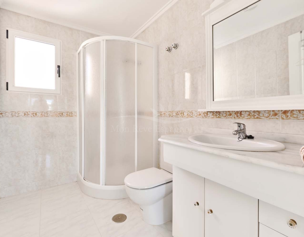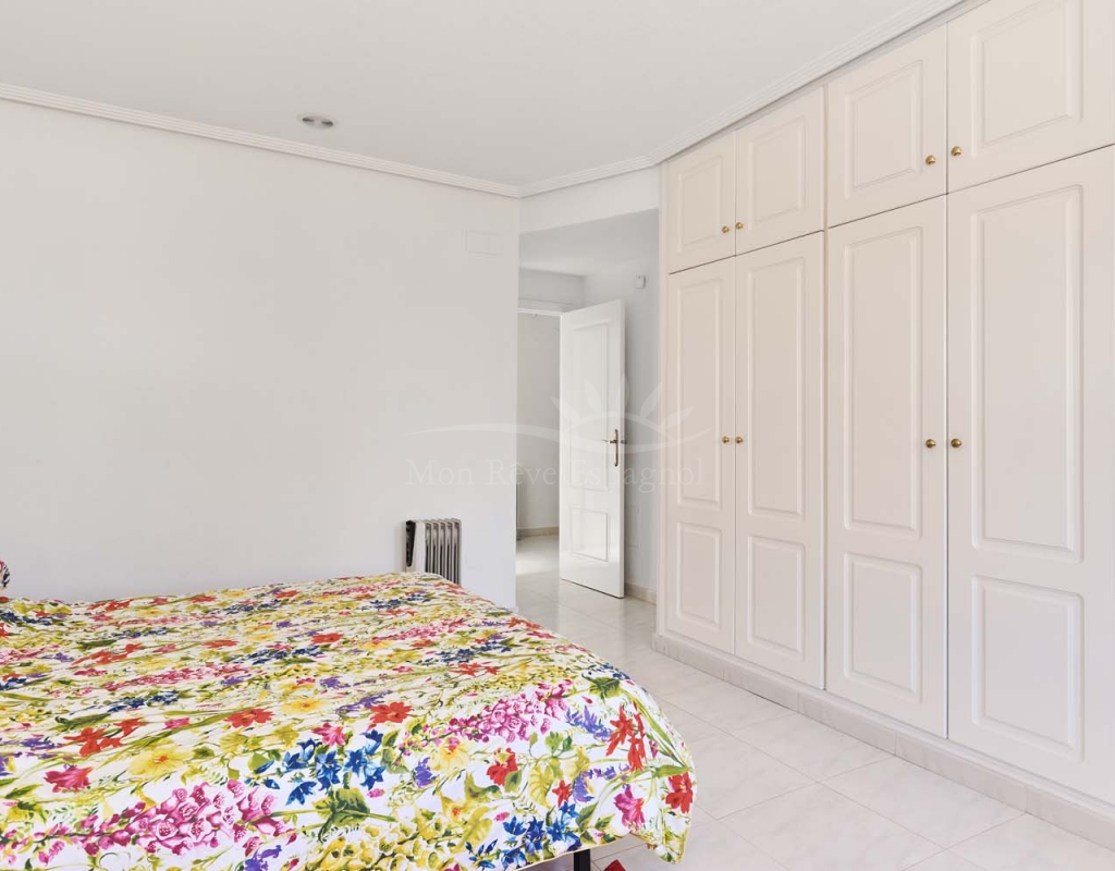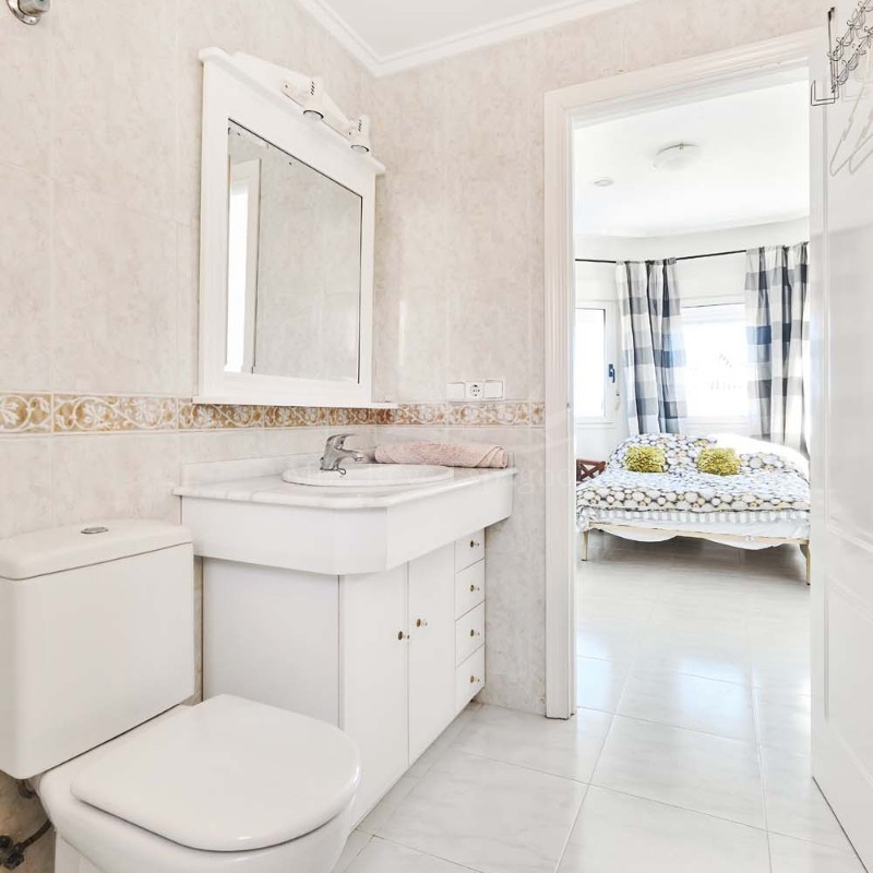 Un punto destacado de esta propiedad es su dormitorio de invitados con baño en suite, ubicado en la primera planta, al que se accede por una escalera exterior lateral. Este dormitorio tiene acceso a un amplio solárium privado con impresionantes vistas al mar. En la misma planta se encuentra un práctico trastero, que muchas propiedades vecinas han reconvertido con éxito en un dormitorio adicional, lo que ofrece la posibilidad de ampliar la superficie habitable y aumentar el valor de la propiedad.